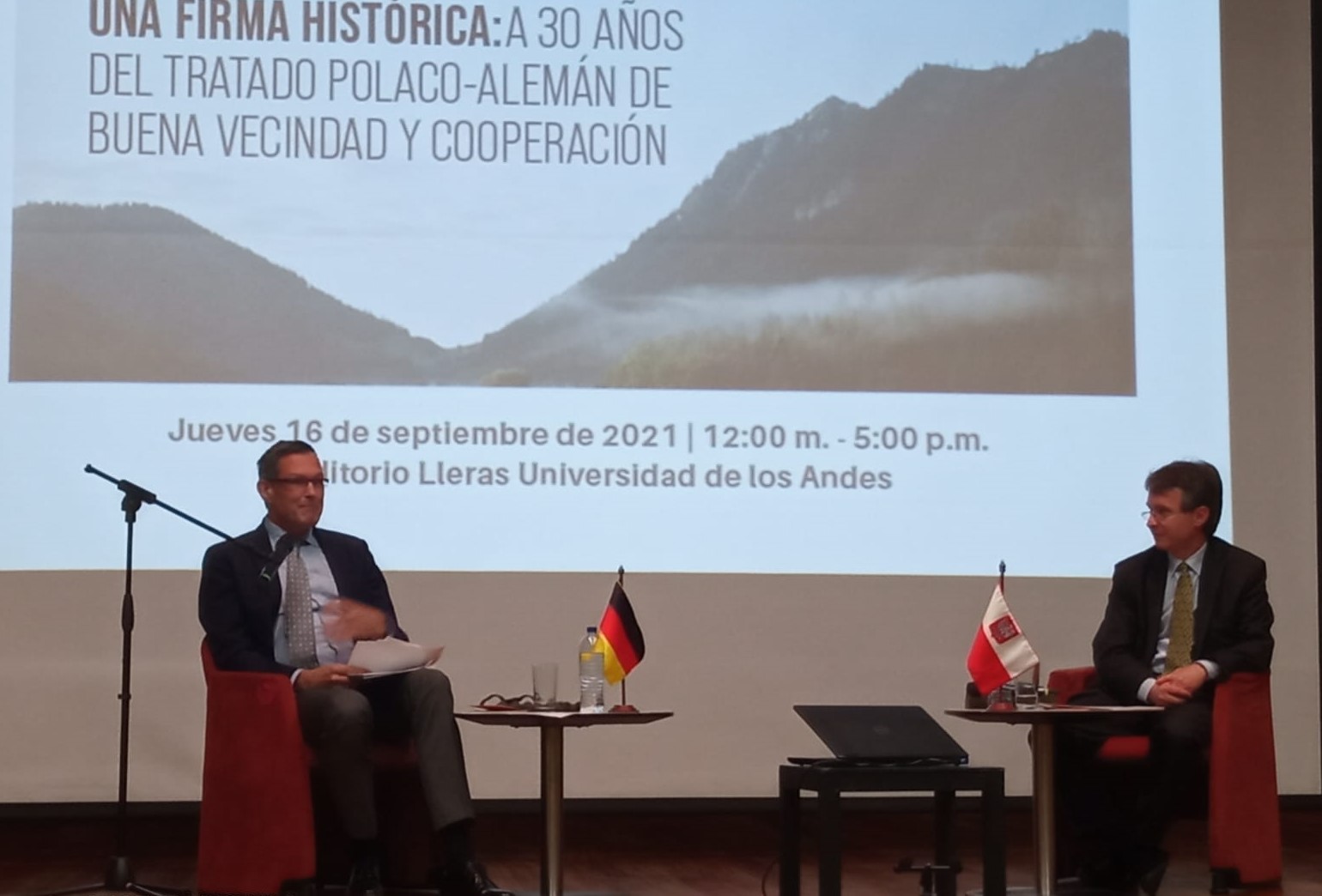 W tym roku obchodzimy 30. rocznicę podpisania Traktatu między Rzecząpospolitą Polską a Republiką Federalną Niemiec o dobrym sąsiedztwie i przyjaznej współpracy. Z tej okazji Ambasadorowie Polski i Niemiec w Kolumbii, Paweł Woźny i Peter Ptassek, uczestniczyli 16 września w dyskusji na Universidad de los Andes, moderowanej przez prof. Víctora Mijaresa z Wydziału Nauk Politycznych. Omówili tematy stosunków polsko-niemieckich, kontekst polityczny Traktatu i jego znaczenie dla współpracy obu krajów, zarówno dwustronnej, jak i w ramach Unii Europejskiej i NATO. Podkreślili wagę procesu pojednania między obydwoma krajami, opartego na konstruktywnym dialogu i uznaniu prawdy historycznej, który może być przykładem dla procesu pokojowego w Kolumbii.