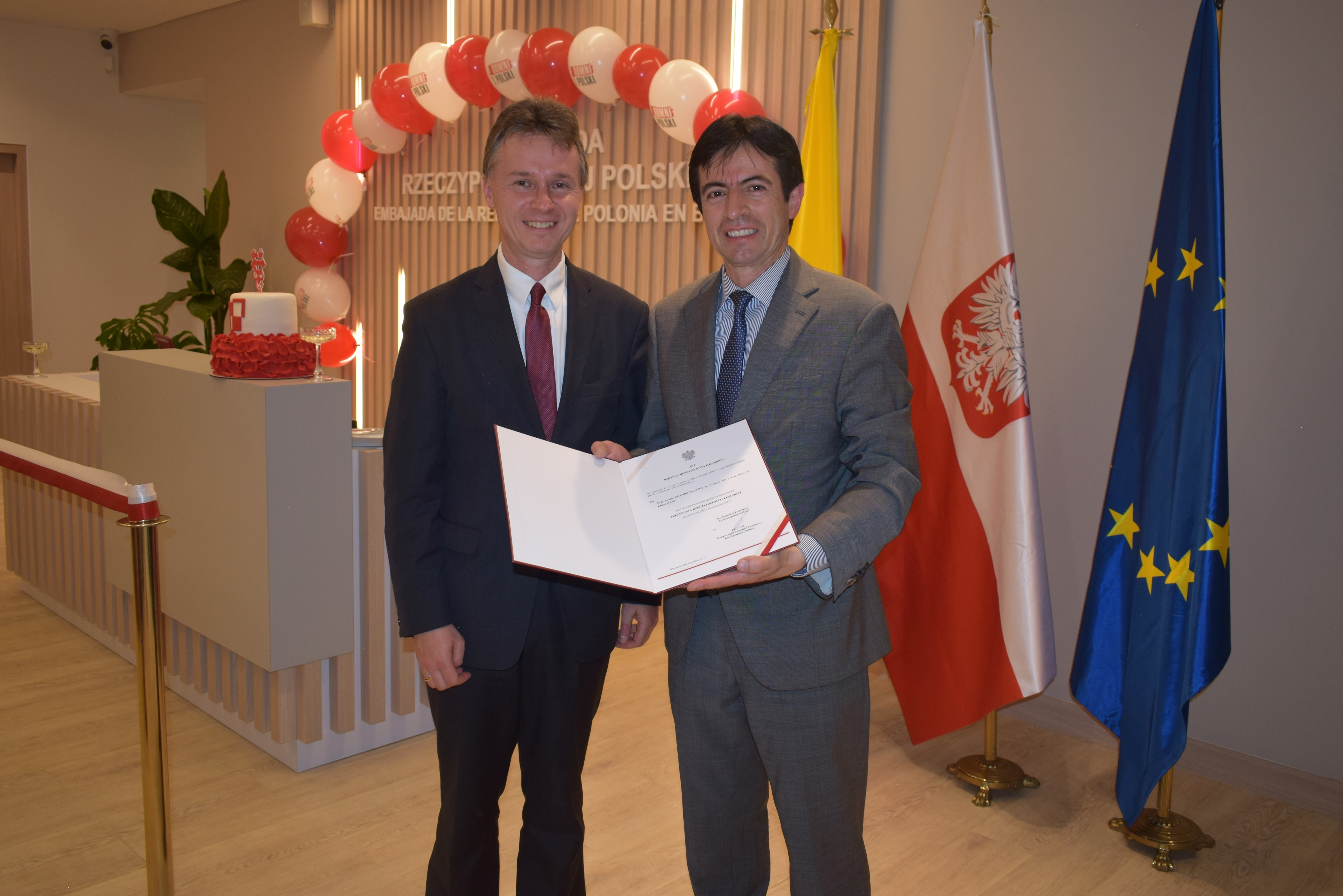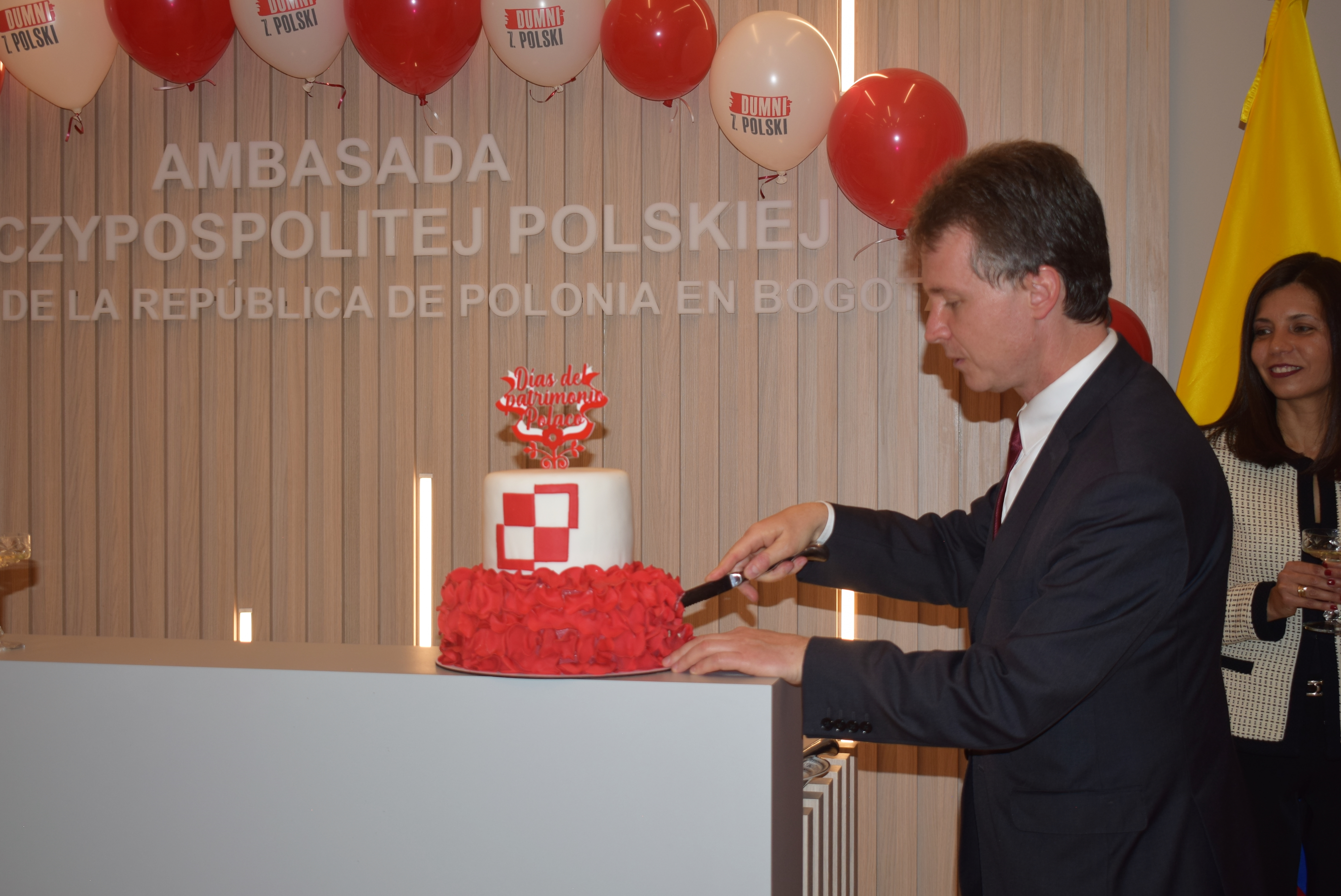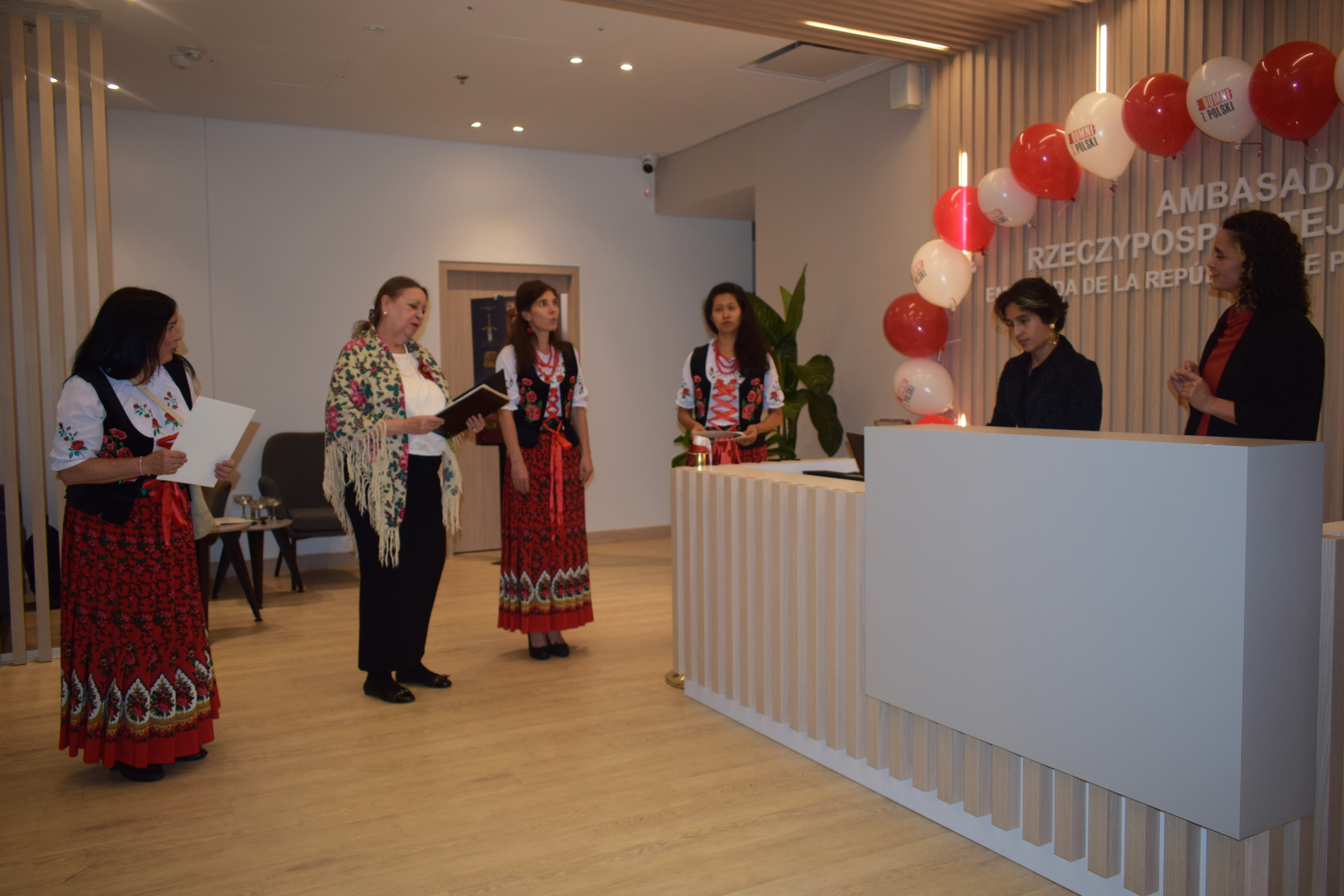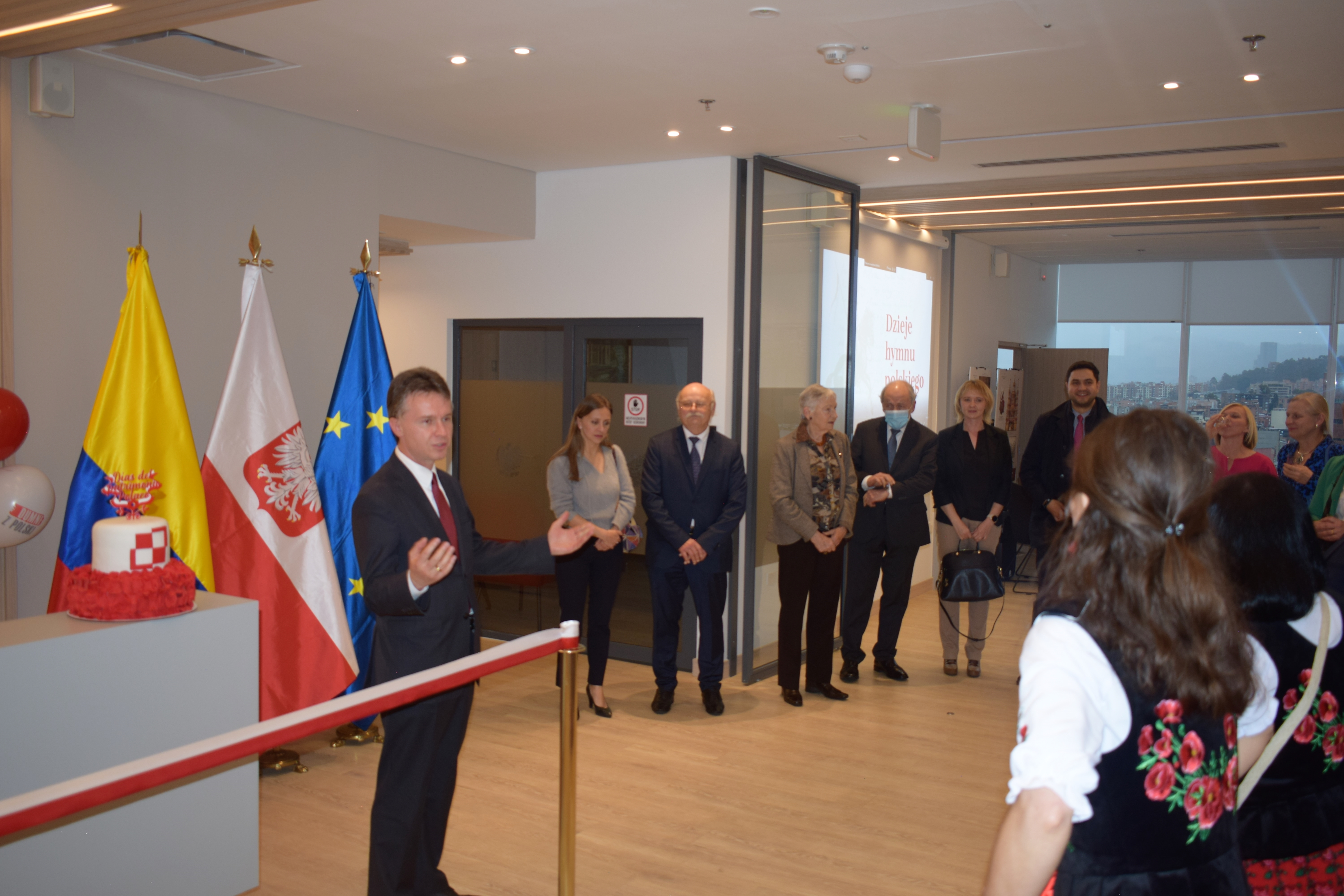 W uroczystości wzięli udział członkowie lokalnej Polonii oraz przedstawiciele instytucji kolumbijskich. Ambasador Paweł Woźny w swoim przemówieniu wyraził uznanie dla pracy osób, które przyczyniły się do urządzenia nowego biura oraz potwierdził gotowość kontynuowania przez Ambasadę działań na rzecz rozwijania stosunków polsko-kolumbijskich oraz promocji kultury polskiej. W tym kontekście podkreślił kluczową rolę Polaków mieszkających w Kolumbii oraz znaczenie współpracy Ambasady i Polonii. Po części oficjalnej spotkania, uczestnicy zostali zaproszeni do obejrzenia wystawy „Skarby Krakowa” oraz filmu „Historia hymnu polskiego”, a także do wysłuchania polskich pieśni patriotycznych i ludowych w wykonaniu grupy wokalnej Amapolki. Goście mieli również możliwość skosztowania typowych polskich wyrobów cukierniczych.