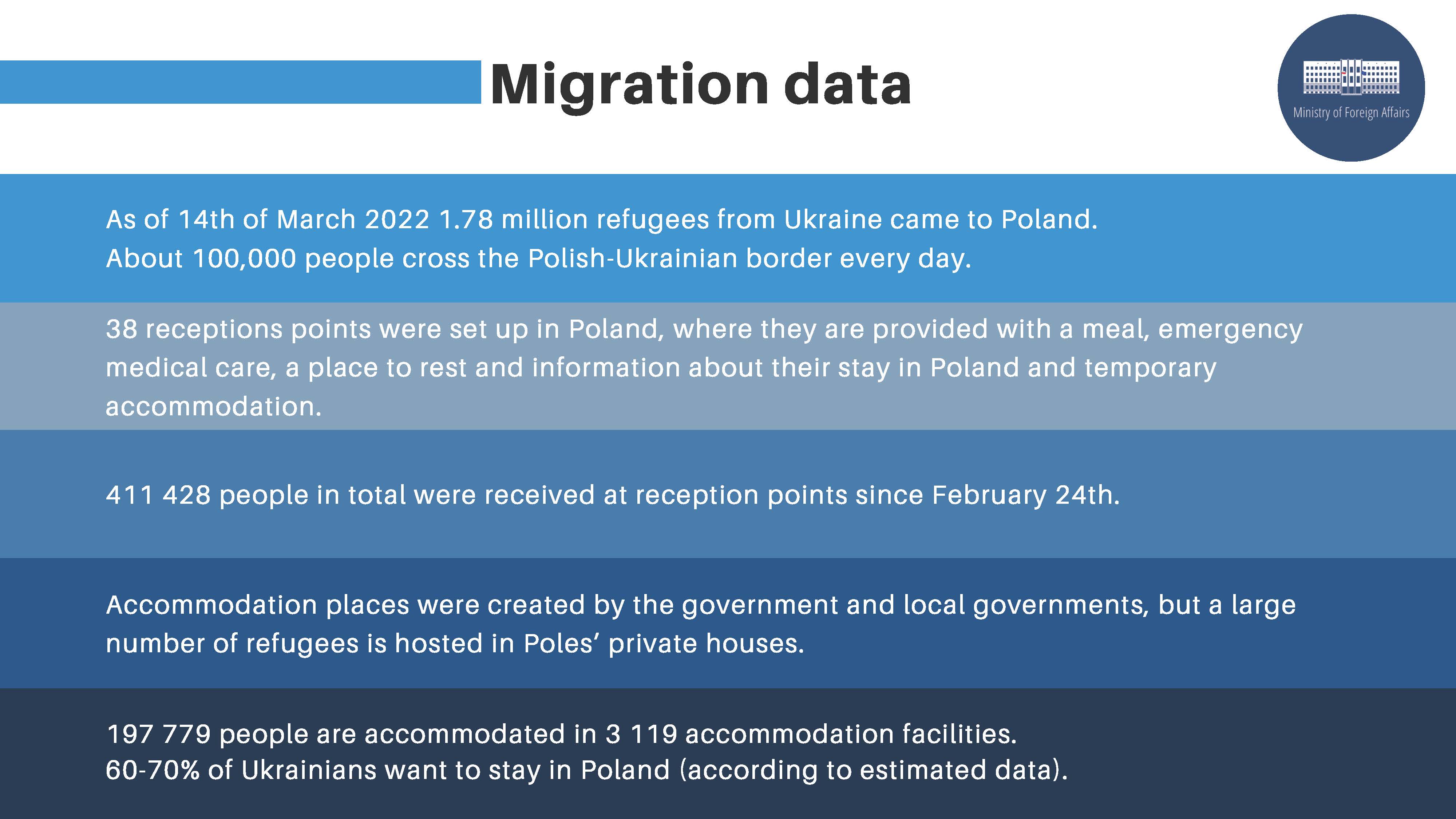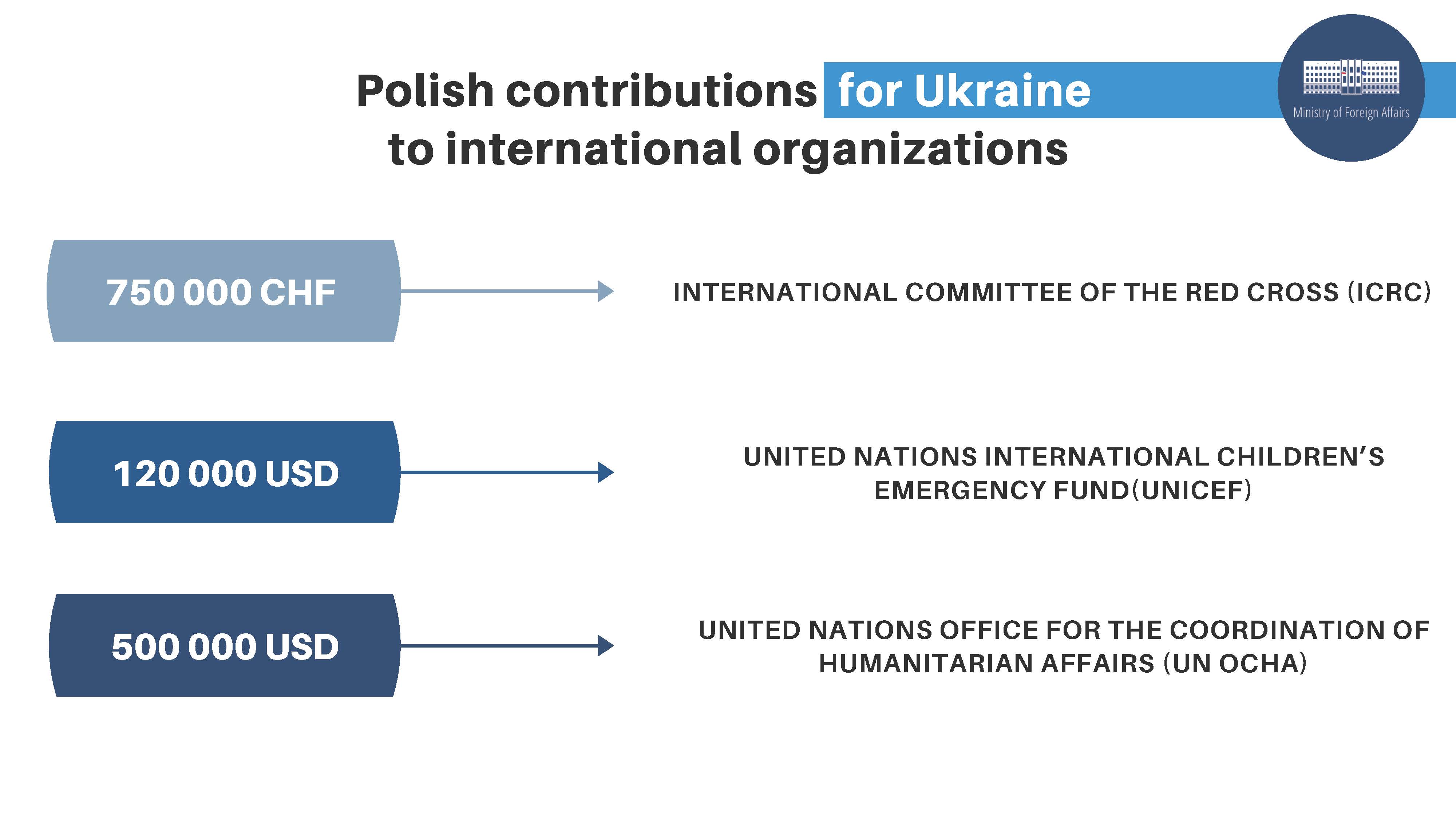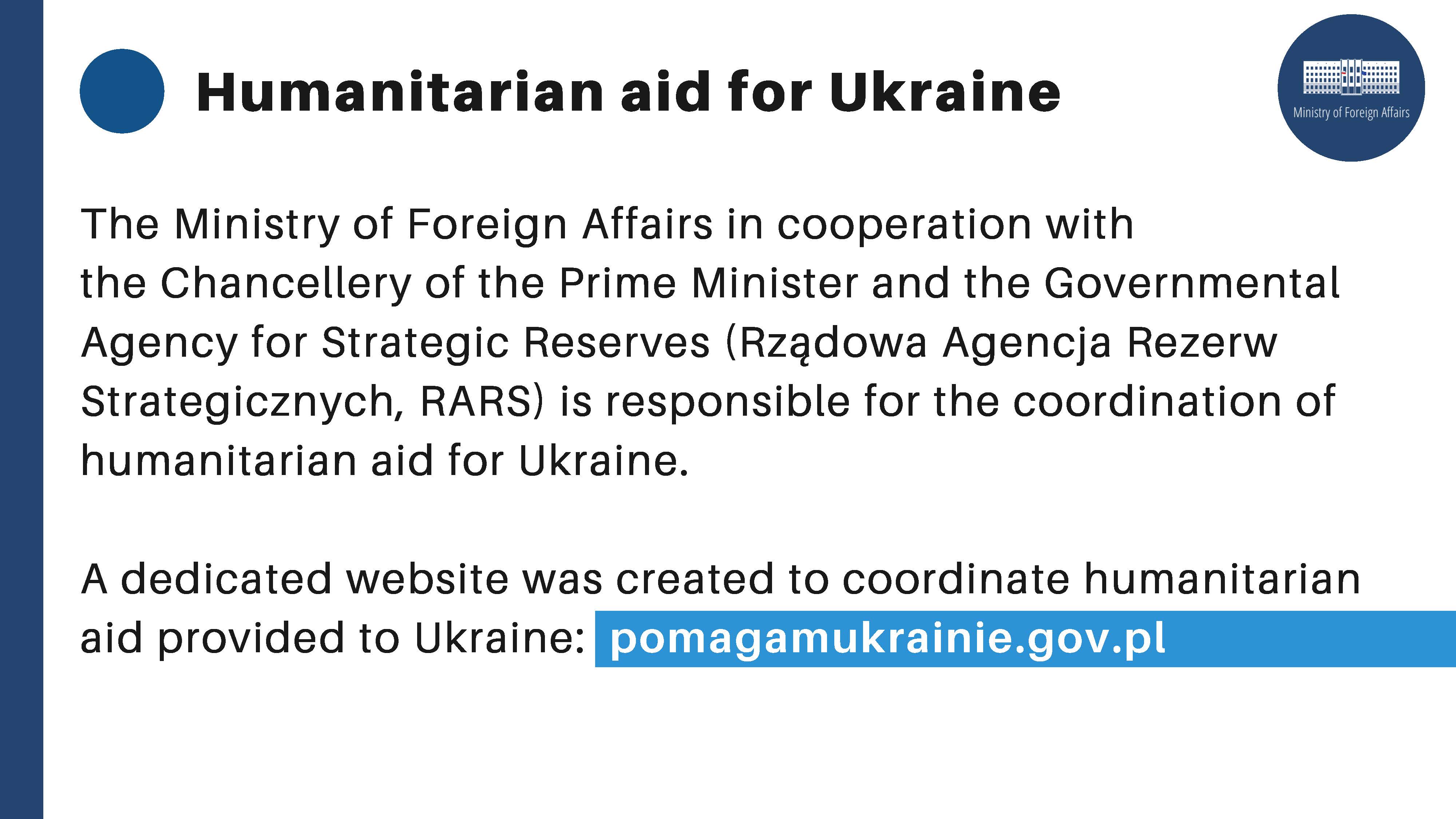 Ministerstwo Spraw Zagranicznych we współpracy z Kancelarią Prezesa Rady Ministrów i Rządową Agencją Rezerw Strategicznych RARS odpowiadają za koordynację pomocy humanitarnej dla Ukrainy na terenie Polski.