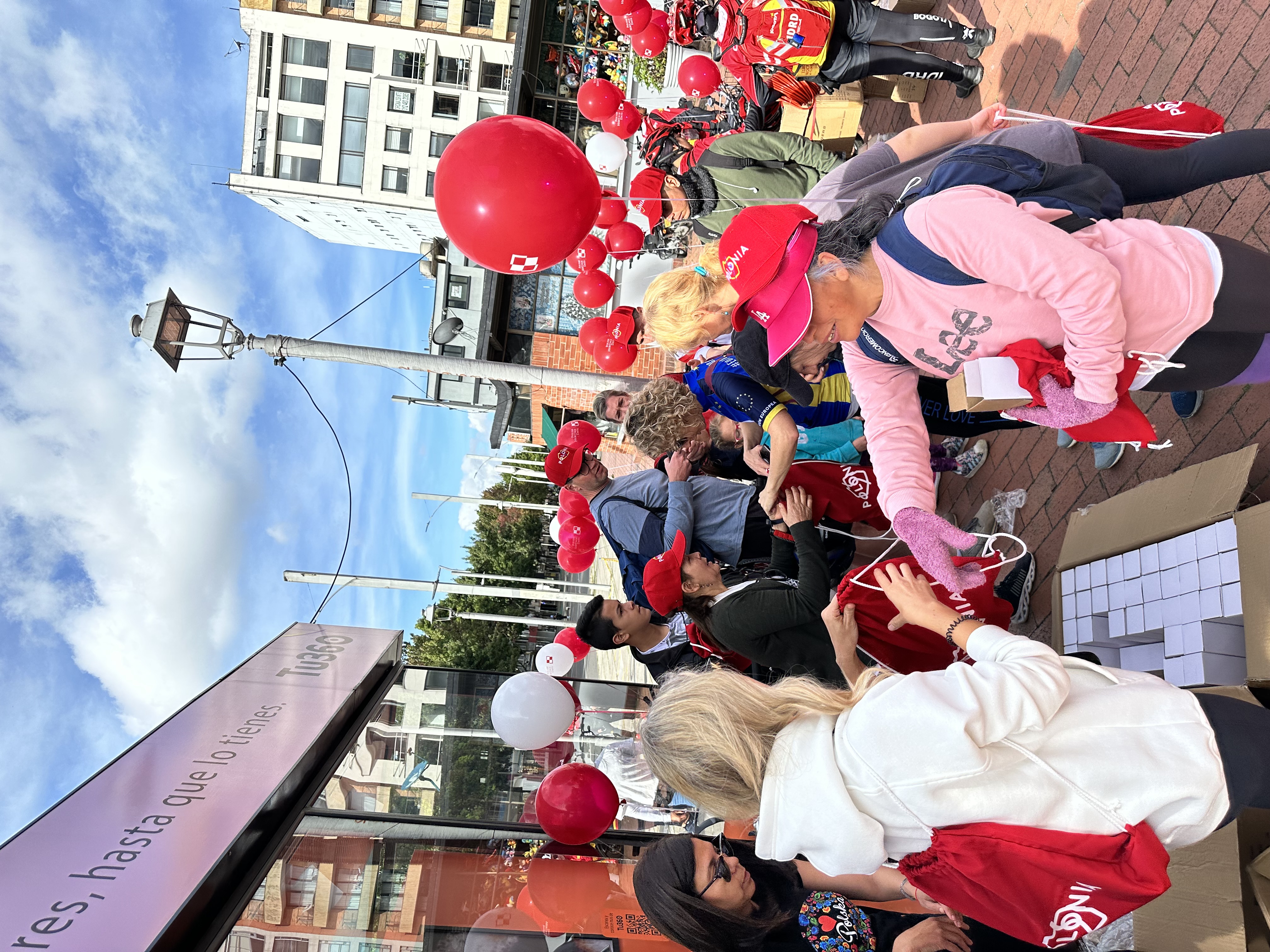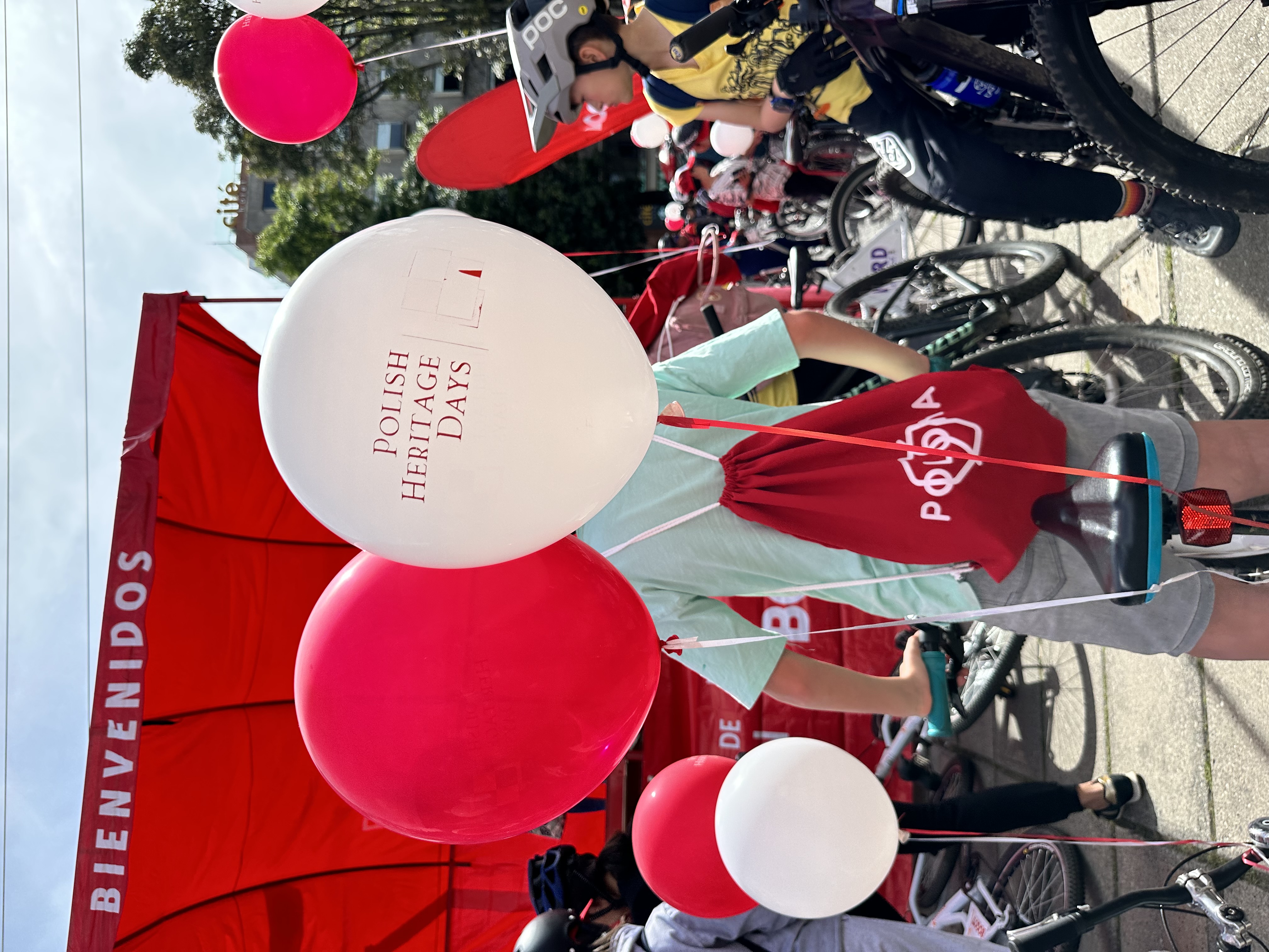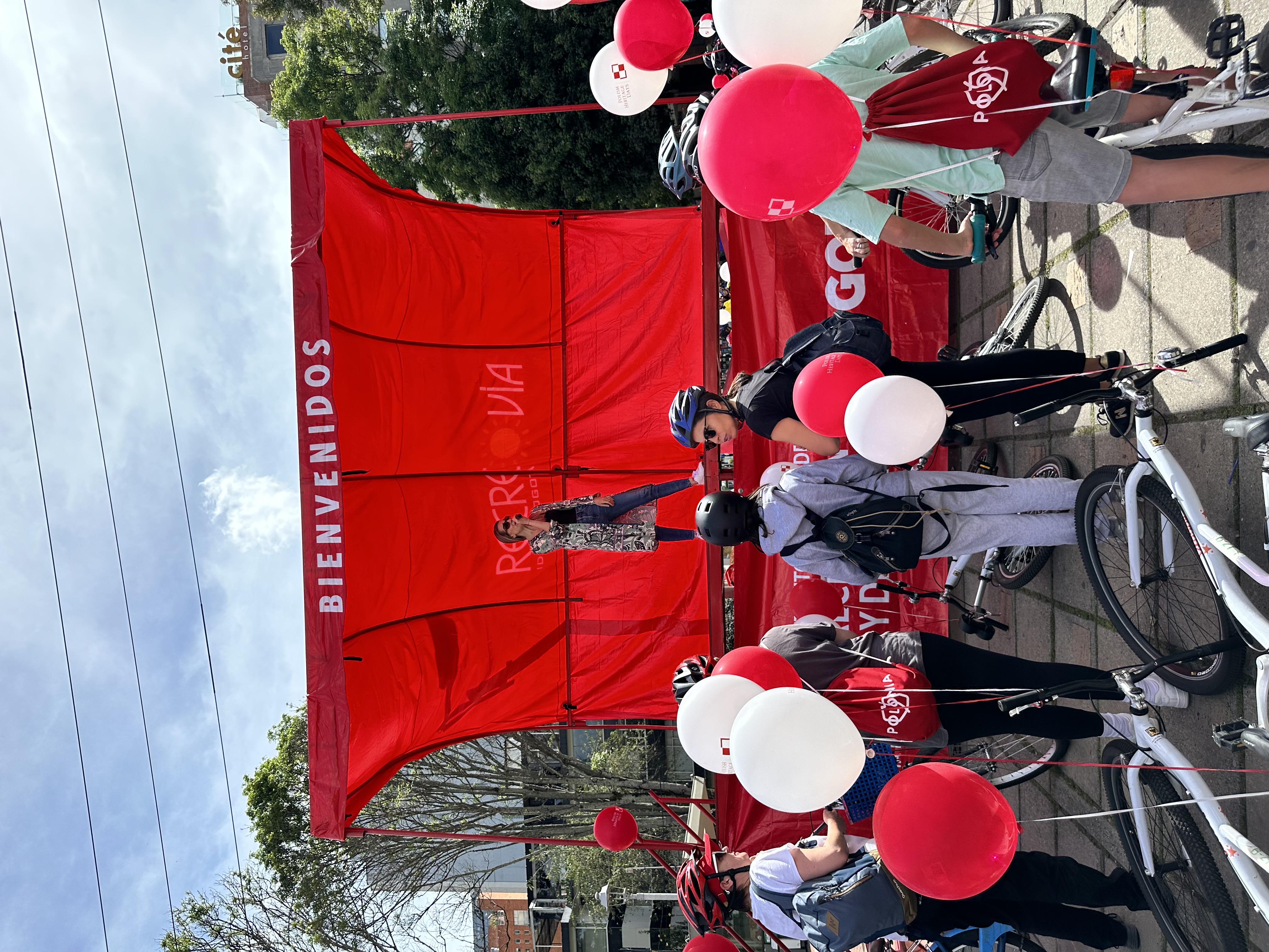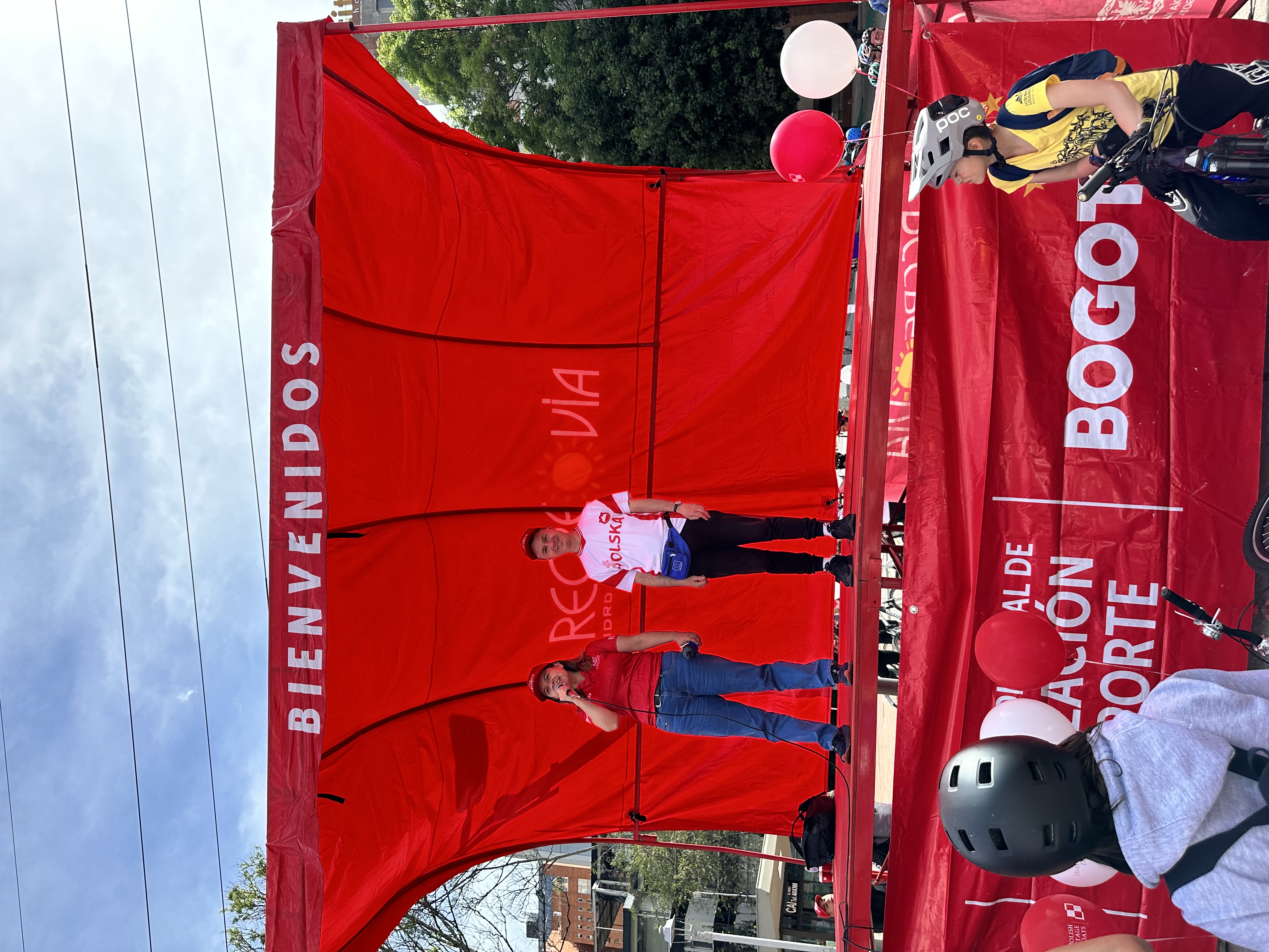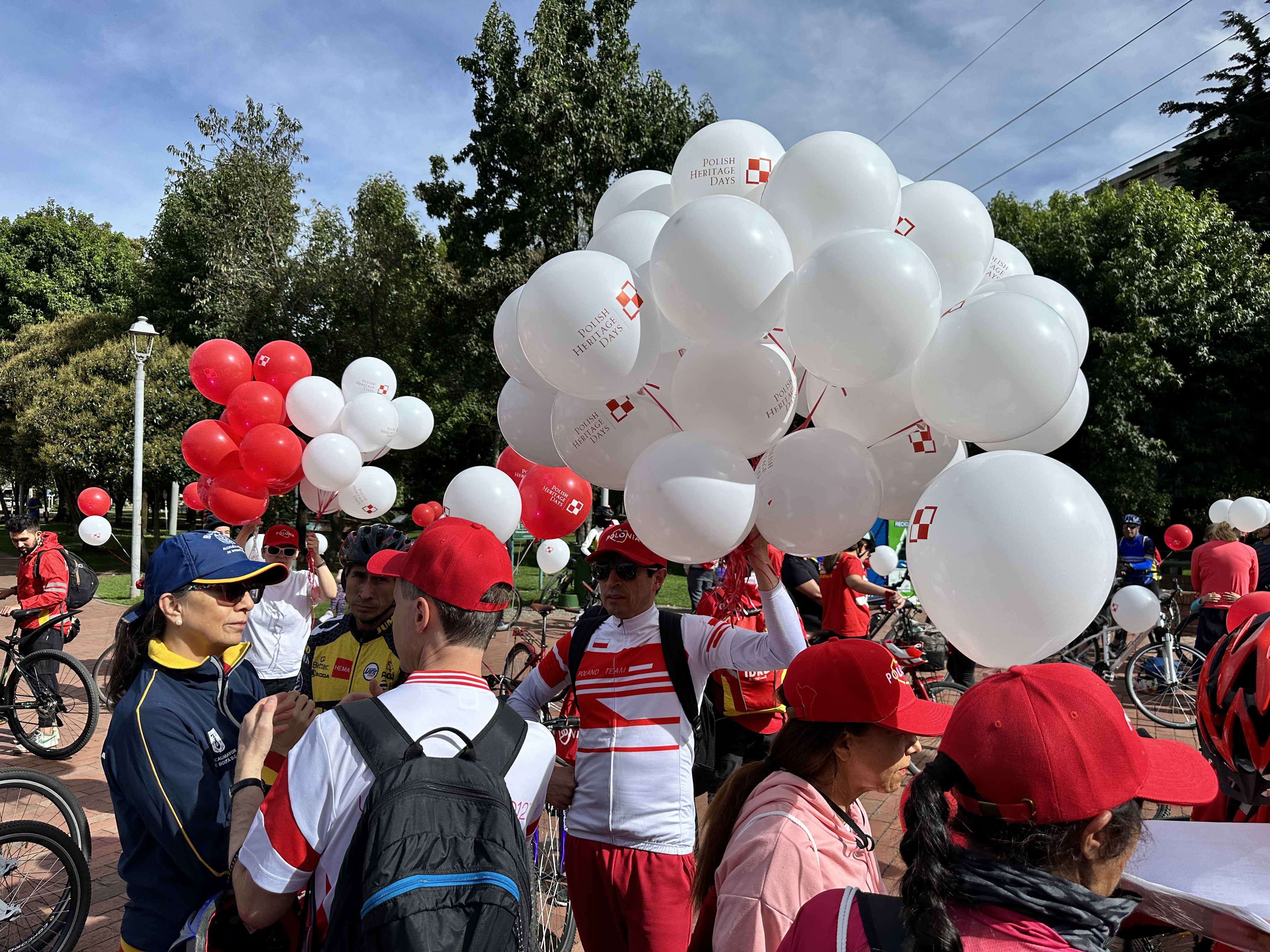 Uczestnicy spotkania zostali powitani przez Ambasadora P. Woźnego i panią dyrektor Okręgowego Instytutu Rekreacji i Sportu, otrzymali ufundowane przez Ambasadę pamiątkowe czapki, plecaki oraz biało-czerwone balony z logo Polish Heritage Days. Pan Leszek Sibilski – pomysłodawca Światowego Dnia Roweru - przekazał do wręczenia uczestnikom kolumbijskich obchodów 100 bidonów z logo tej inicjatywy.