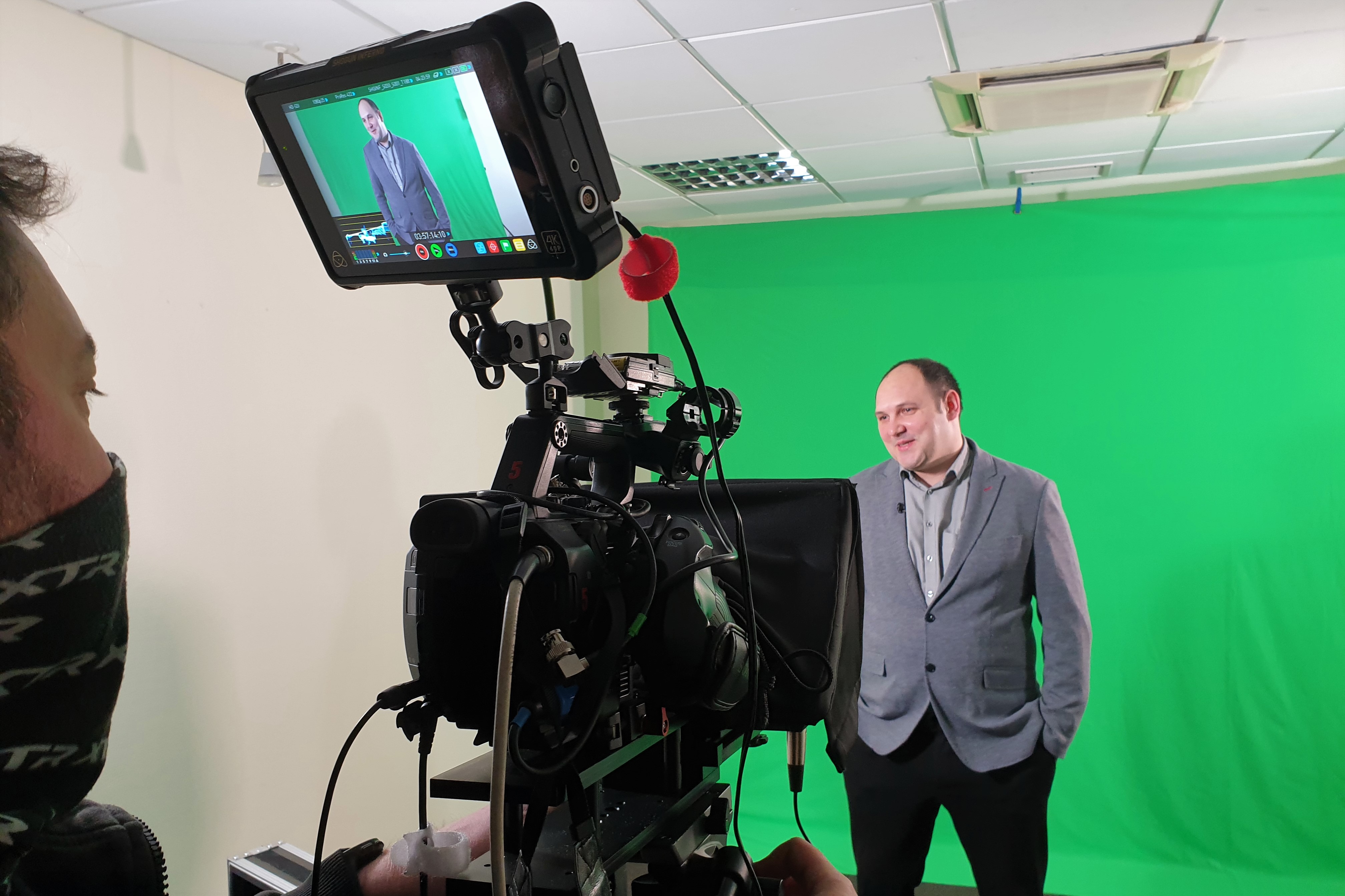 Elegancko ubrany mężczyzna na zielonym tle podczas nagrywania