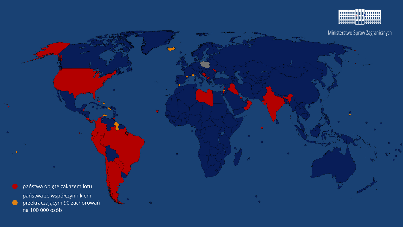 Mapa przedstawia 32 państwa (kolor czerwony), które są objęte zakazem lotu zgodnie z rozporządzeniem oraz destynacje, które wg stanu na 26 października br. zawierają współczynnik powyżej 90 (kolor pomarańczowy) – bez państw UE i EOG, strefy Schengen, Ukrainy i krajów, które notyfikowały Polsce wprowadzenie rozwiązań zapewniających, że na pokład samolotów nie zostaną wpuszczone osoby zakażone Covid-19. Przy utrzymującej się wzrostowej tendencji zachorowalności, niewykluczone, że wykaz zostanie rozszerzony o ww. państwa/terytoria.