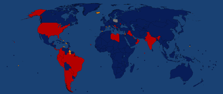 Mapa przedstawia 28* państw (kolor czerwony), które są objęte zakazem lotu zgodnie z rozporządzeniem oraz destynacje, które wg stanu na 28 września br. zawierają współczynnik powyżej 90 (kolor pomarańczowy). Przy utrzymującej się wzrostowej tendencji zachorowalności, niewykluczone, że wykaz zostanie rozszerzony o ww. państwa/terytoria.