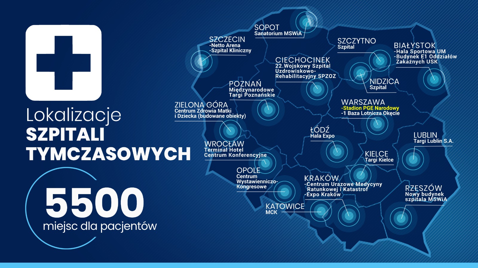 W każdym województwie powstanie przynajmniej jeden szpital rezerwowy dla pacjentów z COVID-19. Większość z nich zostanie oddana do użytku między 15 a 30 listopada. Dzięki tym działaniom baza łóżek szpitalnych dla pacjentów zakażonych koronawirusem zwiększy się o ponad 5 tys. miejsc. Większość szpitali rezerwowych powstanie w centrach kongresowo-wystawienniczych i halach sportowych. Nie będą to obiekty, które obecnie są wykorzystywane przez służbę zdrowia. Koszt adaptacji obiektów (nie wliczając sprzętu) wyniesie około 130 mln zł.