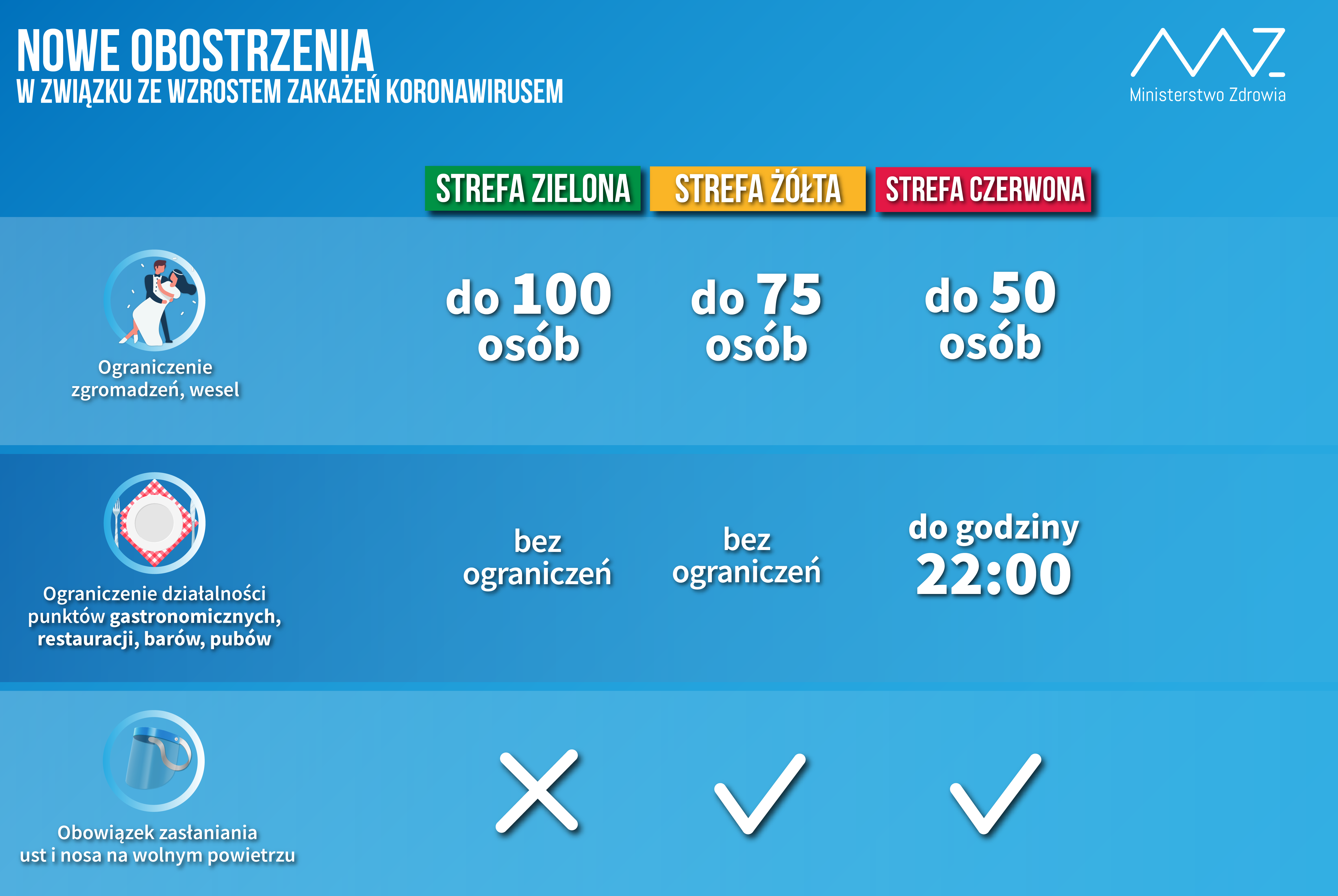 Szef resortu zdrowia przypomniał, że od tej soboty zaczyna obowiązywać nowy pakiet obostrzeń w strefach zielonej, żółtej i czerwonej, który wprowadza limity liczby osób biorących udział w zgromadzeniach, w tym w przyjęciach rodzinnych – w strefie zielonej do 100 osób, w strefie żółtej do 75 osób. Natomiast w strefie czerwonej pozostanie ograniczenie do 50 osób.