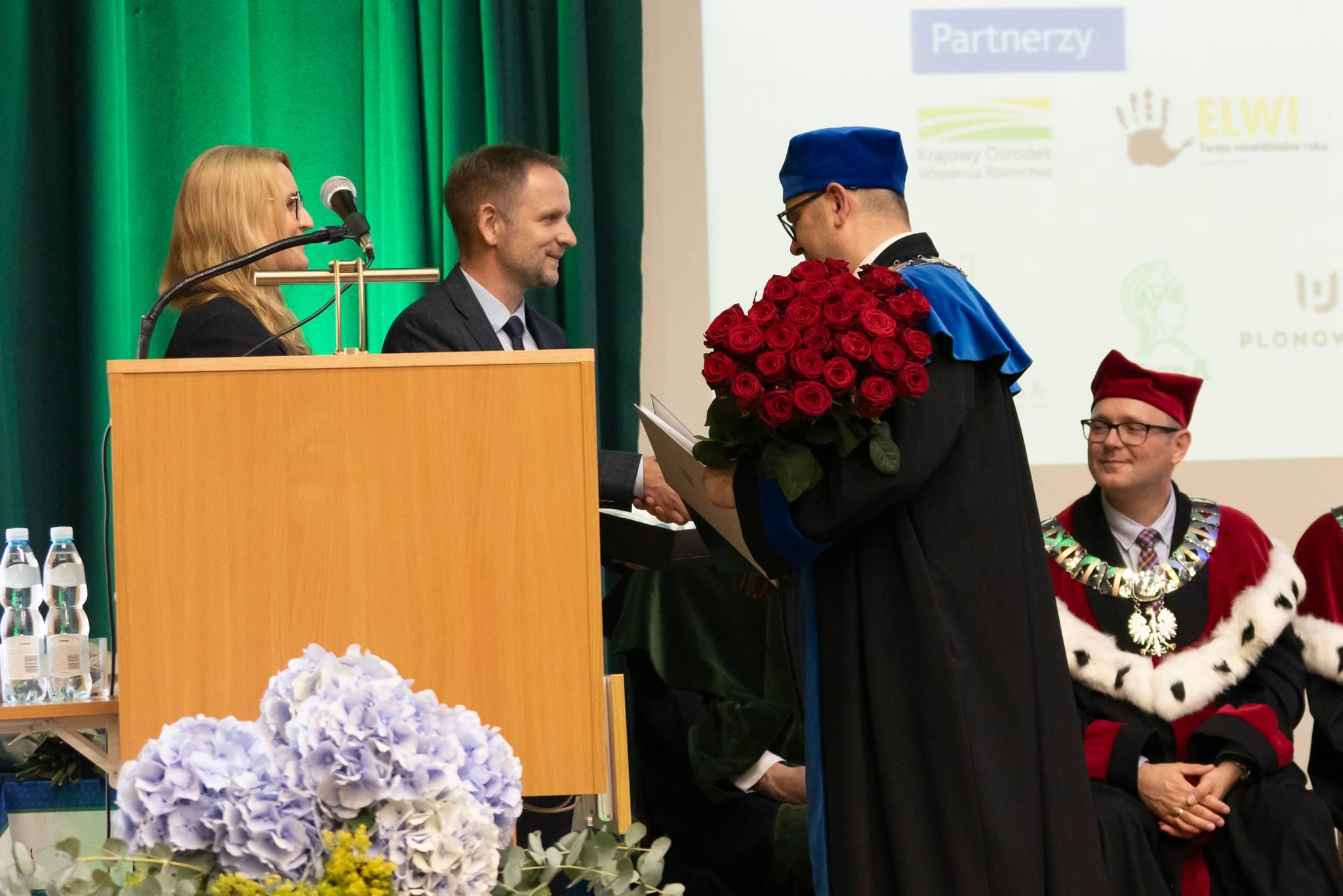 Podczas uroczystości Krajowy Ośrodek Wsparcia Rolnictwa reprezentowali: Justyna Jakubowicz-Dziduch Dyrektor OT KOWR w Szczecinie i Krzysztof Berest Z-ca Dyrektora którzy na ręce prof. dr. hab. inż. Arkadiusza Telesińskiego Dziekana Wydziału Kształtowania Środowiska i Rolnictwa złożyli jubileuszową statuetkę i list gratulacyjny.