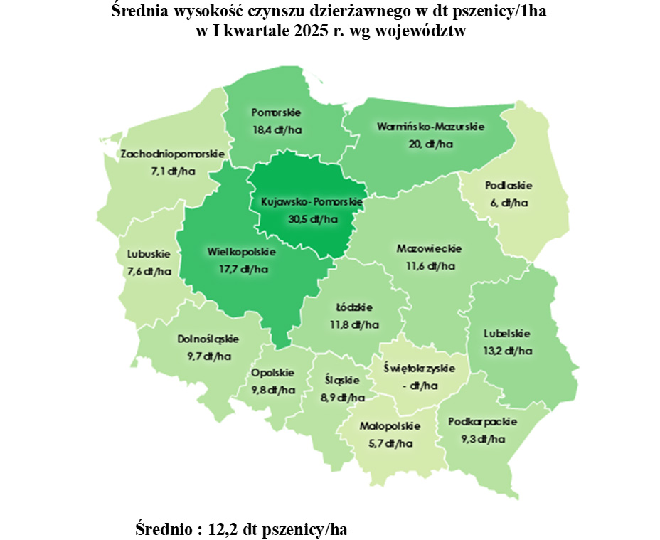 Najwyższe czynsze w 2025 r. uzyskano w województwie łódzkim - 36,8 dt/ha, następnie w kujawsko-pomorskim - 23,7 dt/ha, pomorskim – 19,3 dt/ha, podkarpackim – 18,3 dt/ha i w wielkopolskim - 17,8 dt/ha.