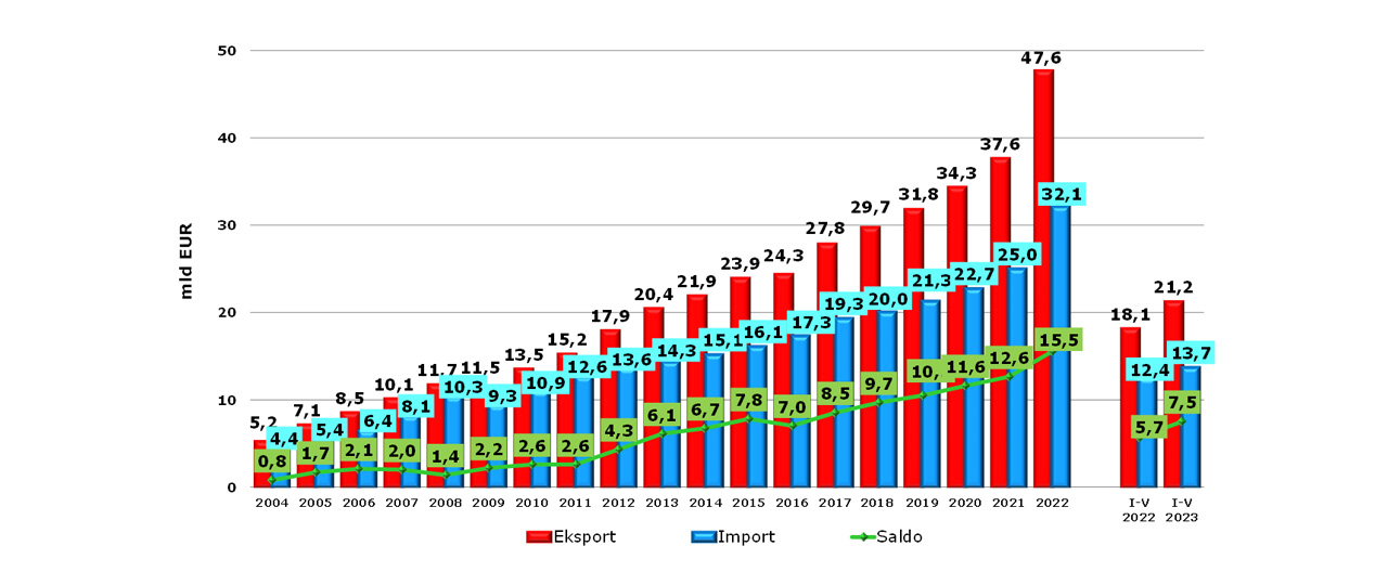 Jednocześnie import towarów rolno-spożywczych wyniósł 13,7 mld EUR (64,2 mld zł) i był o 10% wyższy niż przed rokiem. Szybsze tempo wzrostu wartości eksportu niż importu spowodowało duży wzrost dodatniego salda handlu zagranicznego, które w okresie styczeń–maj 2023 r. ukształtowało się na poziomie 7,5 mld EUR (35,3 mld zł), o 33% wyższym r/r.
