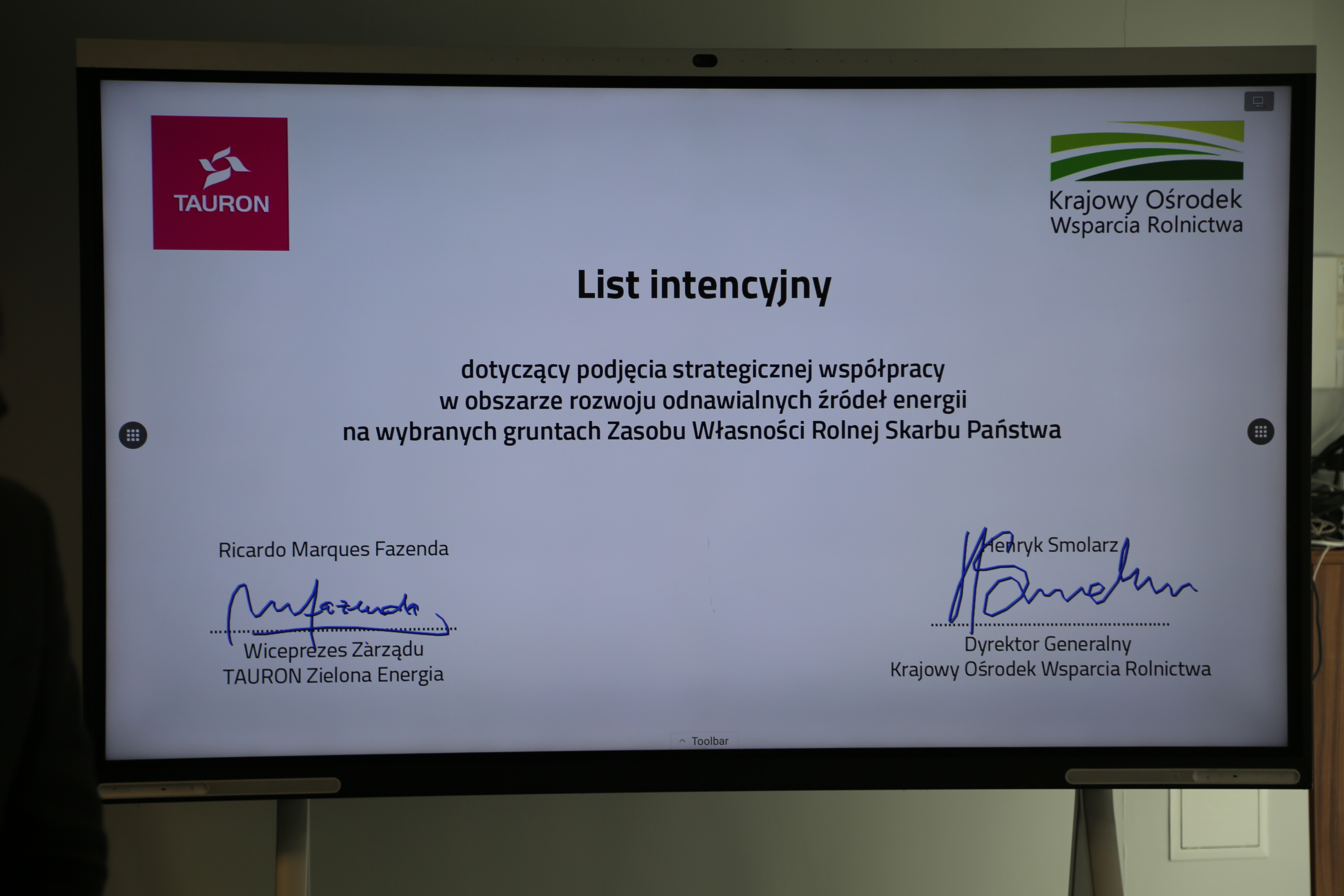 Krajowy Ośrodek Wsparcia Rolnictwa (KOWR) i TAURON Zielona Energia (TZE) w czasie wspólnej konferencji poinformowali o podpisaniu listu intencyjnego. Celem rozpoczętej współpracy jest realizacja inwestycji w odnawialne źródła energii (OZE) oraz magazyny energii na wybranych nieruchomościach Zasobu Własności Rolnej Skarbu Państwa (ZWRSP) przy współudziale spółek, nad którymi nadzór właścicielski sprawuje KOWR.