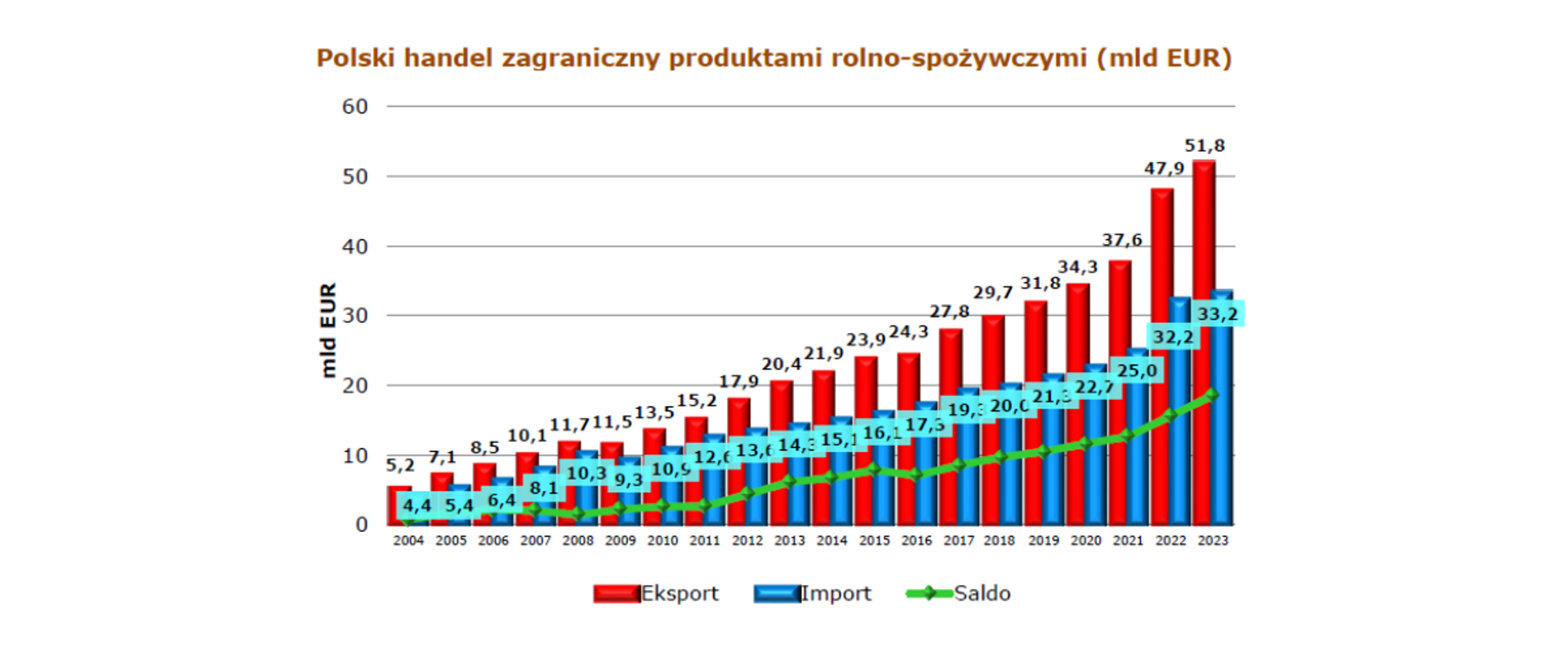 W 2023 r. odnotowano wzrost wpływów uzyskanych z eksportu produktów rolno-spożywczych z Polski. Wartość eksportu ogółem towarów rolno-spożywczych z Polski w 2023 r. osiągnęła rekordowe 51,8 mld EUR (236 mld zł) i była o 8,1% wyższa niż przed rokiem. Jednocześnie udział eksportu rolno-spożywczego w wartości całego polskiego eksportu zwiększył się z 13,8% w 2022 r. do 14,7% w roku 2023.