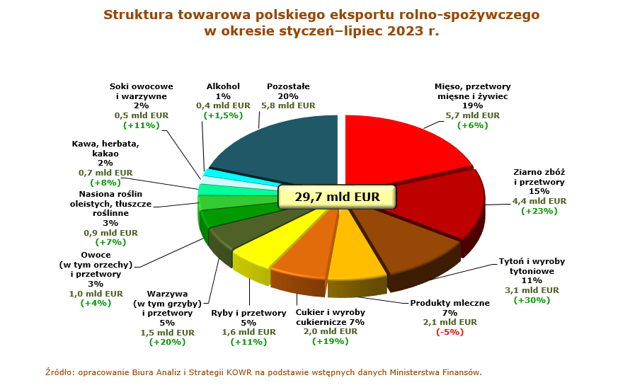 W strukturze towarowej polskiego eksportu produktów rolno-spożywczych dominowało mięso, przetwory mięsne i żywiec. W okresie styczeń-lipiec 2023 r. przychody uzyskane ze sprzedaży zagranicznej mięsa przetworów mięsnych i żywca były o 6% wyższe niż rok wcześniej i wyniosły 5,7 mld EUR, stanowiąc 19% wartości całego polskiego eksportu produktów rolno-spożywczych.