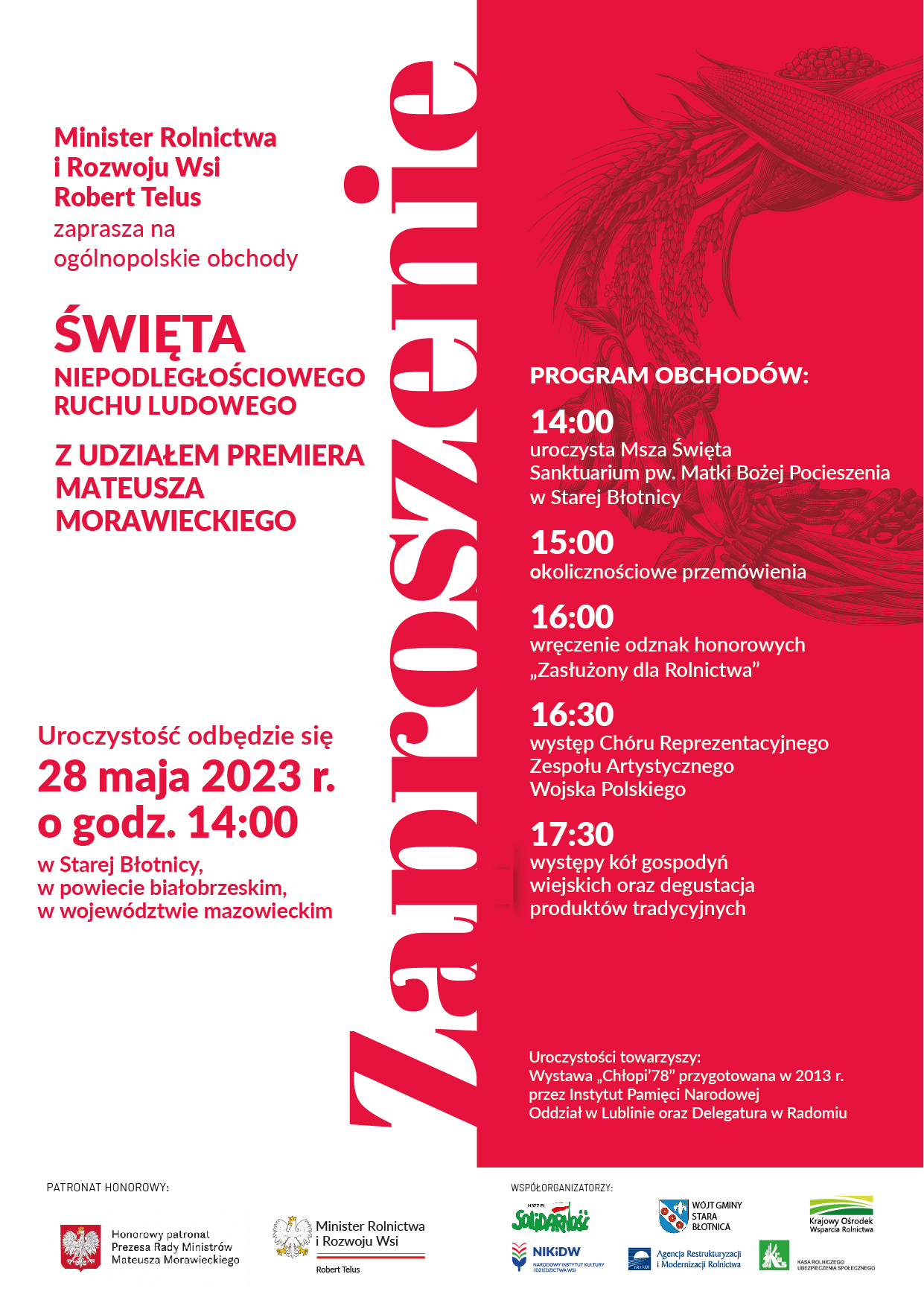 Zaproszenie do udziału w Ogólnopolskim Święcie Niepodległościowego Ruchu Ludowego w Starej Błotnicy w powiecie białobrzeskim.