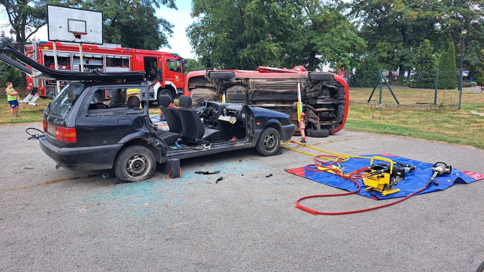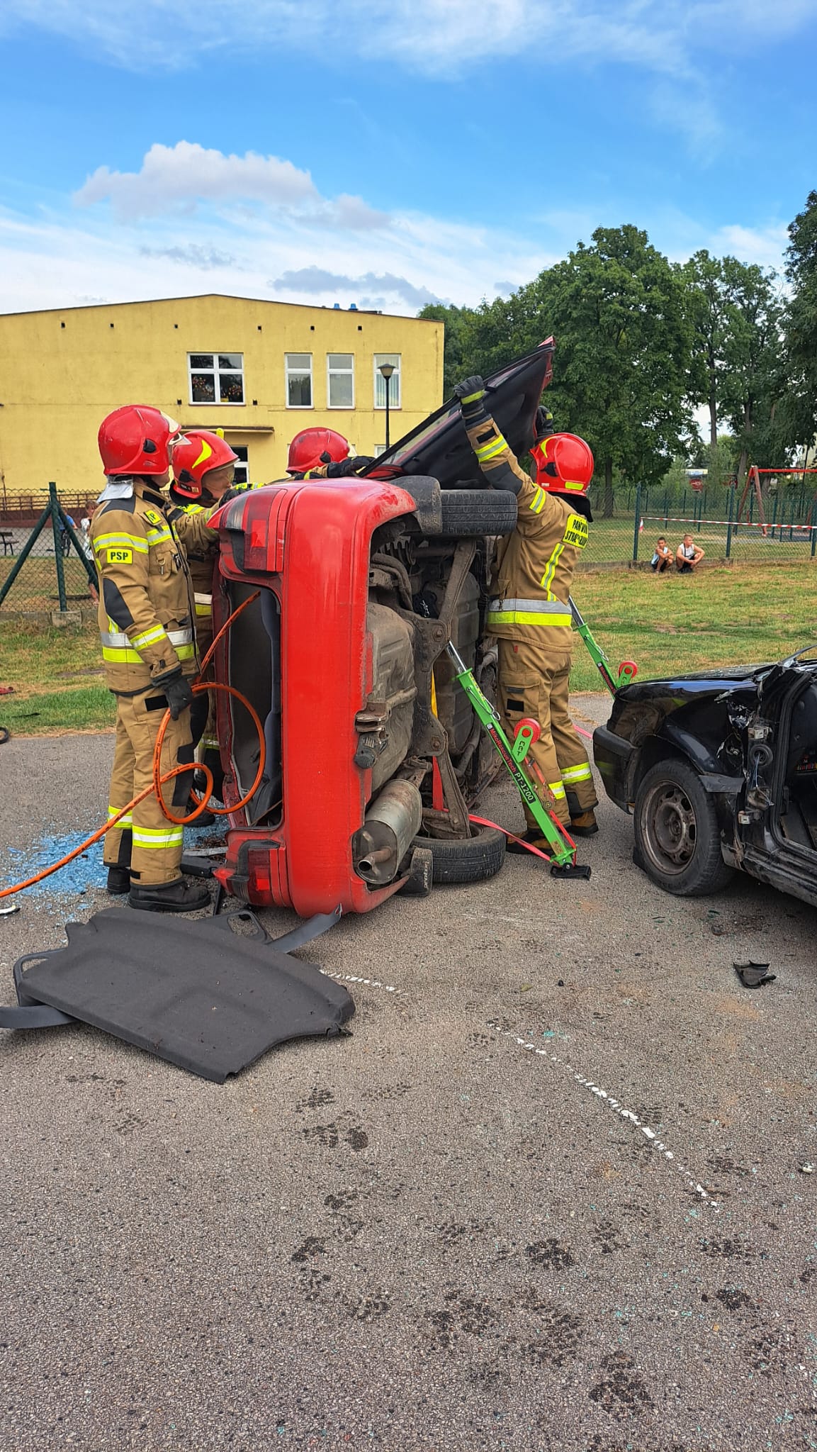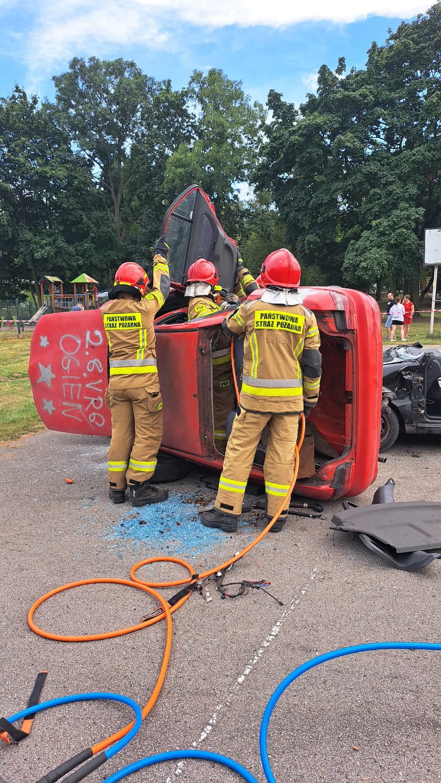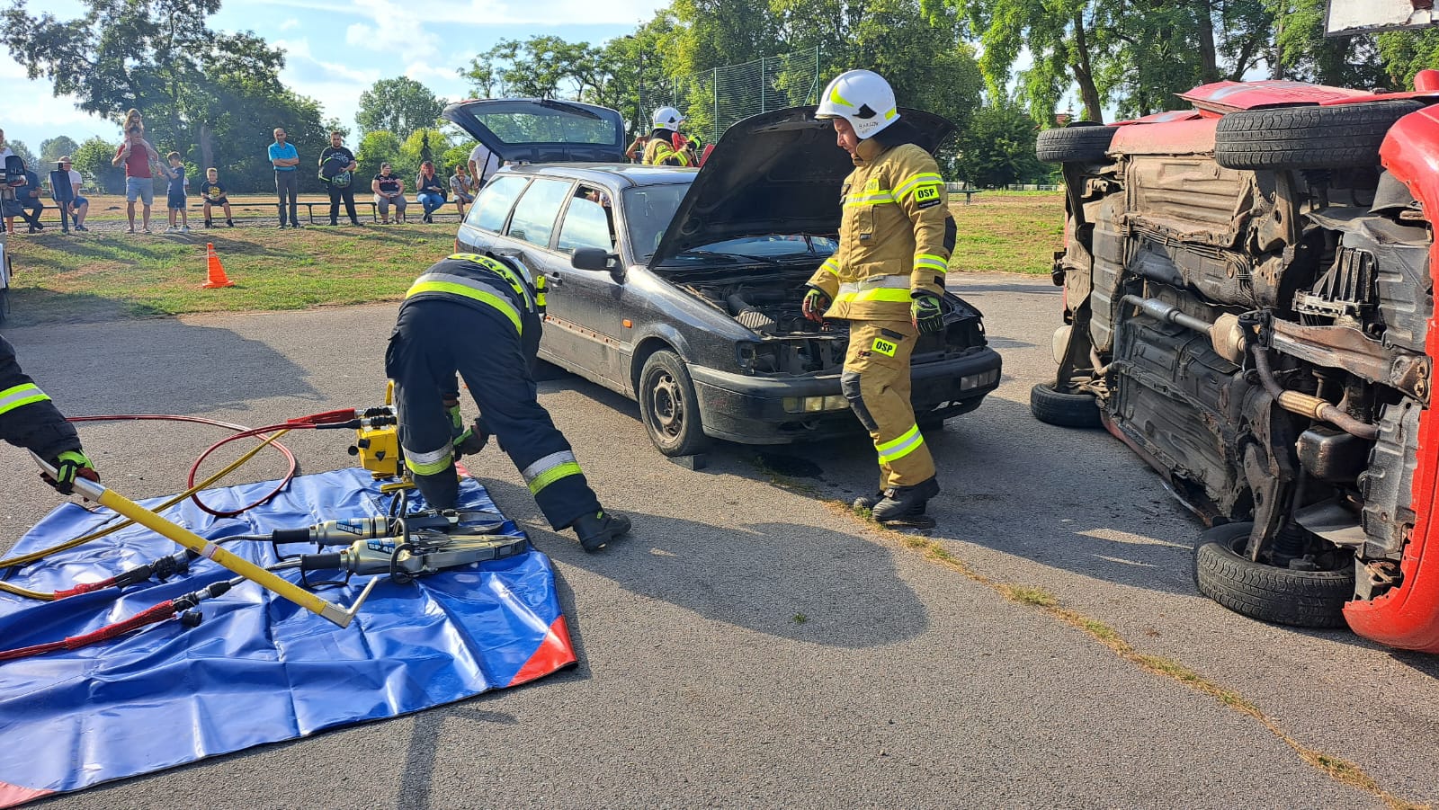 W dniu 26.08.2023 roku Strażacy z Jednostki Ratowniczo-Gaśniczej w Aleksandrowie Kujawskim wraz z Druhami Ochotniczej Straży Pożarnej z Krajowego Systemu Ratowniczo- Gaśniczego w Zakrzewie zorganizowali pokaz ratownictwa technicznego podczas Gminno-Parafialnych uroczystości dożynkowych w Zakrzewie. W pierwszej części pokazu Druhowie z Zakrzewa ewakuowali osobę poszkodowaną w wypadku samochodowym przy użyciu sprzętu hydraulicznego, którą następnie przekazali Zespołowi Ratownictwa Medycznego. Druga część pokazu została zaprezentowana przez zastęp Jednostki Ratowniczo-Gaśniczej w Aleksandrowie Kujawskim i miała na celu pokaz metod dostania się do osoby poszkodowanej w samochodzie, który znajdował się na boku. Działania obu zastępów miały na celu przybliżenie czynności ratowniczych wykonywanych przez strażaków oraz możliwości technicznych sprzętu wykorzystywanego podczas prawdziwych zdarzeń. Uczestnicy uroczystości mogli również zapoznać się z wyposażeniem samochodów strażackich a najmłodsi zasiąść za ich kierownicą.