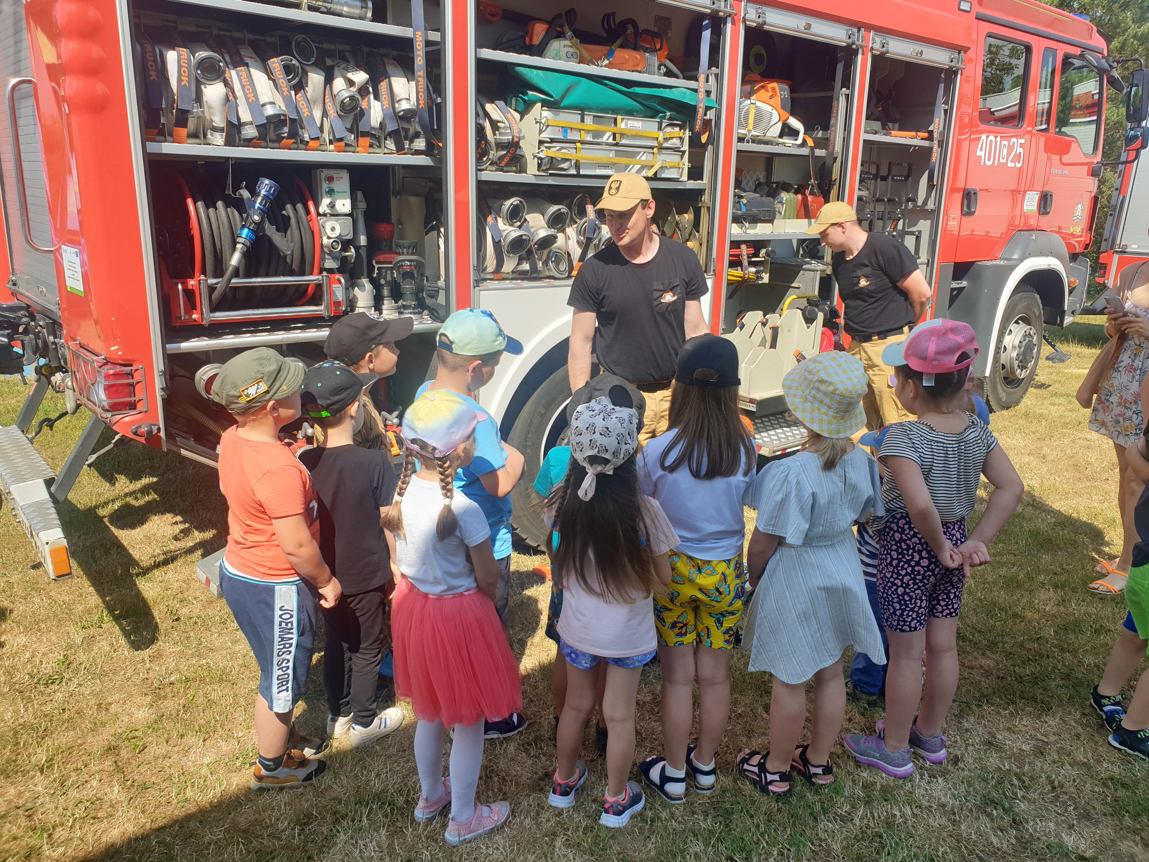 Spotkanie z przedszkolakami w dniu 19.06.2023 r. w Szkole Podstawowej im. ks. kan. Jana Matusiaka w Ostrowąsie miało charakter pogadanki. Strażacy opowiedzieli jak wygląda służba w Państwowej Straży Pożarnej oraz przeciwdziałanie zagrożeniom występujących w okresie letnim przede wszystkim podczas wypoczynku nad wodą w okresie wakacji. Dzieci oraz nauczyciele żywo uczestniczyli w rozmowie. Po rozmowie wszyscy udali się do obejrzenia sprzętu który strażak na co dzień używa w akcjach. Na koniec dzieci podziękowały za spotkanie ze strażakami.