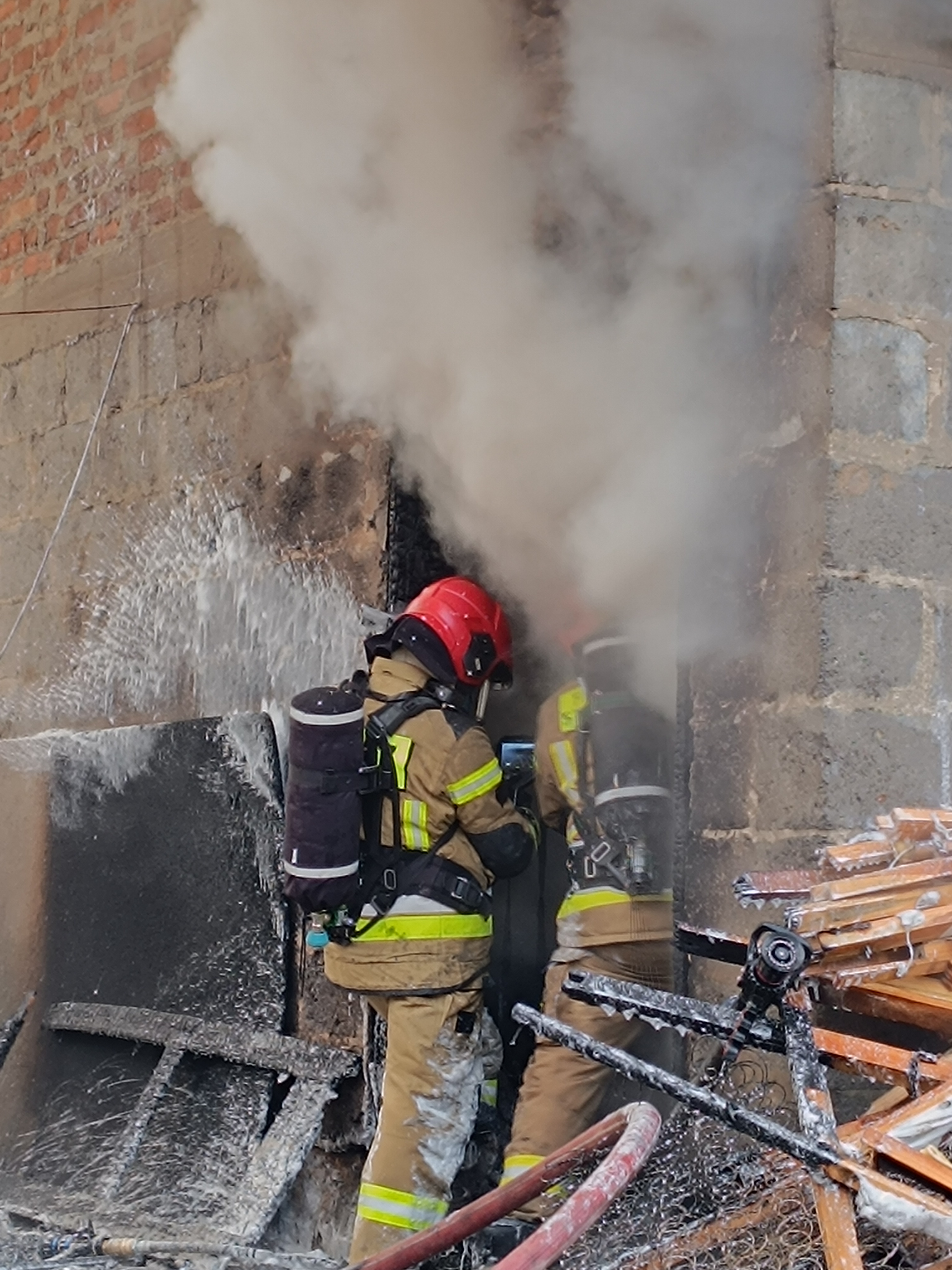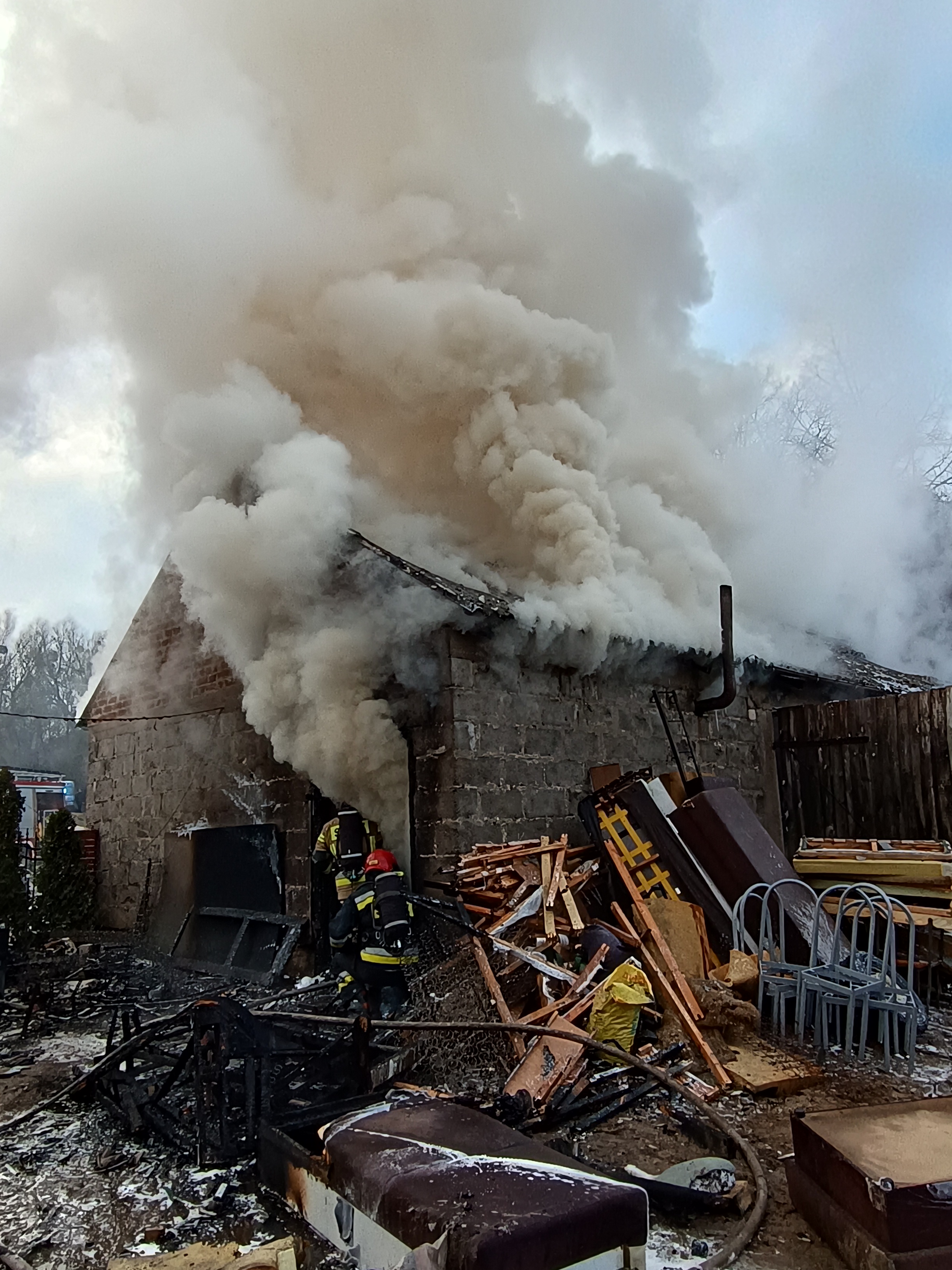 Po dojeździe na miejsce zdarzenia zastano w pełni rozwinięty pożar budynku gospodarczego i znajdującego się w nim zakładu tapicerskiego, mebli tapicerowanych znajdujących się przed zakładem co zagrażało przedostaniem się pożaru na pobliski dom oraz poparzonego właściciela zakładu, który samodzielnie próbował ugasić ogień. Kierujący działaniami ratowniczymi poinformował stanowisko kierowania o potrzebie zadysponowania kolejnych sił i środków. Na miejsce działań został skierowany zastęp GCBA z JRG1 Aleksandrów Kujawski, GCBA z OSP Służewo oraz GBA z OSP Zbrachlin. Początkowo podano jeden prąd wody na palące się materiały przed zakładem co zapobiegło zapalaniem się innych budynków, następnie wprowadzono do działań dwie roty w aparatach ochrony układu oddechowego i podano dwa prądy w natarciu, jeden w budynku gospodarczym drugi w zakładzie tapicerskim oraz utworzono rotę zabezpieczająca. Osobą poszkodowaną zajęli się strażacy a następnie przybyli na miejsce zdarzenia ratownicy medyczni. Płomienie wydostawały się przez przepalony dach budynku. Z uwagi na intensywność pożaru i ilość zgromadzonych materiałów w zakładzie tapicerskim zorganizowano zaopatrzenie wodne z przydrożnego hydrantu oraz z pobliskiego zbiornika wodnego w celu zapewnienia odpowiedniej ilości środka gaśniczego potrzebnego do ugaszenia pożaru. Na miejsce działań dołączył Komendant Powiatowy z Aleksandrowa Kujawskiego. Zadysponowano kolejny zastęp z OSP Raciążek w celu dowiezienia pełnych butli z powietrzem do aparatów powietrznych. W dalszych działaniach po przybyciu kolejnych sił i środków podano kolejny prąd wody w natarciu w części gospodarczej budynku oraz prąd piany w zakładzie tapicerskim co doprowadziło do znacznego zmniejszenia intensywności pożaru.