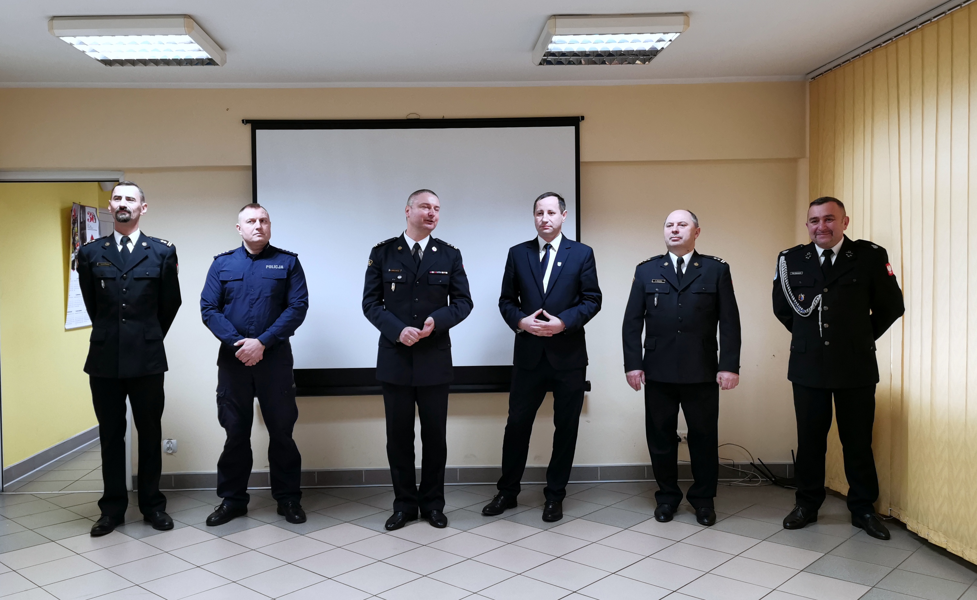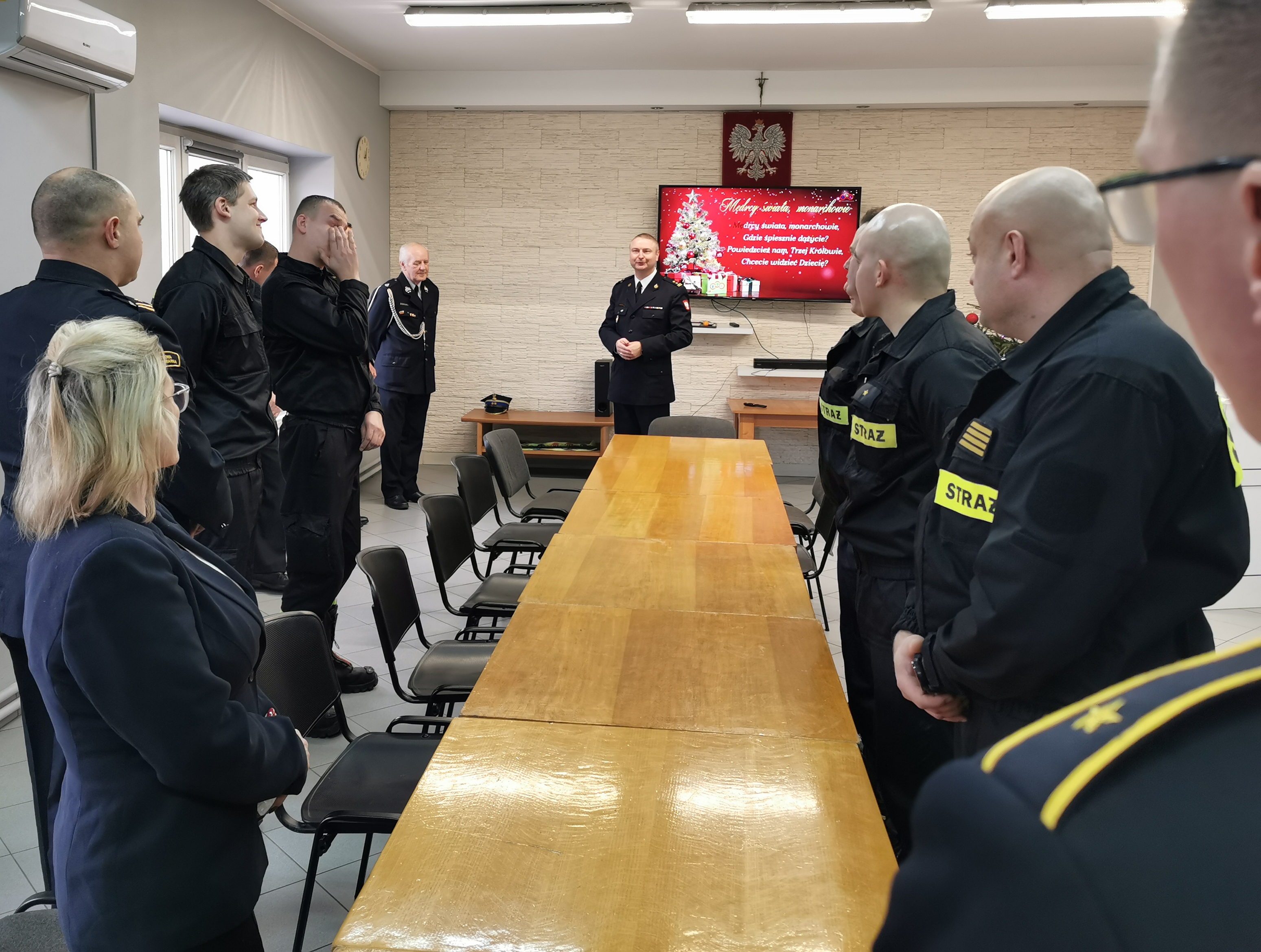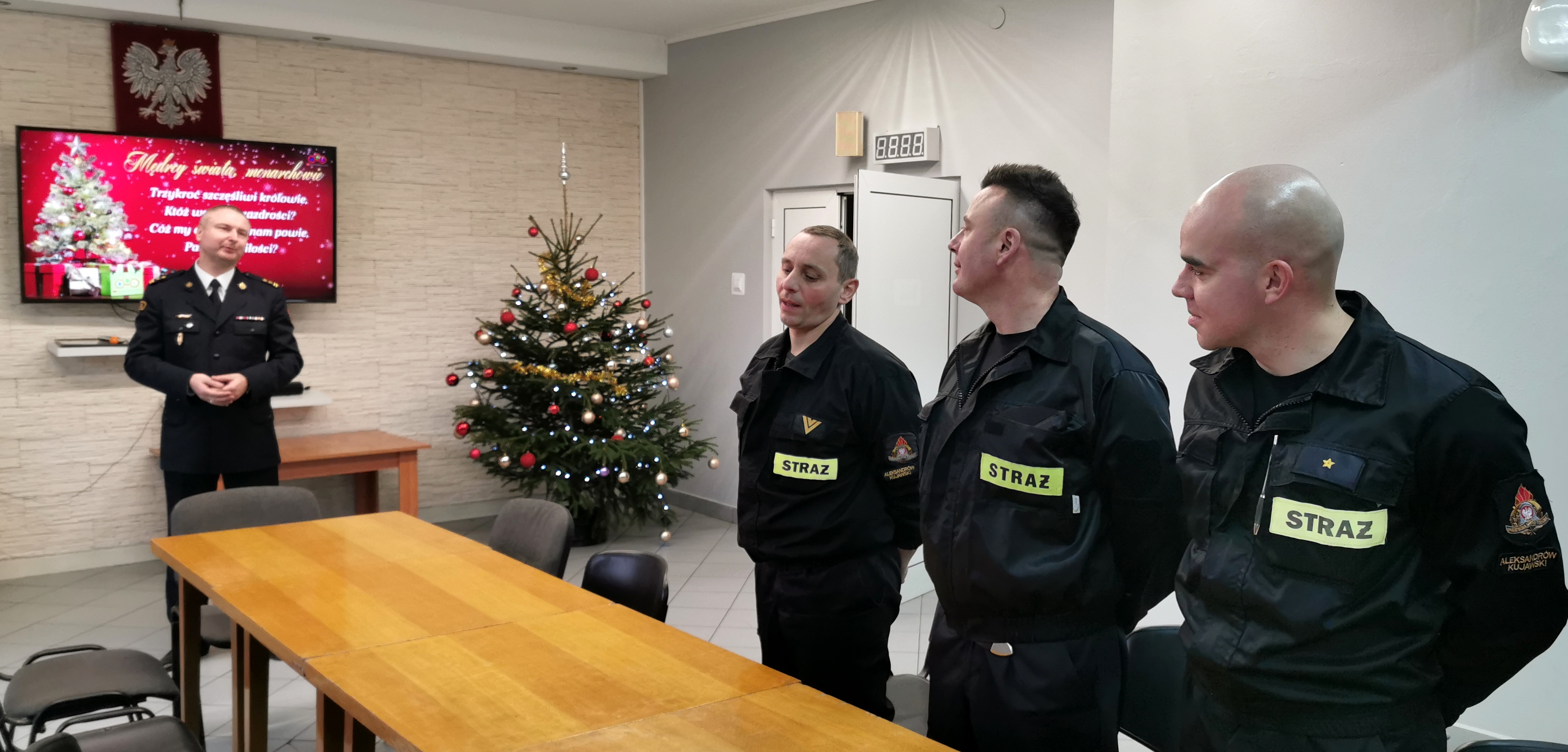bryg. Sławomir Zawitowski - Komendant Powiatowy PSP w Aleksandrowie Kujawskim w okolicznościowym przemówieniu zwrócił się do strażaków, pracowników cywilnych i emerytów składając im świąteczne życzenia. Następnie głos zabrali przybyli goście którzy podziękowali strażakom za pełnioną służbę i wyrazili uznanie dla ciężkiej pracy strażaków, dla ofiarności działań na rzecz bezpieczeństwa w różnych sferach życia. Zwieńczeniem spotkania było podzielenie się opłatkiem i świąteczne życzenia.