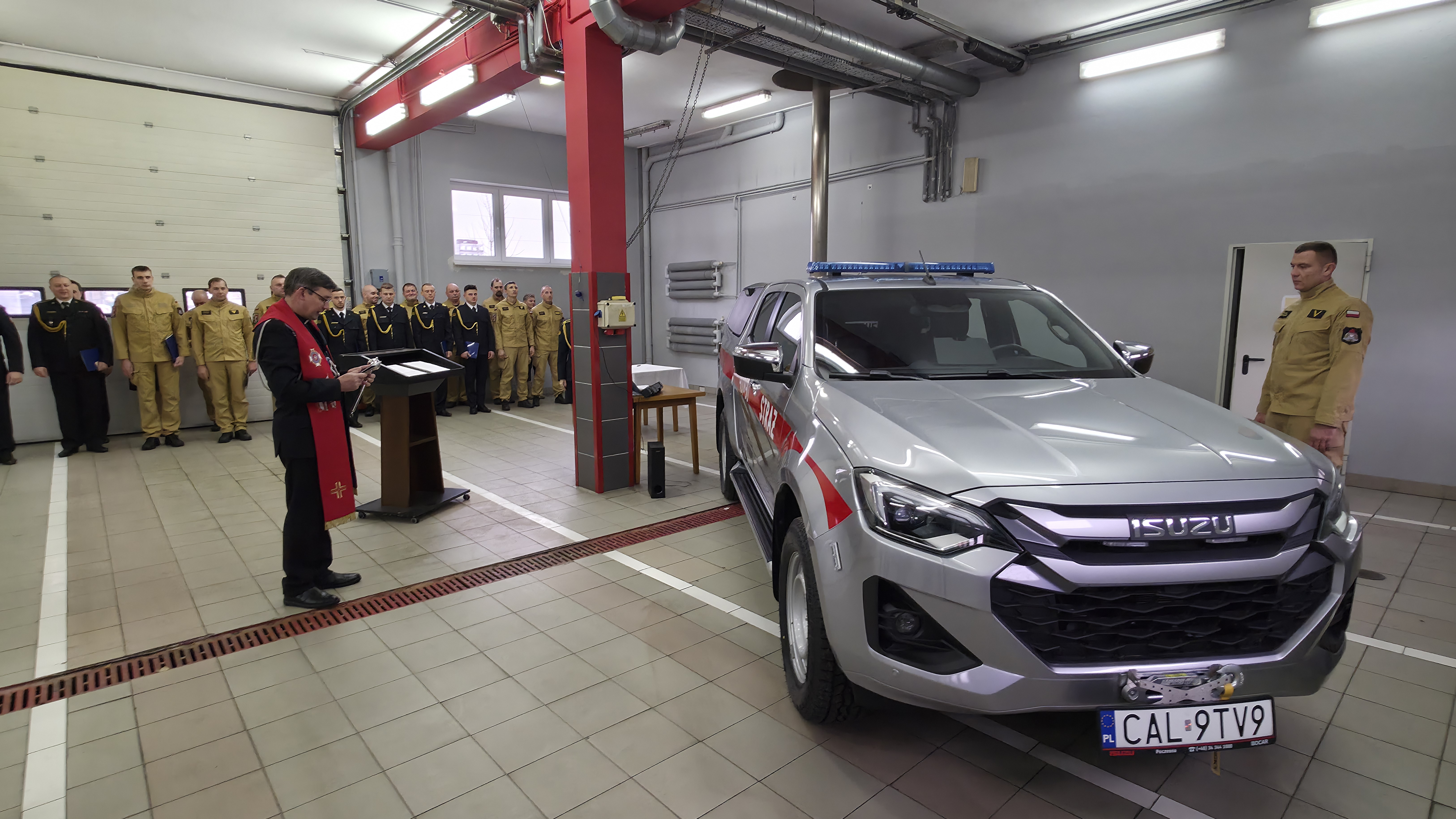 Dzisiejszy apel był również okazją do poświęcenia nowego samochodu Specjalnego Lekkiego Rozpoznawczo – Ratowniczego Isuzu D Max, który Komenda Powiatowa PSP w Aleksandrowie Kujawskim pozyskała dzięki dofinansowaniu z Funduszu Pomocy, Starostwa Powiatowego w Aleksandrowie Kujawskim oraz Urzędy Miasta w Aleksandrowie Kujawskim. ks. Andrzej Zdzienicki – kapelan strażaków powiatu aleksandrowskiego dokonał aktu poświęcenia samochodu a Pani Lidia Tokarska – starosta powiatu wraz z Arkadiuszem Świątkowskim- Przewodniczącym Rady Powiatu przekazali kluczyki i dokumenty od samochodu na ręce funkcjonariusza PSP.