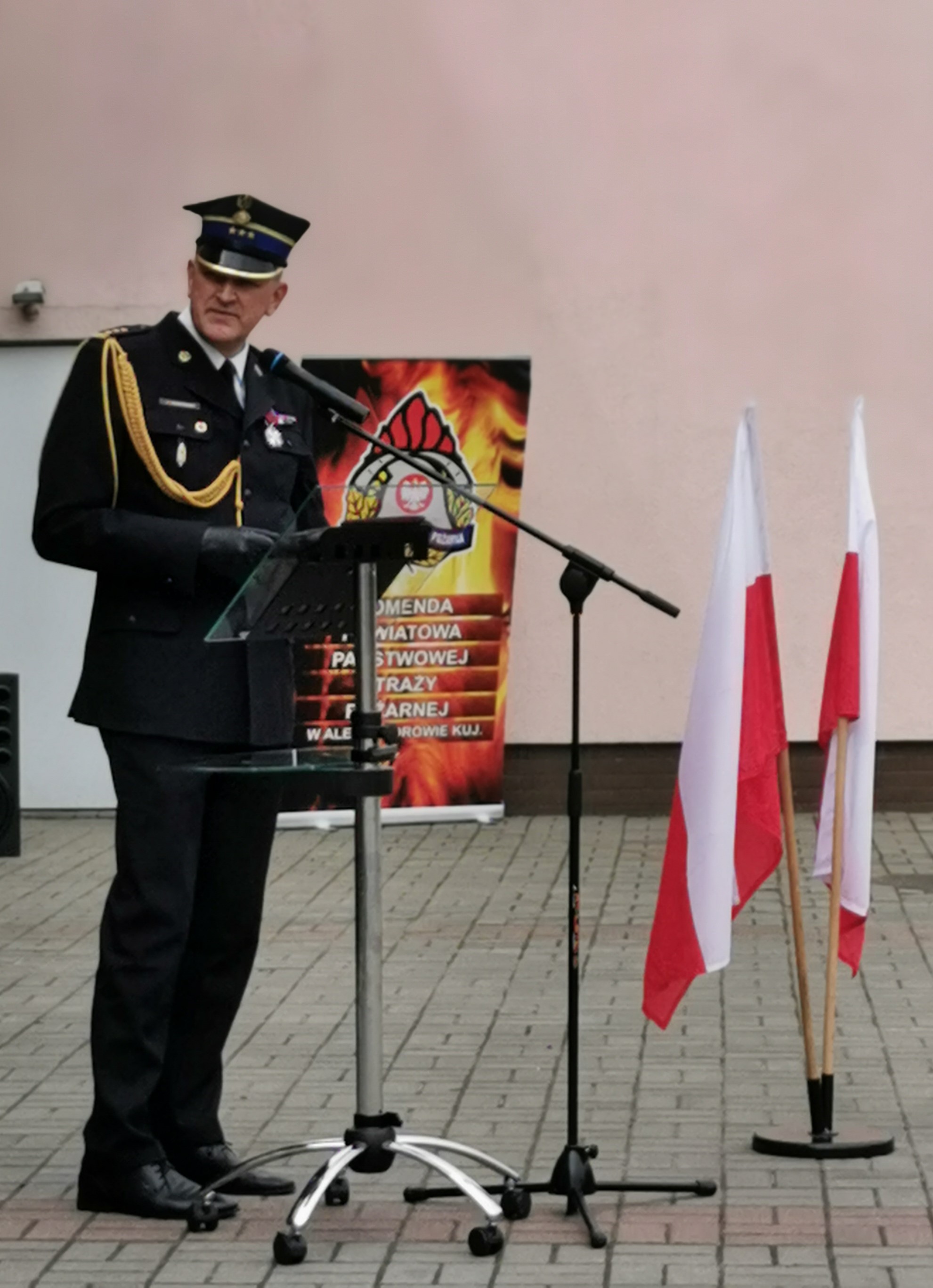 W dniu 19 maja 2021 strażacy Komendy Powiatowej Państwowej Straży Pożarnej w Aleksandrowie Kujawskim obchodzili Dzień Strażaka. Ze względu na obostrzenia sanitarne związane z pandemią koronawirusa uroczystości odbyły się w ścisłym reżimie sanitarnym i zostały przeprowadzone w dwóch turach. W godzinach porannych bryg. Sławomir Zawitowski - Komendant Powiatowy PSP w Aleksandrowie Kujawskim spotkał się ze zmianą służbową strażaków Jednostki Ratowniczo-Gaśniczej w Ciechocinku. Komendant w krótkim przemówieniu podziękował strażakom za służbę i złożył życzenia.