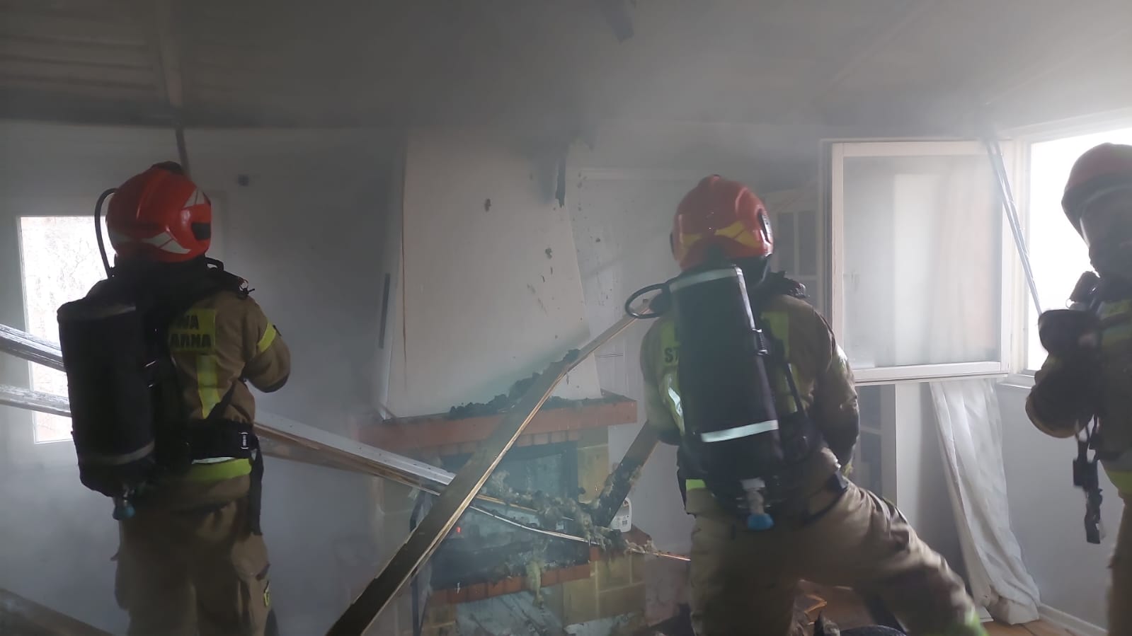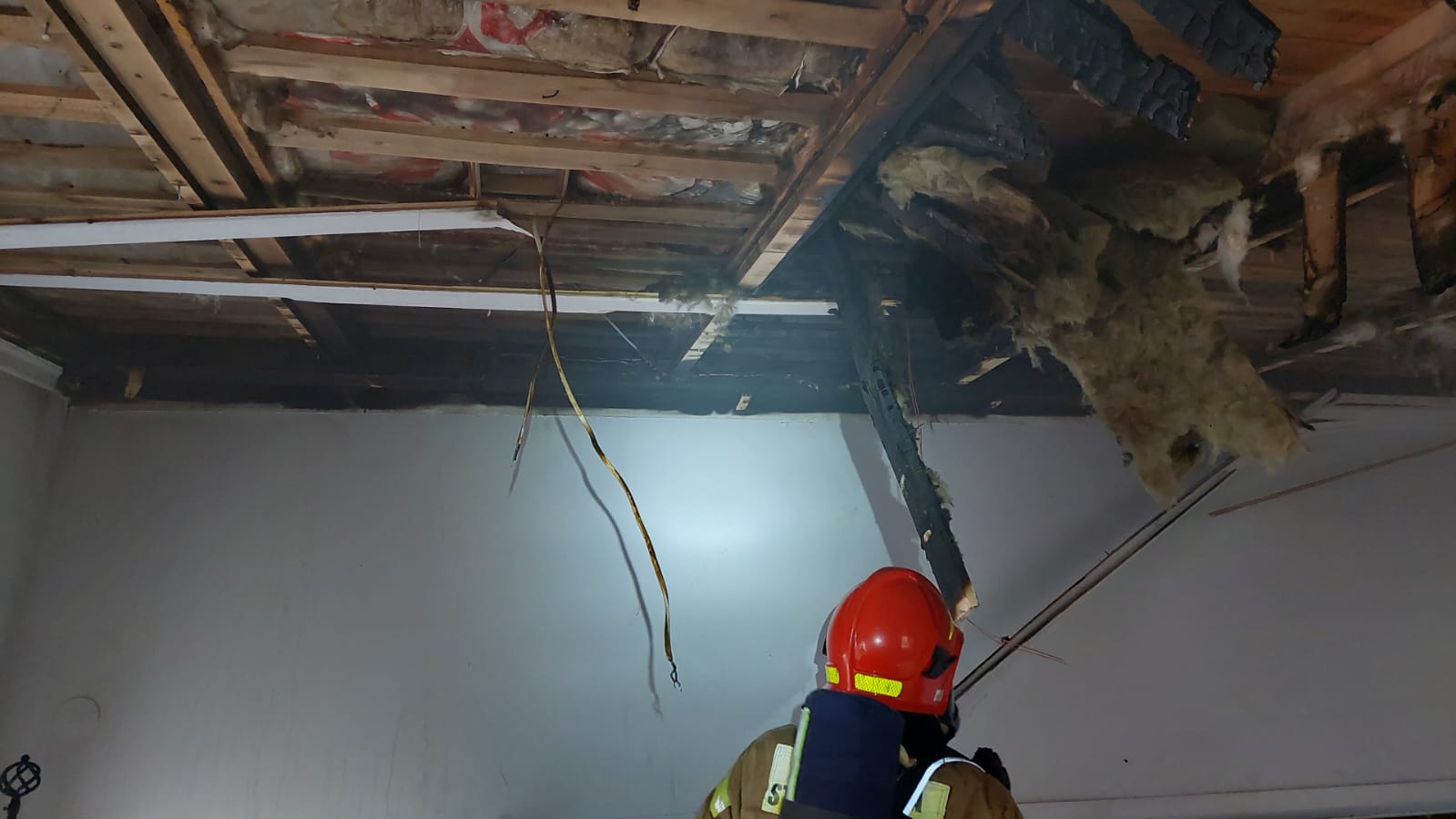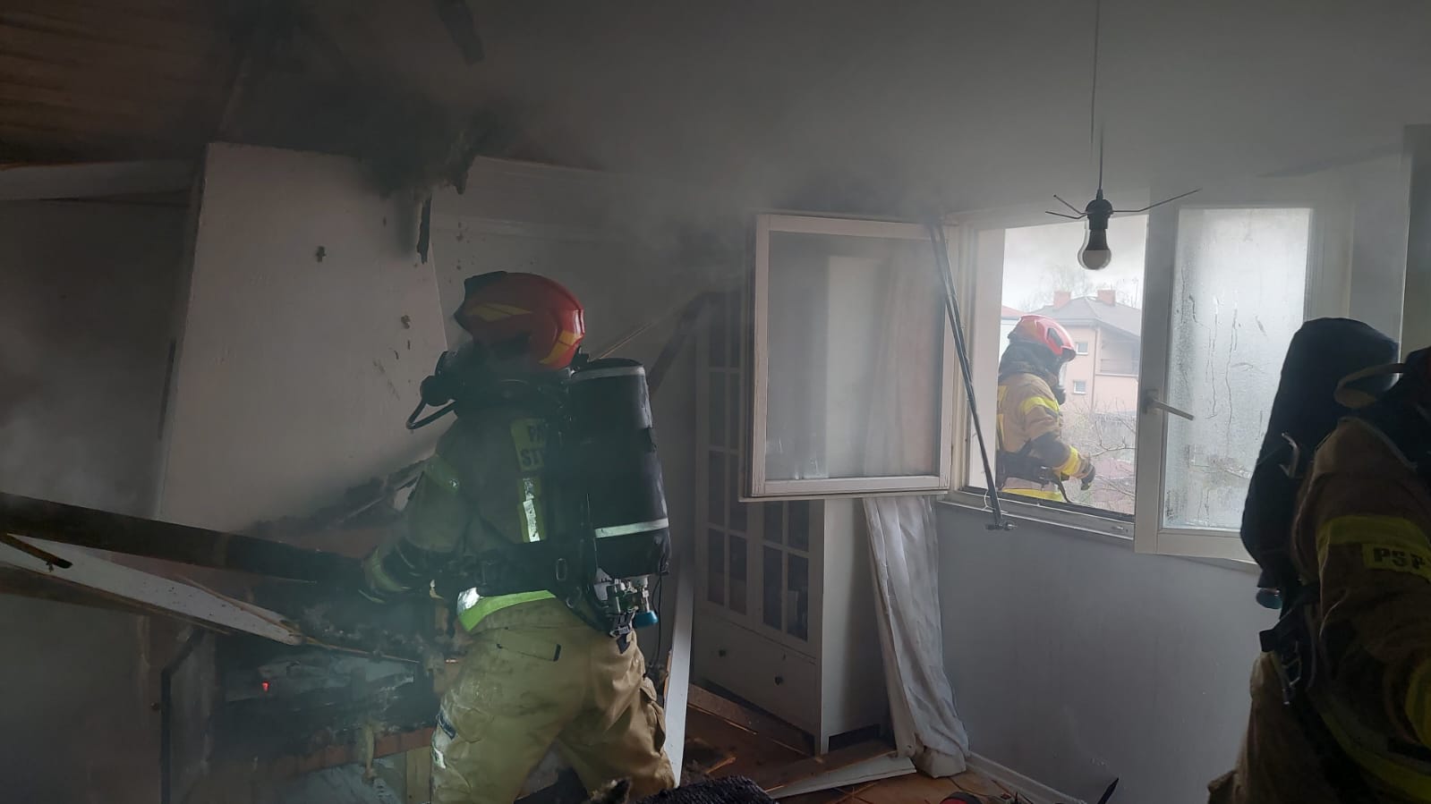 Po ugaszeniu pożaru strażacy przystąpili do rozbiórki elementów sufitu o konstrukcji drewnianej w której rozprzestrzeniał się pożar.