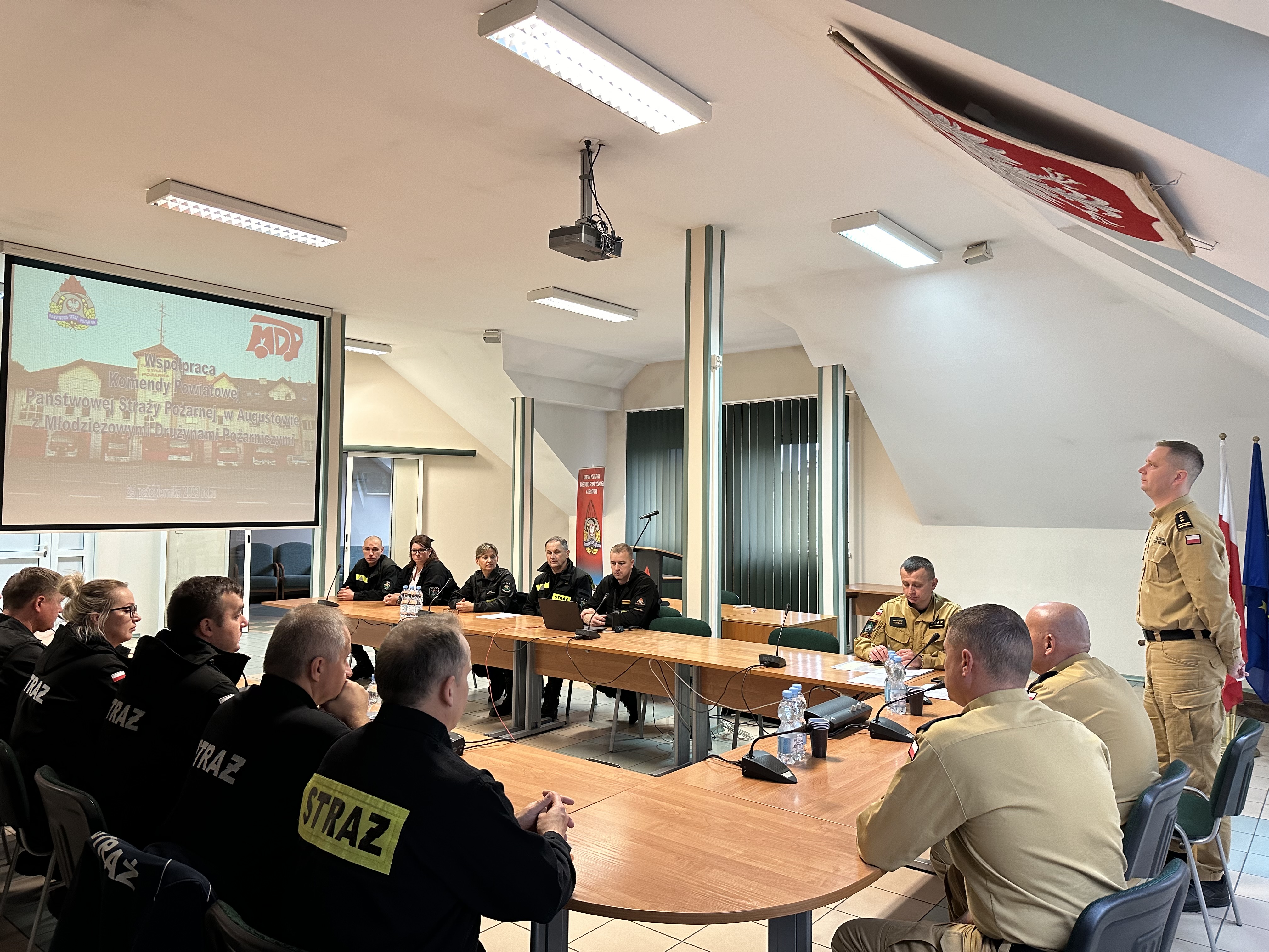 W dniu 25.10.2023 r. w Komendzie Powiatowej PSP w Augustowie odbyło się spotkanie z opiekunami Młodzieżowych Drużyn Pożarniczych funkcjonujących na terenie powiatu augustowskiego. W spotkaniu uczestniczył bryg. Marcin Bielakowicz - Zastępca Podlaskiego Komendanta Wojewódzkiego PSP oraz kierownictwo Komendy Powiatowej PSP w Augustowie. W trakcie spotkania dokonano podsumowania dotychczasowej działalności MDP, ze szczególnym uwzględnieniem organizowanych w tym roku obozów i wycieczek. Zastępca Podlaskiego Komendanta Wojewódzkiego PSP podziękował wszystkim za zaangażowanie i wkład wniesiony w działalność Młodzieżowych Drużyn Pożarniczych. Spotkanie było również okazją do podziękowań i gratulacji opiekunom MDP Rutki Stare za zwycięstwo chłopięcej drużyny MDP w XI Wojewódzkich Zawodach Sportowo-Pożarniczych Młodzieżowych Drużyn Pożarniczych w Krasnopolu oraz za udział i osiągnięcie 7 lokaty w Ogólnopolskich Zawodach Sportowo-Pożarniczych Młodzieżowych Drużyn Pożarniczych według regulaminu CTIF w Kalwarii Zebrzydowskiej.