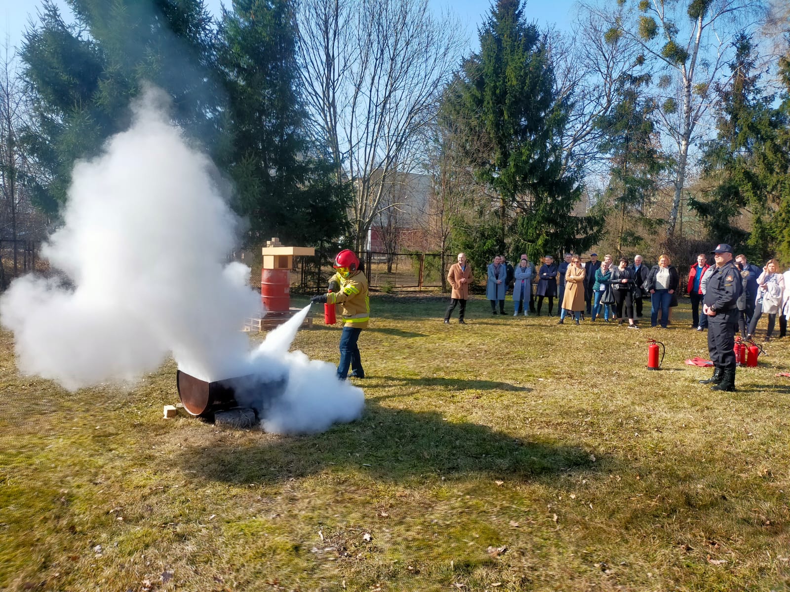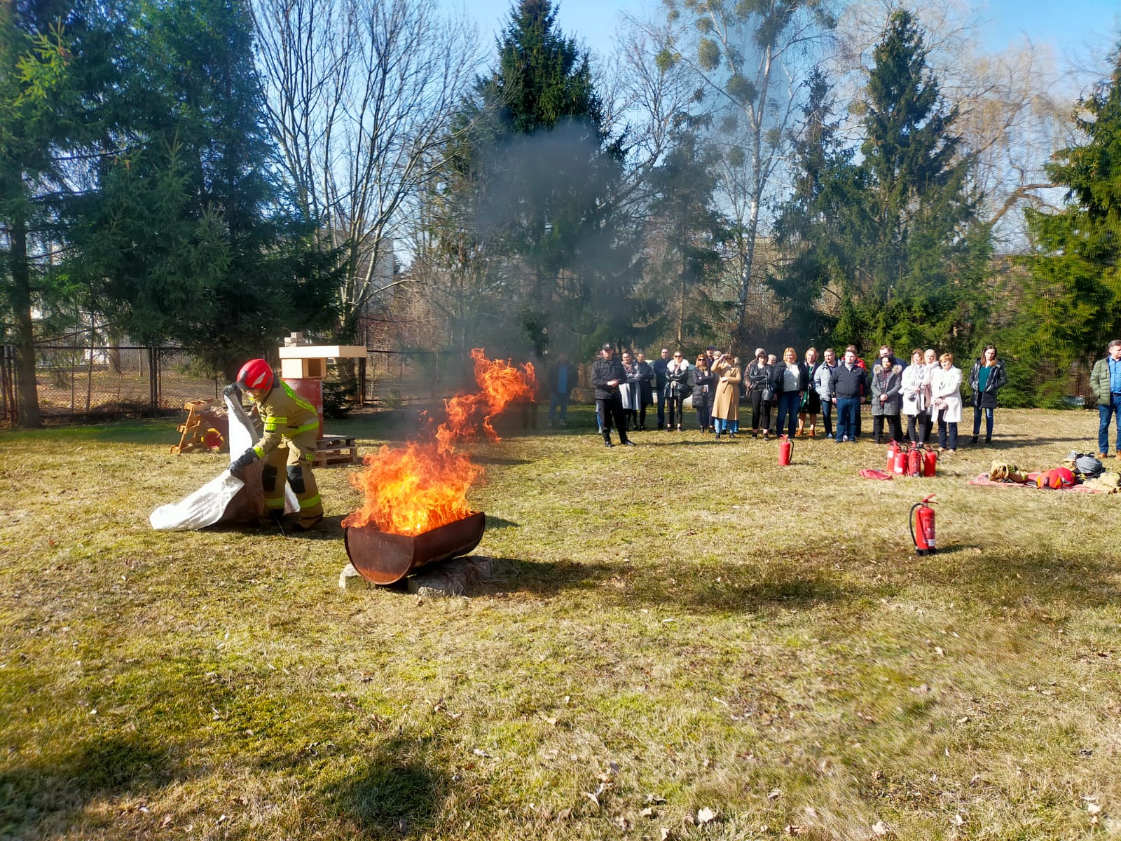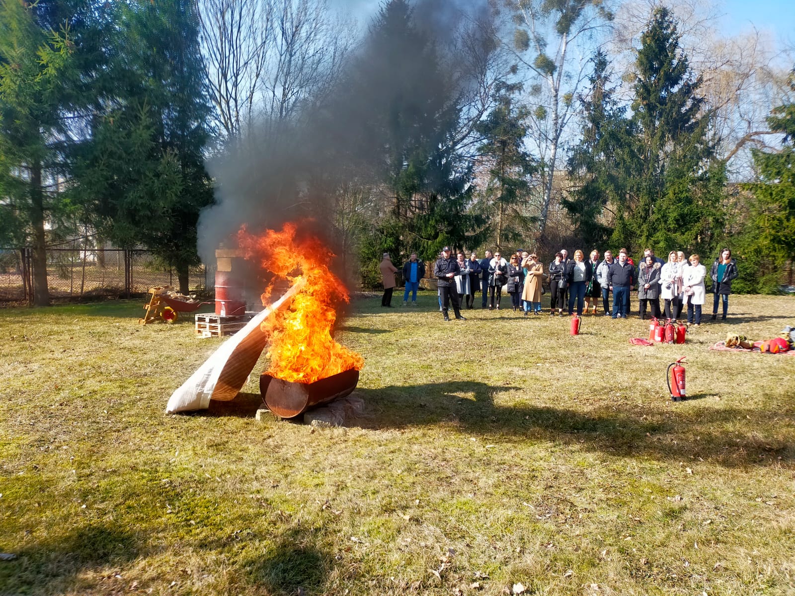 Uczestnikom szkolenia podzielonych na dwie grupy zaprezentowano użycie gaśnicy proszkowej oraz koca gaśniczego, przedstawiono zjawisko rozgorzenia do jakiego dochodzi w momencie dopływu powietrza do pomieszczenia objętego pożarem na przykładzie modelowego domku z daszkiem.