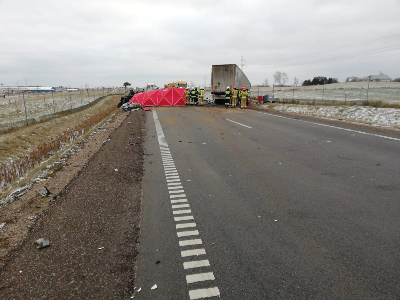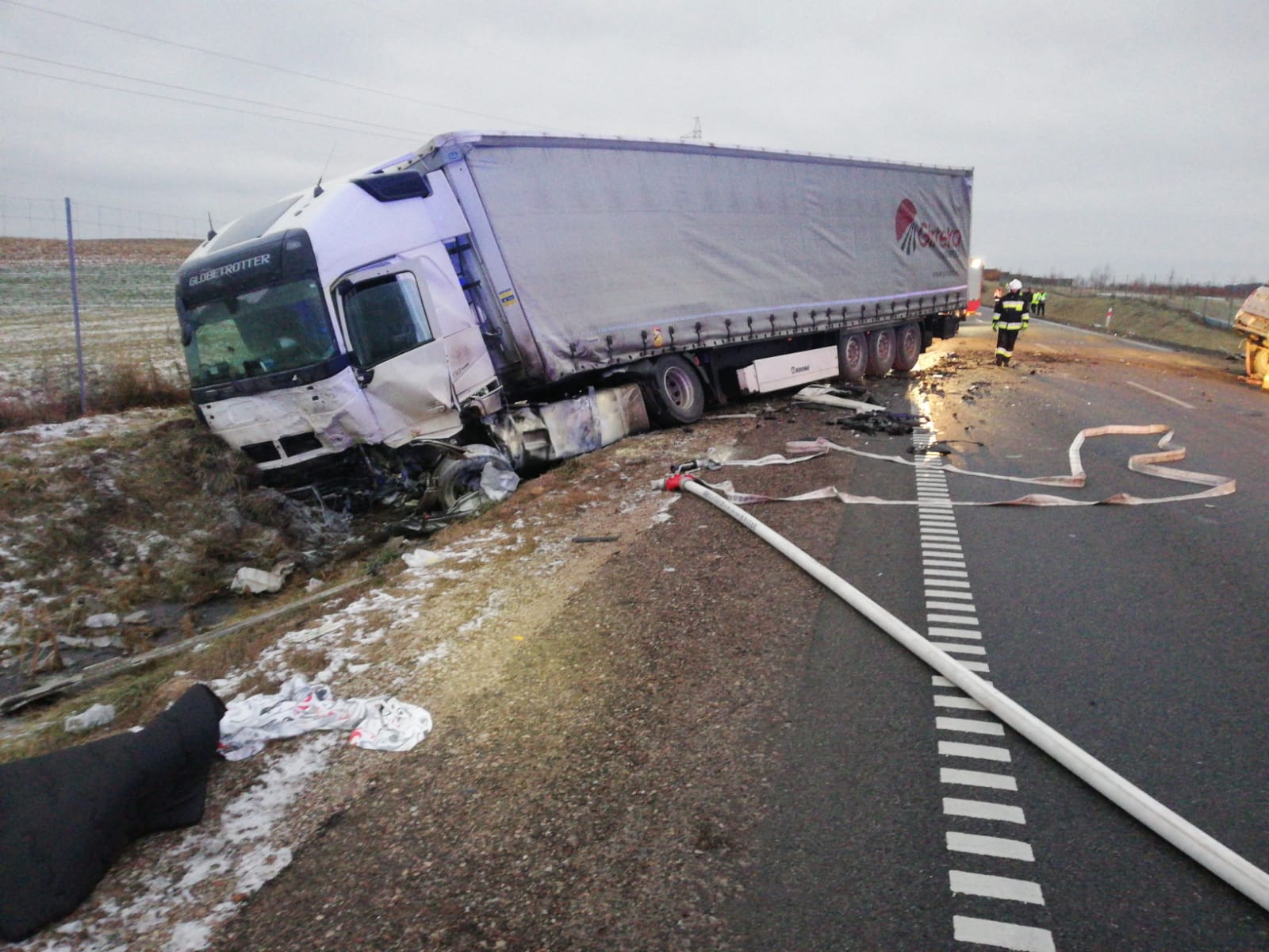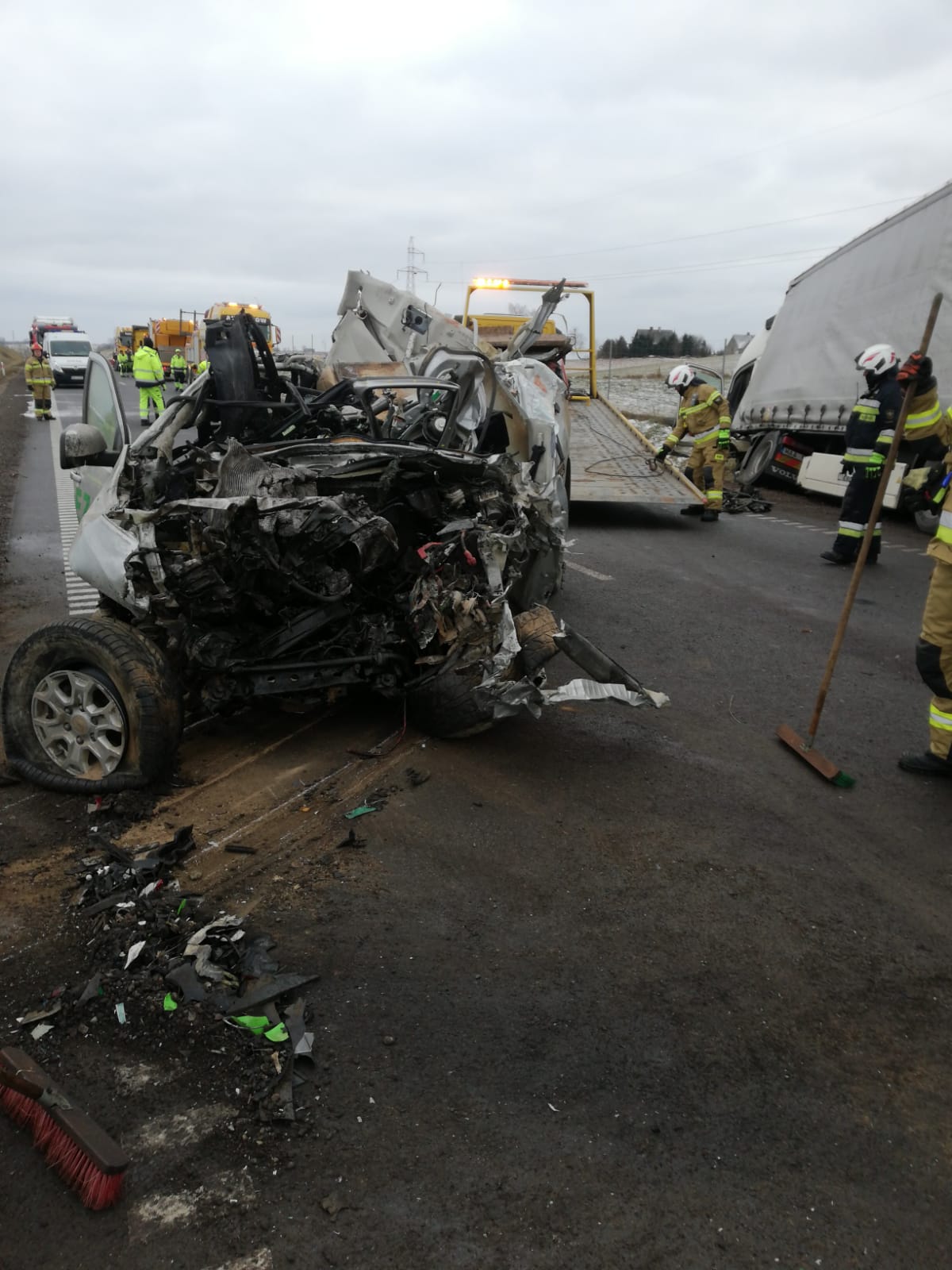 Po przybyciu na miejsce zdarzenia Jednostek Ochrony Przeciwpożarowych zastano wypadek drogowy - zderzenie ciągnika siodłowego VOLVO z naczepą z samochodem osobowym Ford Ranger. Działania JOP polegały na zabezpieczeniu miejsca zdarzenia, wykonaniu dostępu przy użyciu narzędzi hydraulicznych do kierowcy samochodu osobowego. Po przybyciu na miejsce ZRM lekarz stwierdził zgon kierowcy samochodu osobowego. Kierowca samochodu ciężarowego po przebadaniu został przetransportowany do szpitala. Na czas prowadzonych działań droga była całkowicie zablokowana.