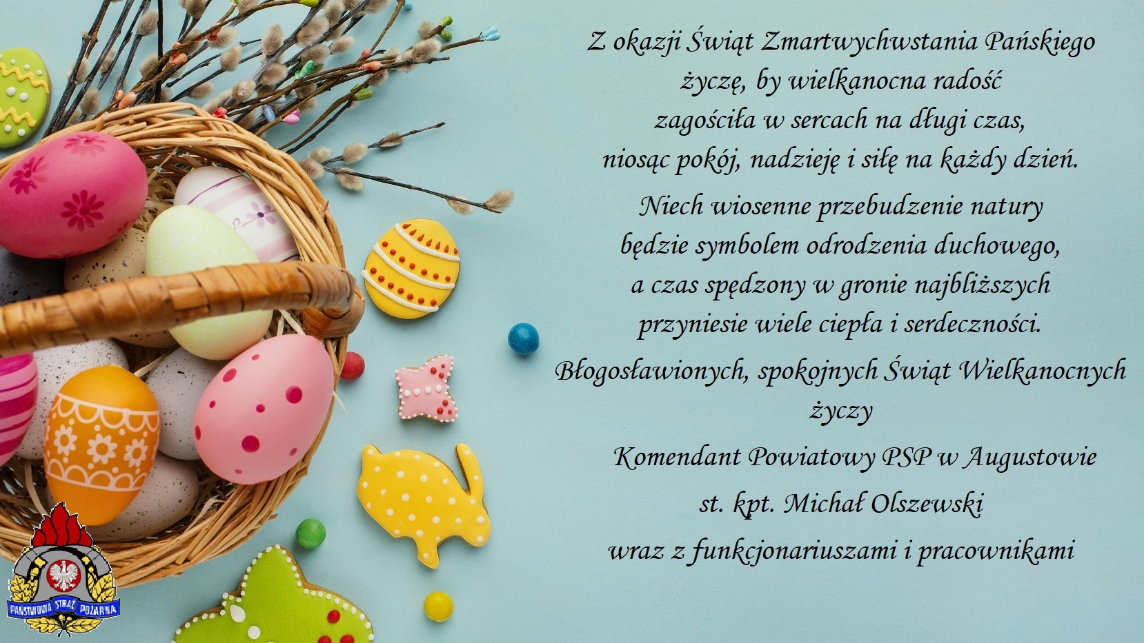 Komenda Powiatowa Państwowej Straży Pożarnej w Augustowie w ramach zbliżających się Świąt Wielkanocnych, pragnie złożyć najserdeczniejsze życzenia pomyślności, zdrowia i spokoju w najbliższym gronie. Wszystkim życzymy Wesołego Alleluja!