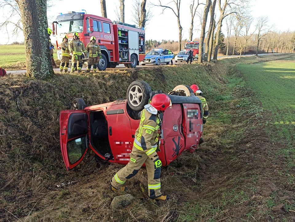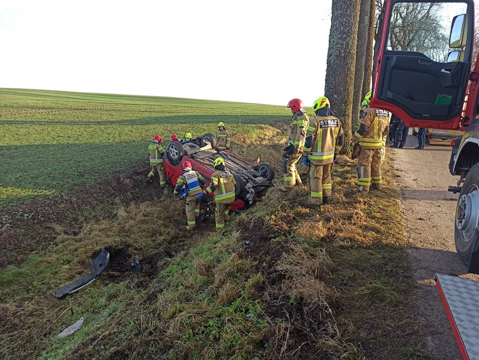 Na miejscu zdarzenia zastano samochód osobowy znajdujący na dachu na poboczu drogi. Autem podróżowała jedna osoba, która opuściła go samodzielnie przed przybyciem służb ratowniczych.