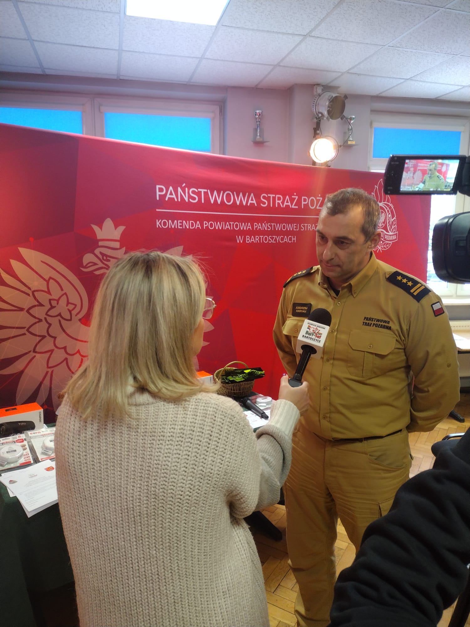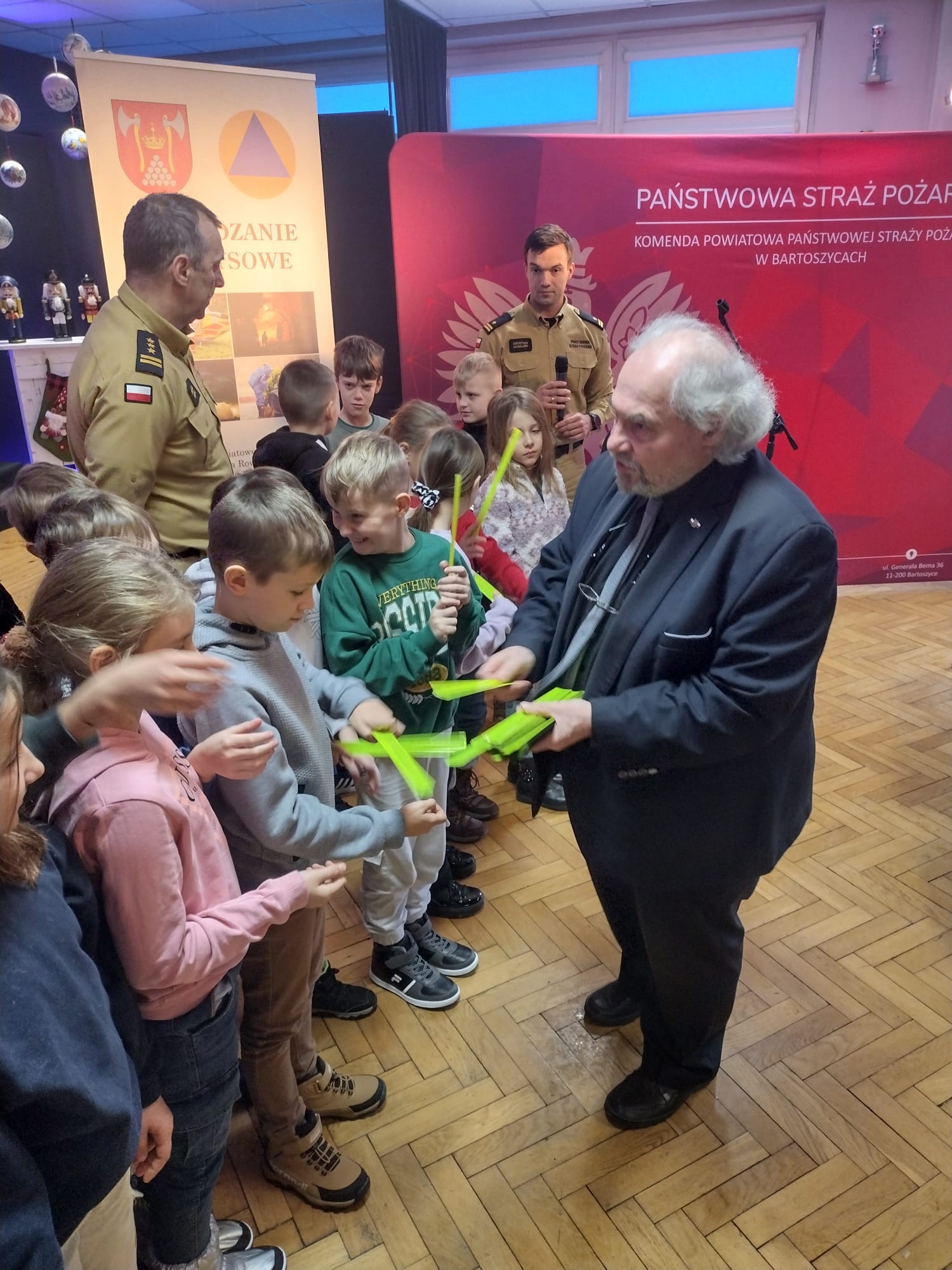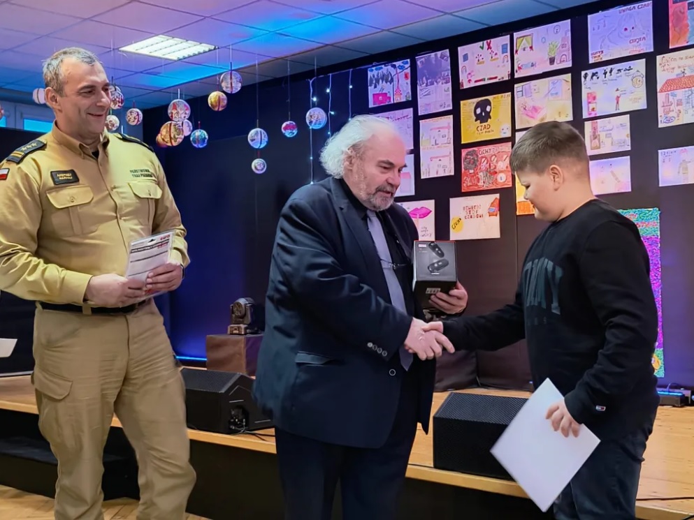 Nagrody i dyplomy wręczyli organizatorzy konkursu Starosta Bartoszyki Jan Zbigniew Nadolny, Komendant Powiatowy PSP w Bartoszycach st. bryg. Andrzej Harhaj oraz Pan Sebastian Bogdan kierownik Biura Bezpieczeństwa i Zarządzania Kryzysowego Powiatu Bartoszyckiego. Najlepsi w poszczególnych kategoriach dodatkowo otrzymali vouchery umożliwiające spędzenie dnia w Komendzie Powiatowej PSP w Bartoszycach. Zwycięzcy będą mogli zabrać ze soba osoby towarzyszące. W trakcie pobytu zapoznają się z przebiegem służby strażaków, wezmą udział w doskonaleniu zawodowym, poznają wysposażenie komendy oraz jej schemat organizacyjny.
