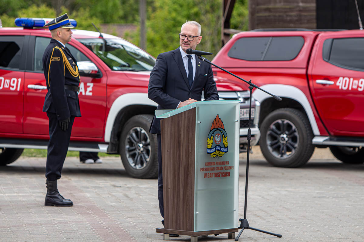 Jako pierwszy głos zabrał Komendant Powiatowy PSP w Bartoszycach mł. bryg. Krystian Masalski, który przywitał zaproszonych gości, a następnie podziękował funkcjonariuszom i pracownikom komendy za służbę i pracę na rzecz społeczności powiatu bartoszyckiego.