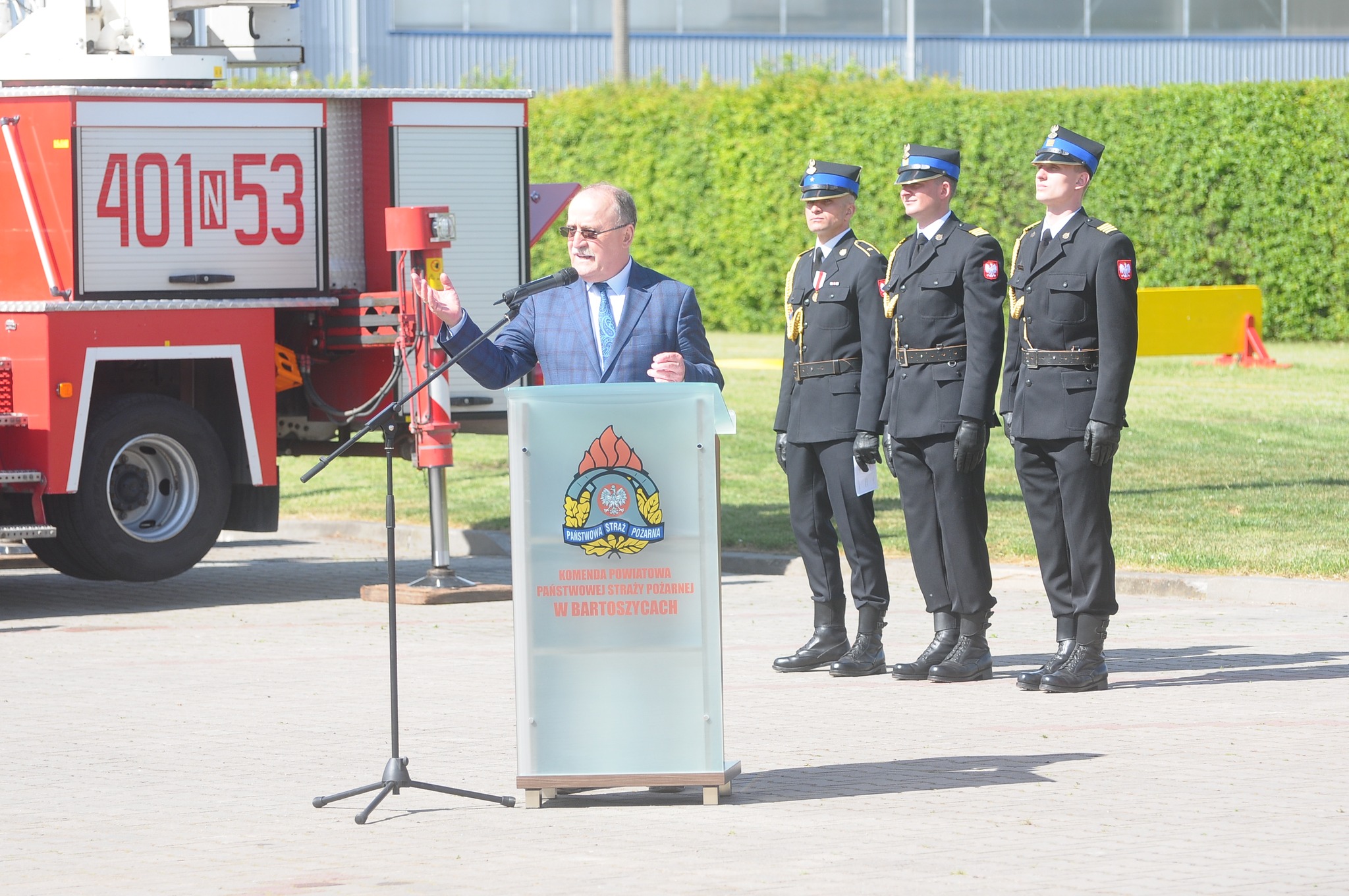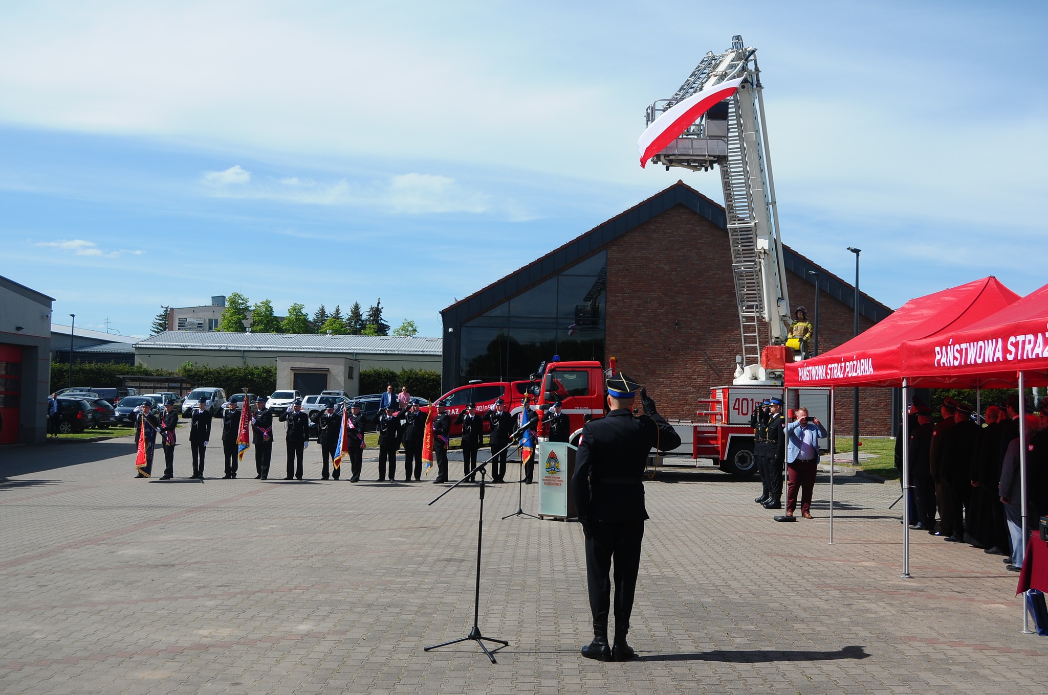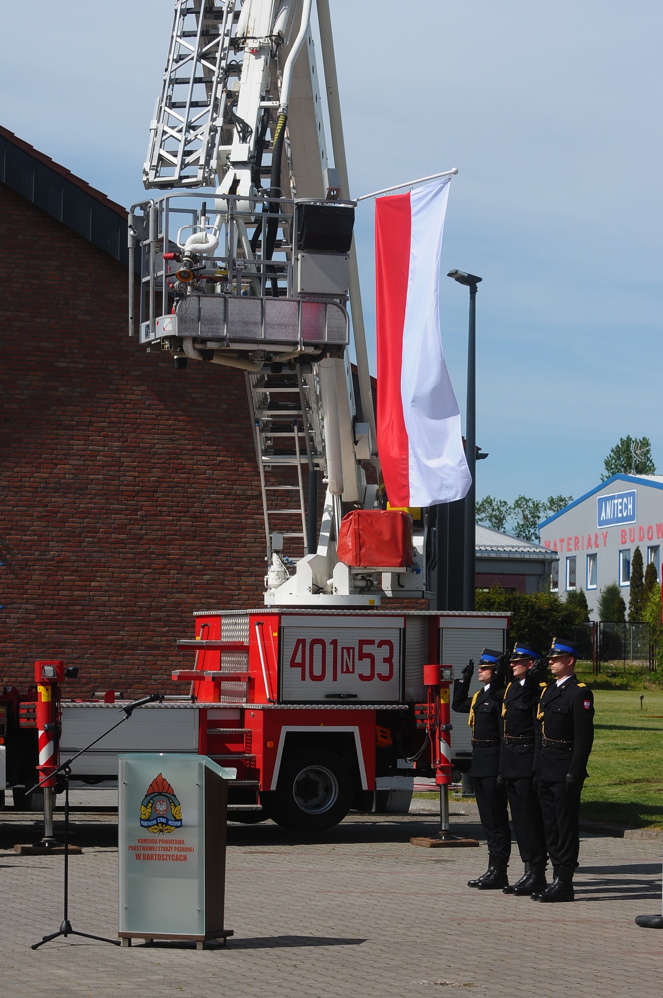 Uroczystość rozpoczęła się od złożenia meldunku Zastępcy Warmińsko-Mazurskiego Komendanta Wojewódzkiego PSP st. bryg. Adamowi Jastrzębskiemu przez dowódcę uroczystości. Następnie podniesiona została flaga państwowa i odśpiewany został „Mazurek Dąbrowskiego”. Jako pierwszy głos zabrał Komendant Powiatowy PSP w Bartoszycach st. bryg. Andrzej Harhaj, który przywitał zaproszonych gości, a następnie podziękował pracownikom cywilnym oraz funkcjonariuszom za zaangażowanie oraz codzienna pracę na rzecz tutejszej komendy. Słowa uznania skierował do przyjaciół z Ochotniczych Straży Pożarnych za ich poświęcenie na rzecz ochrony przeciwpożarowej. Podziękował także wszystkim przedstawicielom instytucji zarówno szczebla państwowego, jak i samorządowego oraz wszystkim sympatykom służby za doskonałą współpracę i wsparcie finansowe, które kierowane jest do bartoszyckiej komendy i jednostek OSP z terenu powiatu bartoszyckiego.