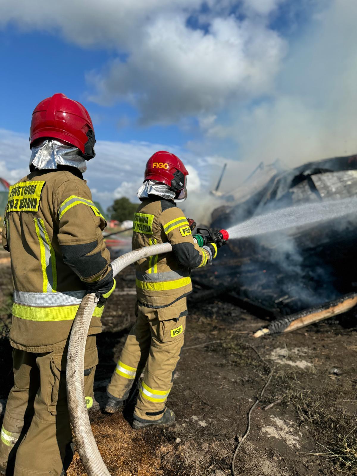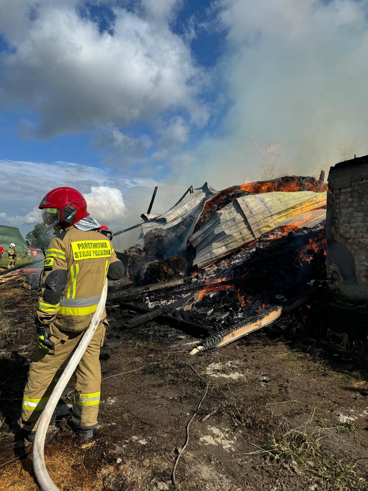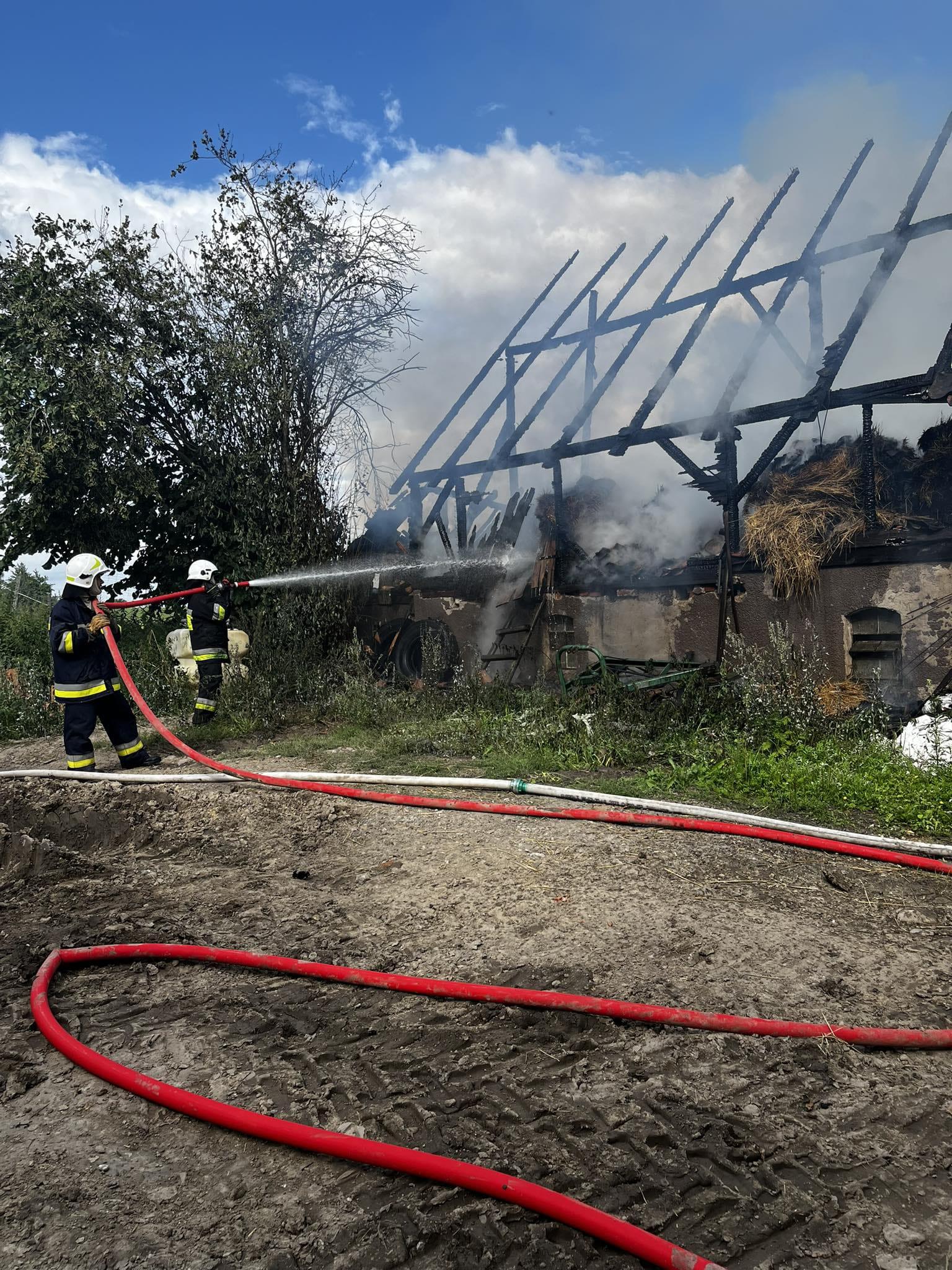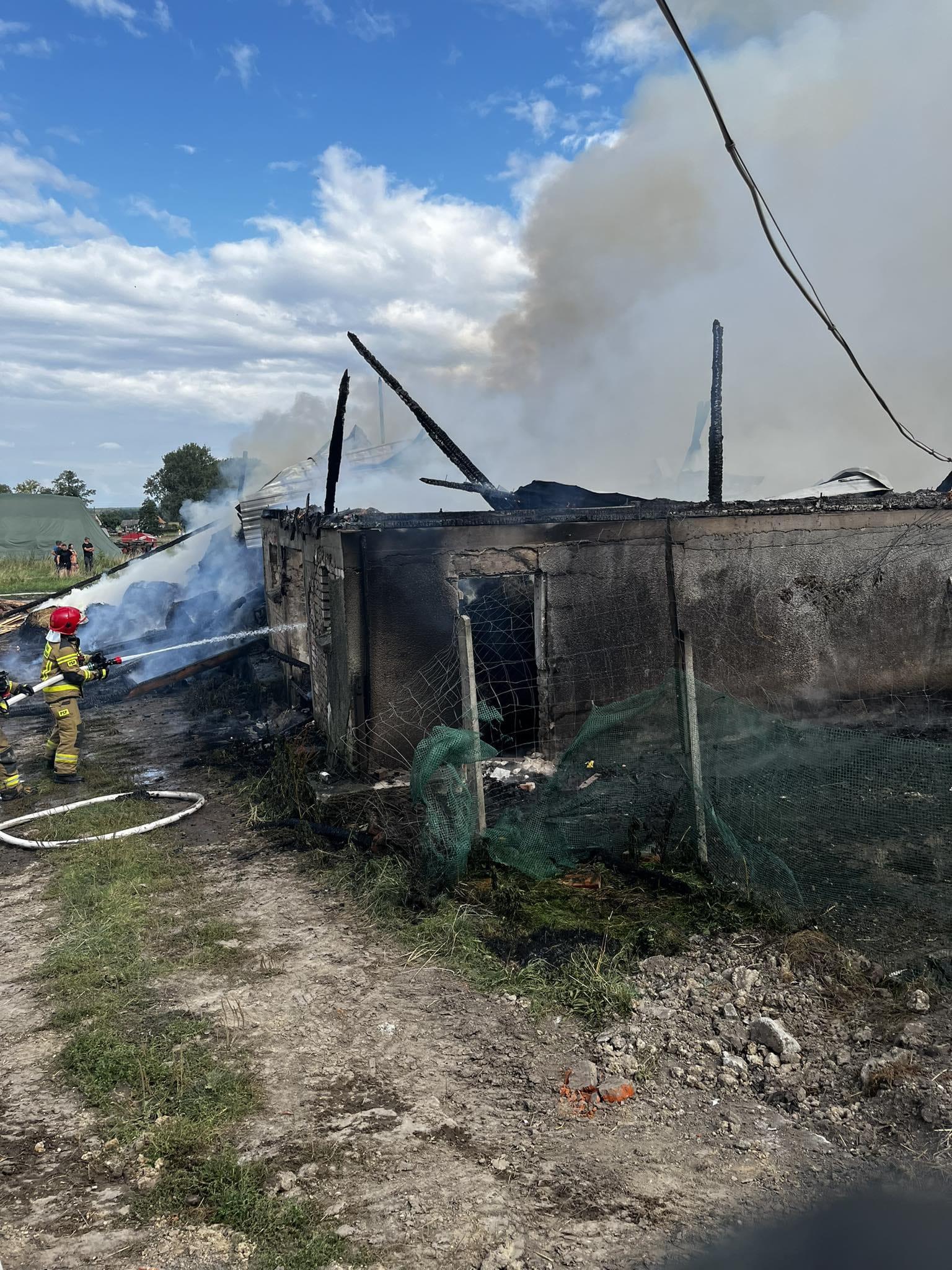 Na miejscu zdarzenia okazało się, że ogień objął całą stodołę oraz część obory, a budynki sąsiednie znajdujące się na terenie gospodarstwa były zagrożone rozprzestrzeniem się pożaru. Bydło znajdujące się w budynku obory zostało ewakuowane przez właścicieli gospodarstwa jeszcze przed przybyciem służb ratowniczych.