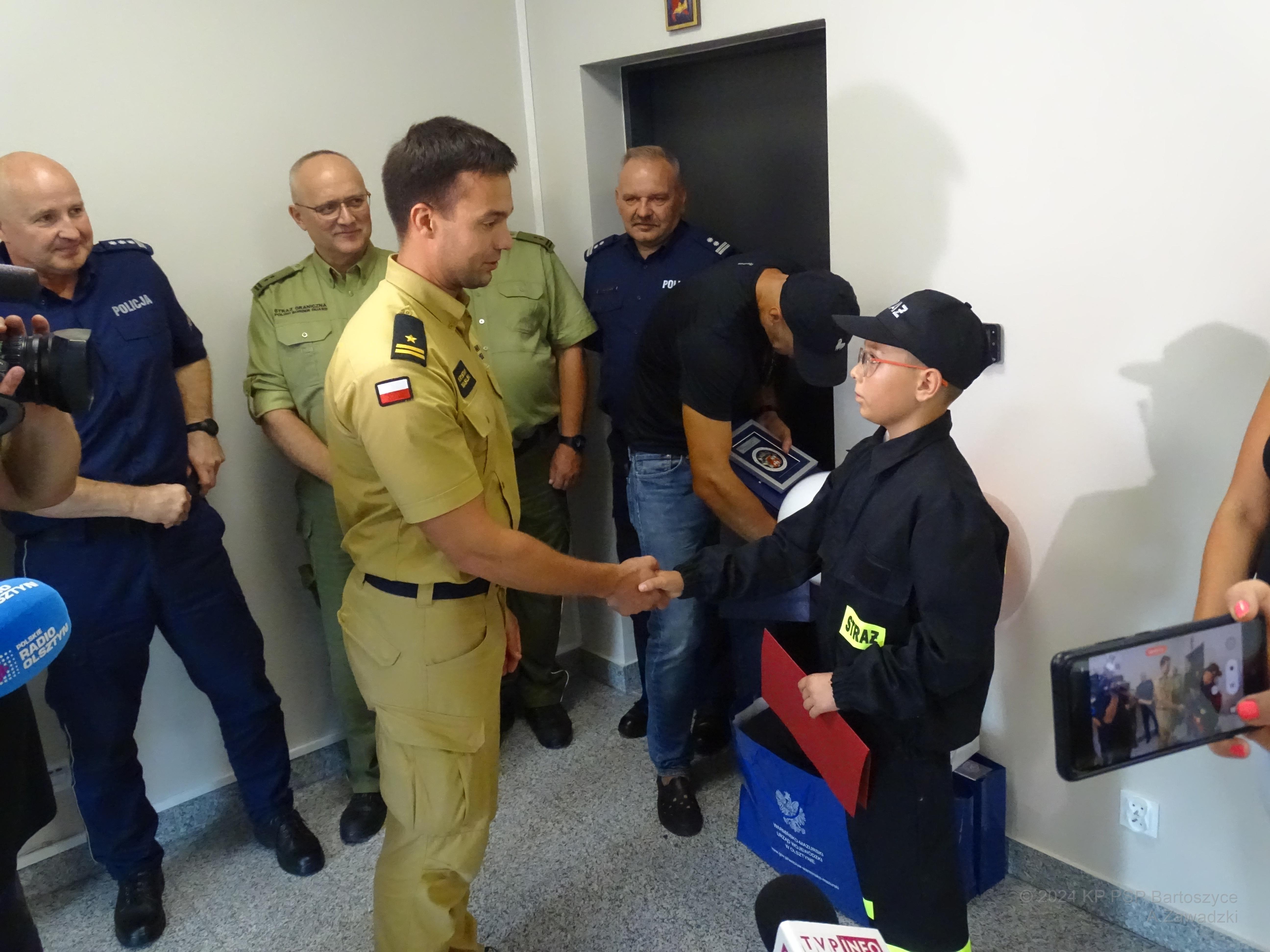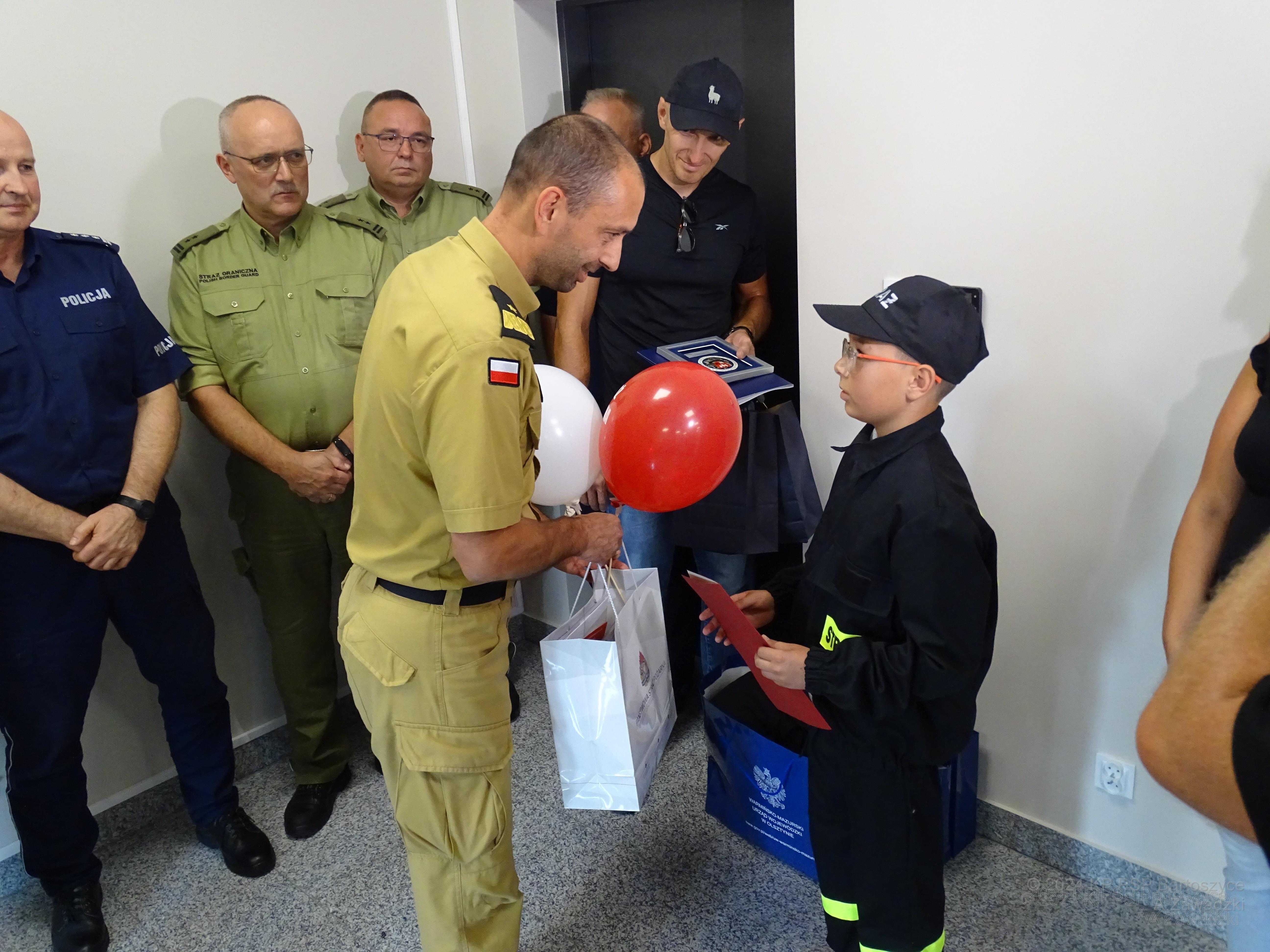 Zaproszeni gości skierowali wiele ciepłych słów w stronę Jakuba Kowalczyka i jego rodziców oraz wręczyli mu upominki. W swoim wystąpieniu Warmińsko-Mazurski Komendant Wojewódzki PSP nadbryg. Michał Kamieniecki pochwalił chłopca za jego postawę i spostrzegawczość, a także podkreślił, że odpowiednia współpraca między wszystkimi służbami, które dysponują różnym potencjałem sprzętowym jest podstawą do szybkiego i skutecznego niesienia pomocy poszkodowanym.