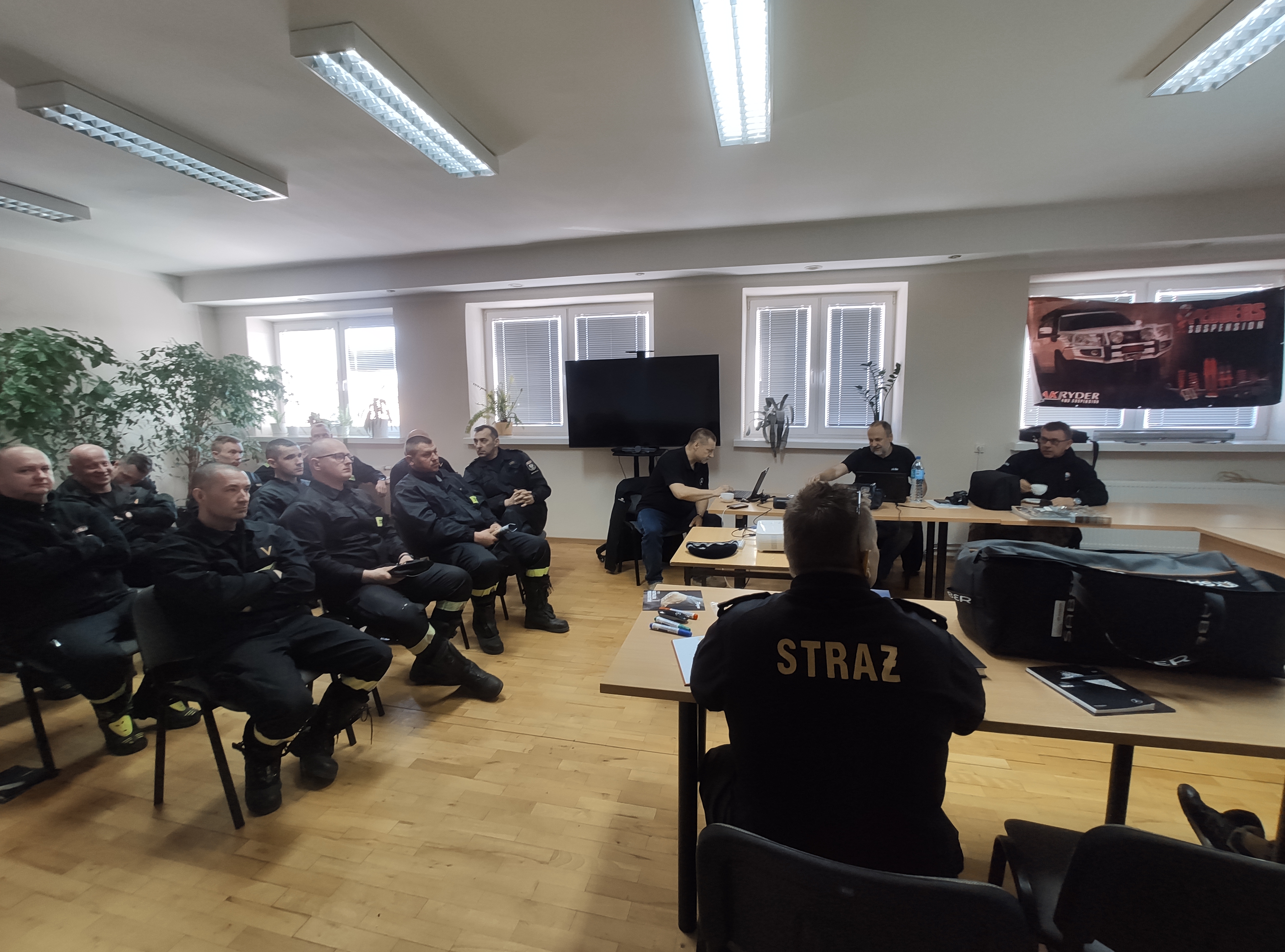 Szkolenie rozpoczęło się na sali wykładowej, gdzie omawiane były zasady bezpieczenej jazdy i ecodrivingu. Instruktorzy zaprezentowali działania najnowocześniejszych systemów wspomagających pracę kierowcy, poprawiających bezpieczeństwo oraz wpływających na ekonomię jazdy. Omówiono zasady bezpiecznego poruszania się pojazdami strażackimi, w których środek ciężkości umiejscowiony jest bardzo wysoko. Szczególną uwagę zwracano na bezpieczeństwo, z uwzględnieniem specyfiki jazdy pojazdem uprzywilejowanym. Zaprezentowano również nowoczesne zastosowania qada podczas działań służb, potwierdzając przydatność tego pojazdu w akcjach ratowniczych i gaśniczych.