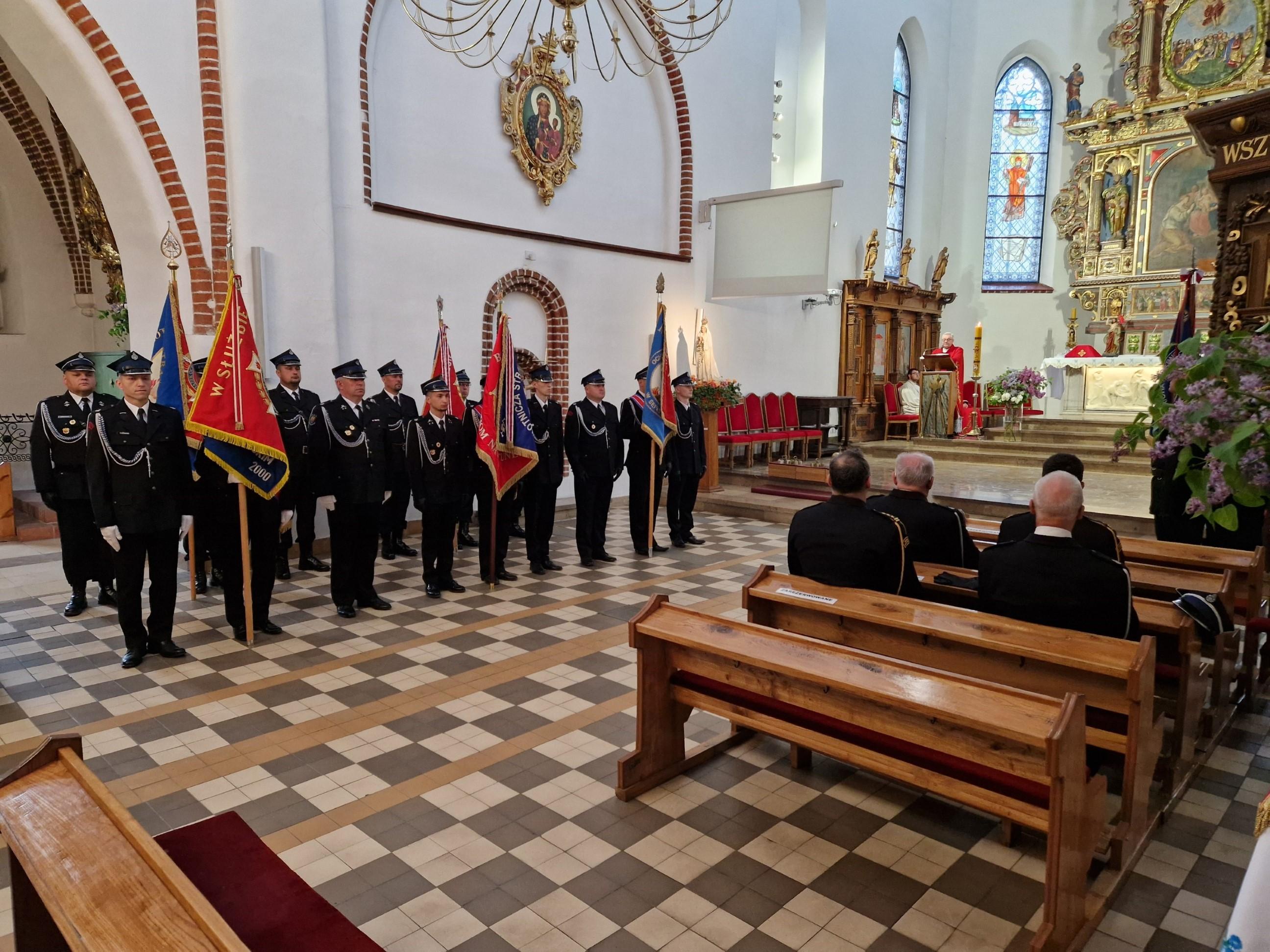 W liturgii udział wzięli strażacy PSP i OSP wraz ze sztandarami swoich jednostek, w tym: