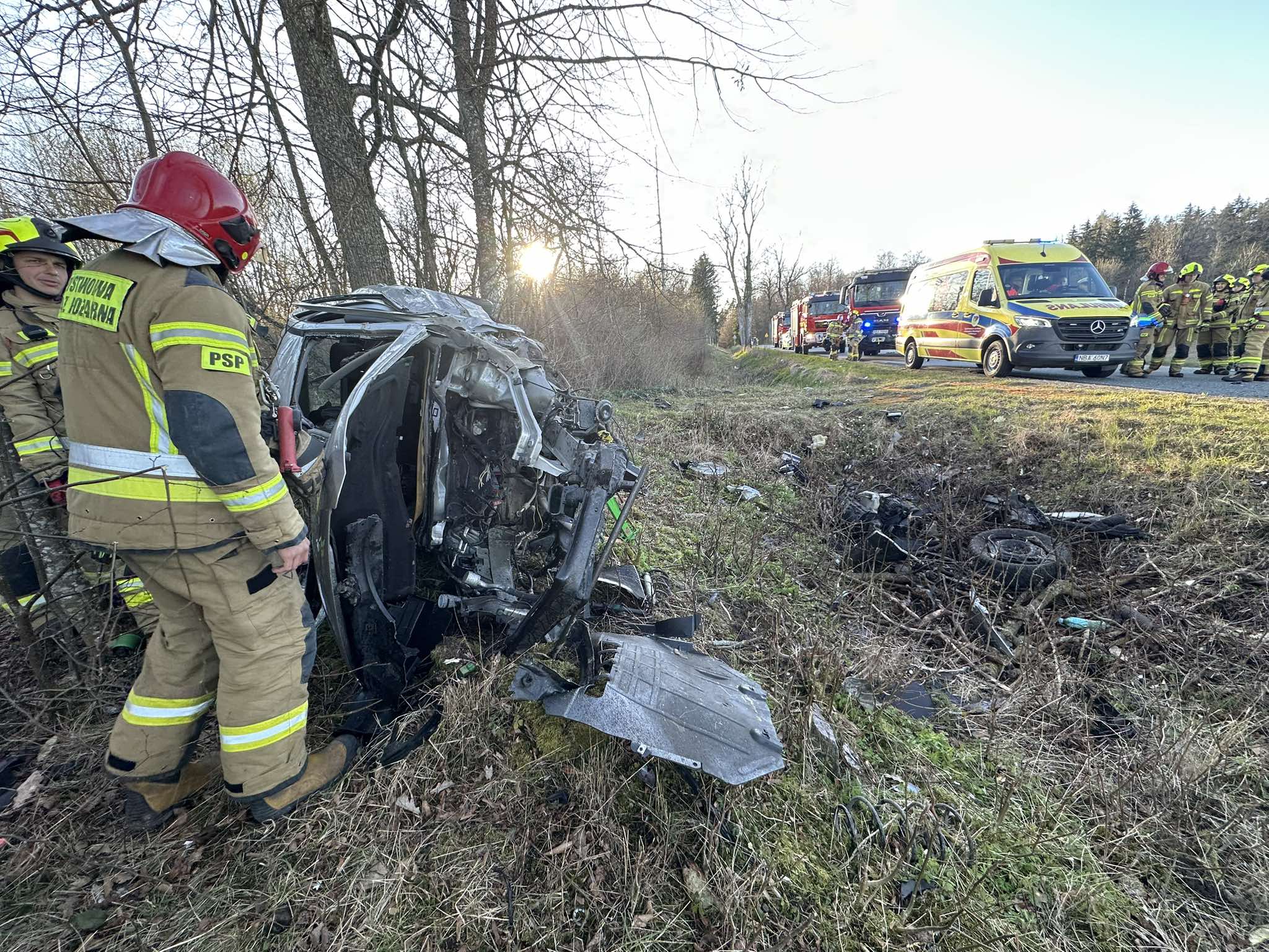 Po dotarciu na miejsce zdarzenia, strażacy zastali samochód osobowy leżący na boku poza pasem drogowym. Wewnątrz znajdował się kierowca – niestety, obecny na miejscu Zespół Ratownictwa Medycznego stwierdził zgon i odstąpił od czynności medycznych.