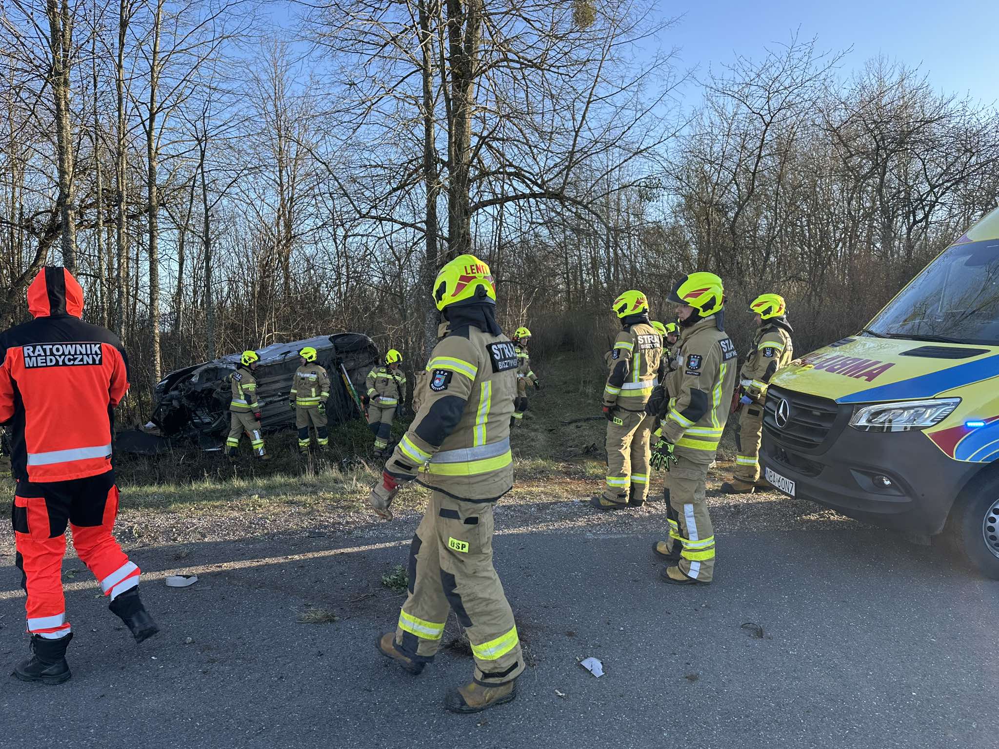 O godzinie 17:45 do Stanowiska Kierowania Komendanta Powiatowego PSP w Bartoszycach wpłynęło zgłoszenie o samochodzie osobowym znajdującym się na boku w przydrożnym rowie. Z informacji wynikało, że wewnątrz pojazdu znajduje się jedna osoba, zakleszczona i nieprzytomna, bez oznak życia.
