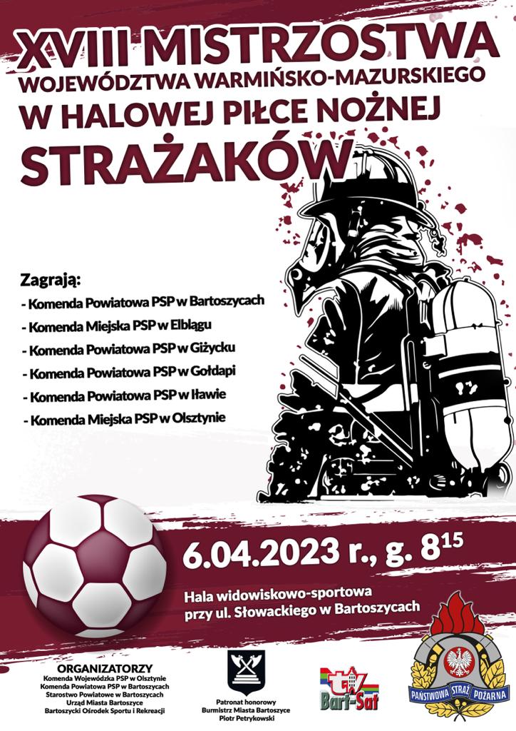 Zapraszamy na XVIII Mistrzostwa Województwa Warmińsko-Mazurskiego Strażaków w Halowej Piłce Nożnej, które odbędą się 6 kwietnia 2023 r. w hali widowisko-sportowej przy ul. Słowackiego w Bartoszycach.