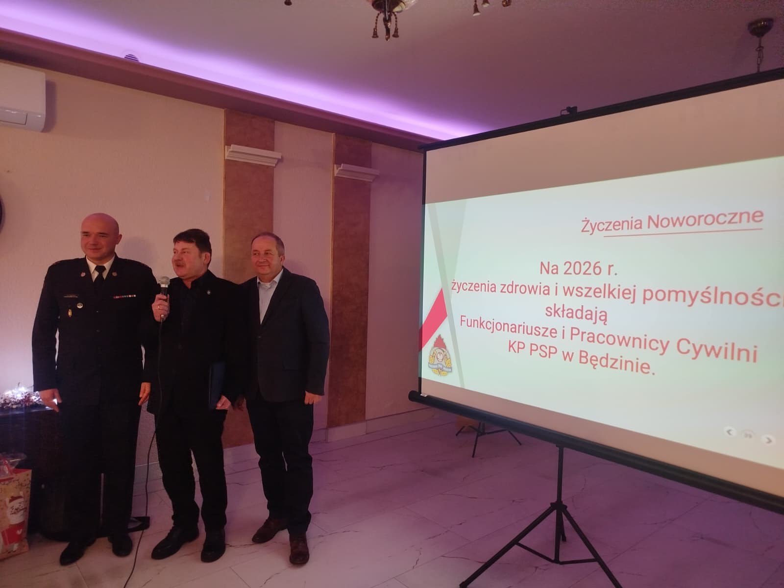 Następnie, wspólnie z Zarządem Koła Emerytów i Rencistów Pożarnictwa Rzeczypospolitej Polskiej – Koło nr 7 w Będzinie, złożył serdeczne życzenia zdrowia i pomyślności w Nowym 2026 roku, jednocześnie dziękując za wspólnie podejmowane inicjatywy na rzecz budowania i umacniania relacji.