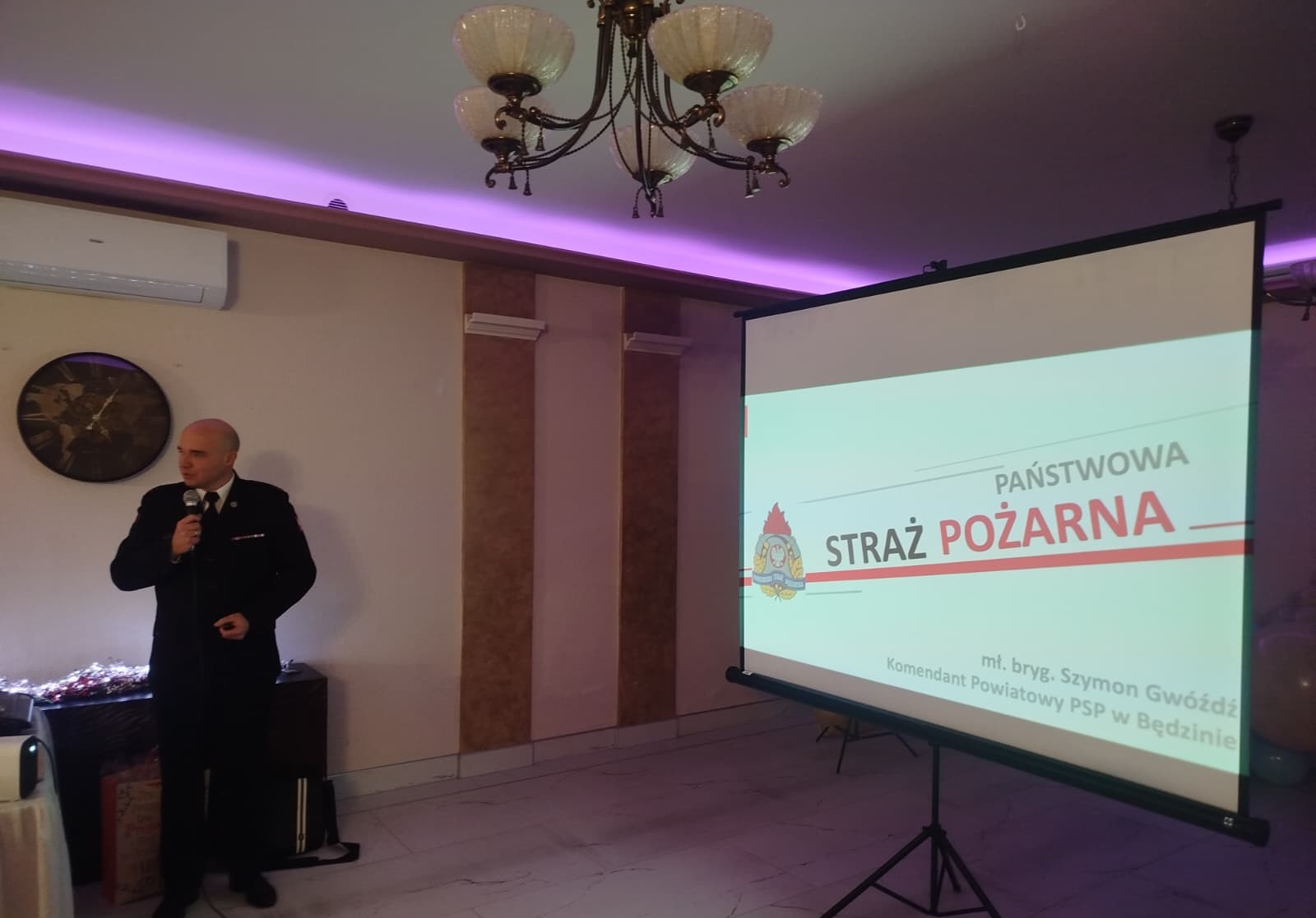 Komendant Powiatowy PSP w Będzinie, mł. bryg. Szymon Gwóźdź, tradycyjnie przedstawił prezentację podsumowującą działalność Komendy za rok ubiegły oraz zaprezentował plany na najbliższe lata.