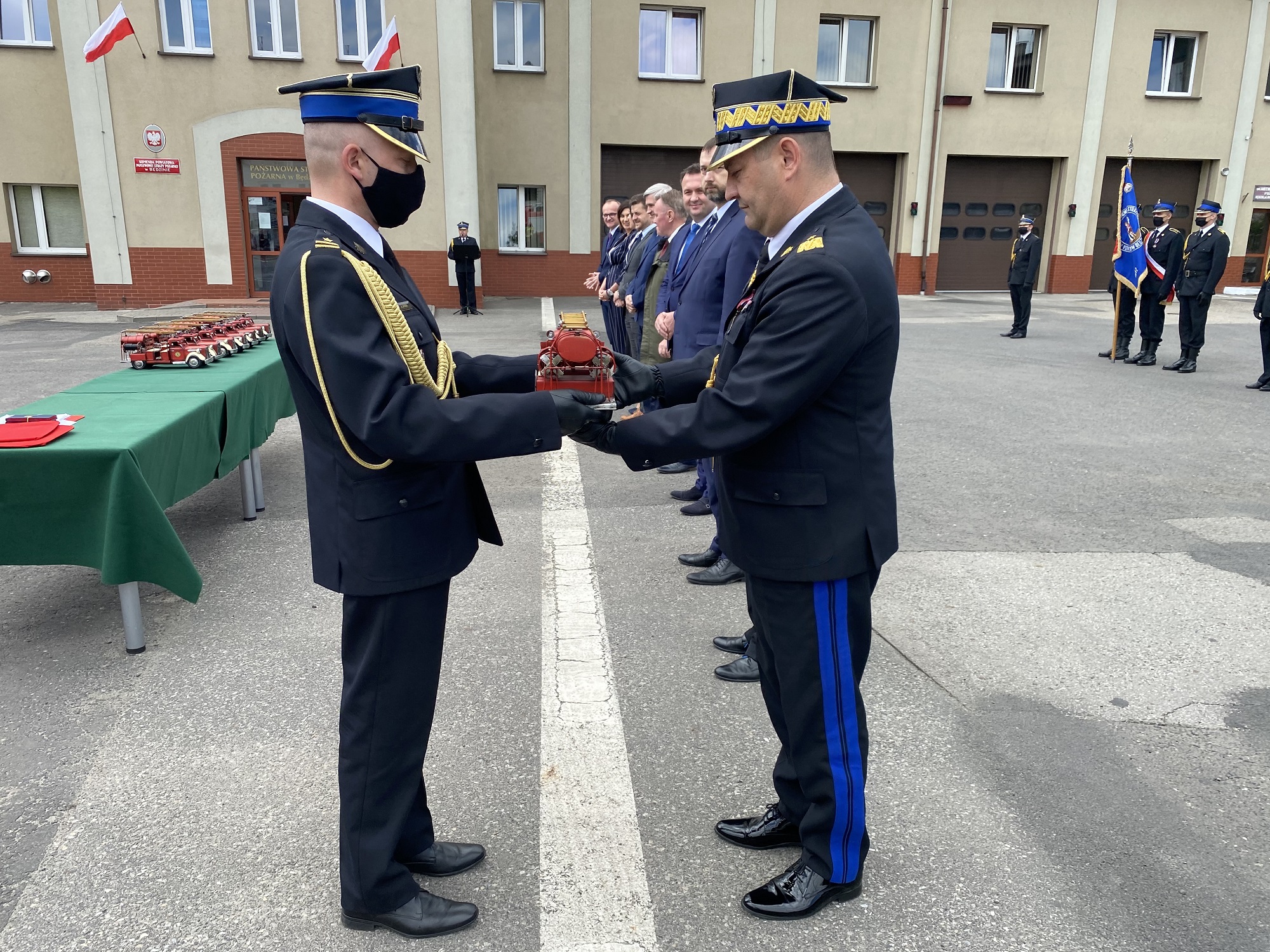 Podczas apelu wręczono awanse, odznaczenia oraz przekazano podziękowania funkcjonariuszom PSP. Wydarzenie było także okazją do podziękowania osobom, które przyczyniły się do wyposażenia będzińskiej Komendy w nowoczesna drabinę mechaniczną Iveco Magirus o długości 42 metrów.