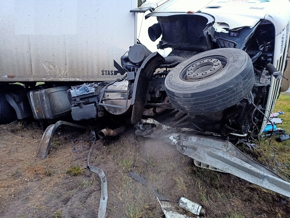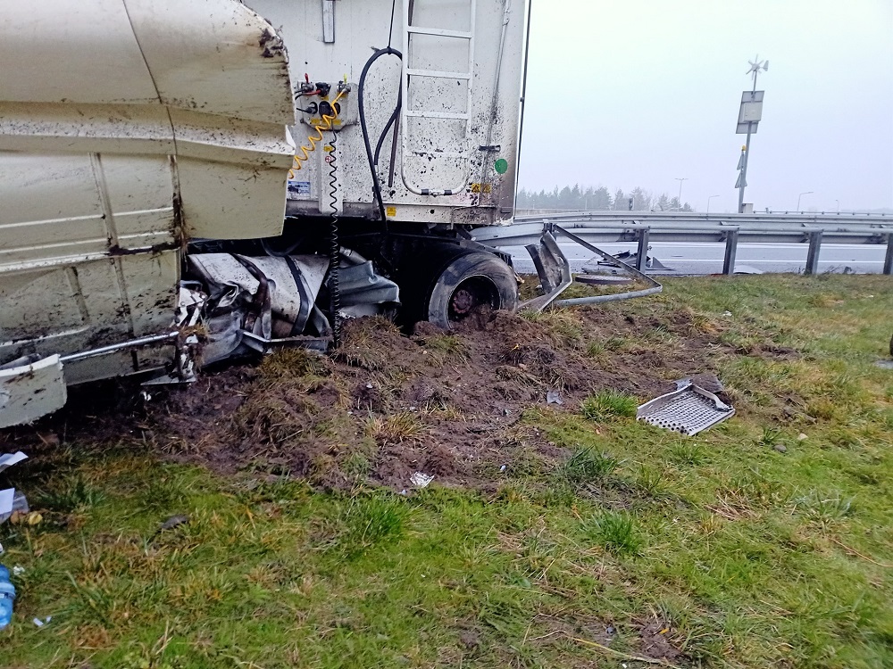 Stanowisko Kierowania przyjęło zgłoszenie z informacją o wypadku drogowym na S-1 (samochód ciężarowy przewrócił się na jezdnię, jedna osoba uwięziona w samochodzie osobowym).
