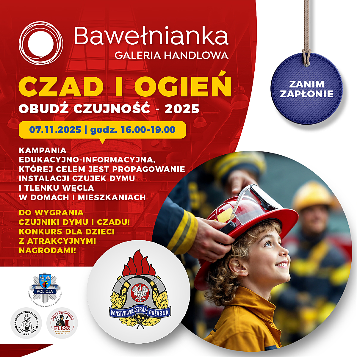 W okresie jesienno-zimowym, w naszym kraju w mieszkaniach i domach jednorodzinnych wzrasta ryzyko powstania pożarów. Najczęściej dochodzi do nich w wyniku wad, albo niewłaściwej eksploatacji urządzeń grzewczych na paliwo stałe, elektrycznych i gazowych. W tym samym okresie odnotowywany jest także wzrost liczby zatruć tlenkiem węgla, zwanym "cichym zabójcą", gdyż jest niewidoczny, nie ma smaku, ani zapachu. Czad i Ogień. Obudź Czujność”, to ogólnopolska kampania edukacyjno-informacyjna na temat zagrożeń związanych z możliwością powstania pożarów w mieszkaniach lub domach jednorodzinnych, oraz zatruciem tlenkiem węgla. Aby wzmóc czujność mieszkańców naszego powiatu Komenda Powiatowa PSP w Bełchatowie Organizuje festyn 7 listopada o godz. 16:00 w galerii handlowej „Bawełnianka” w Bełchatowie aby propagować bezpieczne zachowania i ustrzegać się niepotrzebnych zagrożeń. Celem głównym kampanii jest zmniejszenie liczby ofiar pożarów i zatruć tlenkiem węgla w mieszkaniach oraz domach jednorodzinnych. Celami szczegółowymi są: podniesienie poziomu wiedzy na temat: zagrożeń związanych z pożarem w mieszkaniach lub domach jednorodzinnych, zagrożeń związanych z emisją tlenku węgla, zapewnienia właściwej ewakuacji oraz sposobów powiadamiania służb ratowniczych. Istotnym jest uświadomienie odbiorcom kampanii korzyści, jakie niesie za sobą zamontowanie i właściwa eksploatacja czujek dymu i tlenku węgla w mieszkaniach lub domach jednorodzinnych. Ważne jest przypomnienie właścicielom i zarządcom budynków obowiązku okresowego dokonywania przeglądów i czyszczenie przewodów kominowych oraz sprawdzenie instalacji wentylacyjnej. Podczas festynu wspierały nas będą zaprzyjaźnione służby: Komenda Powiatowa Policji w Bełchatowie, Mistrz Kominiarstwa oraz Stowarzyszenie Przyjaciół Pływania w Bełchatowie.