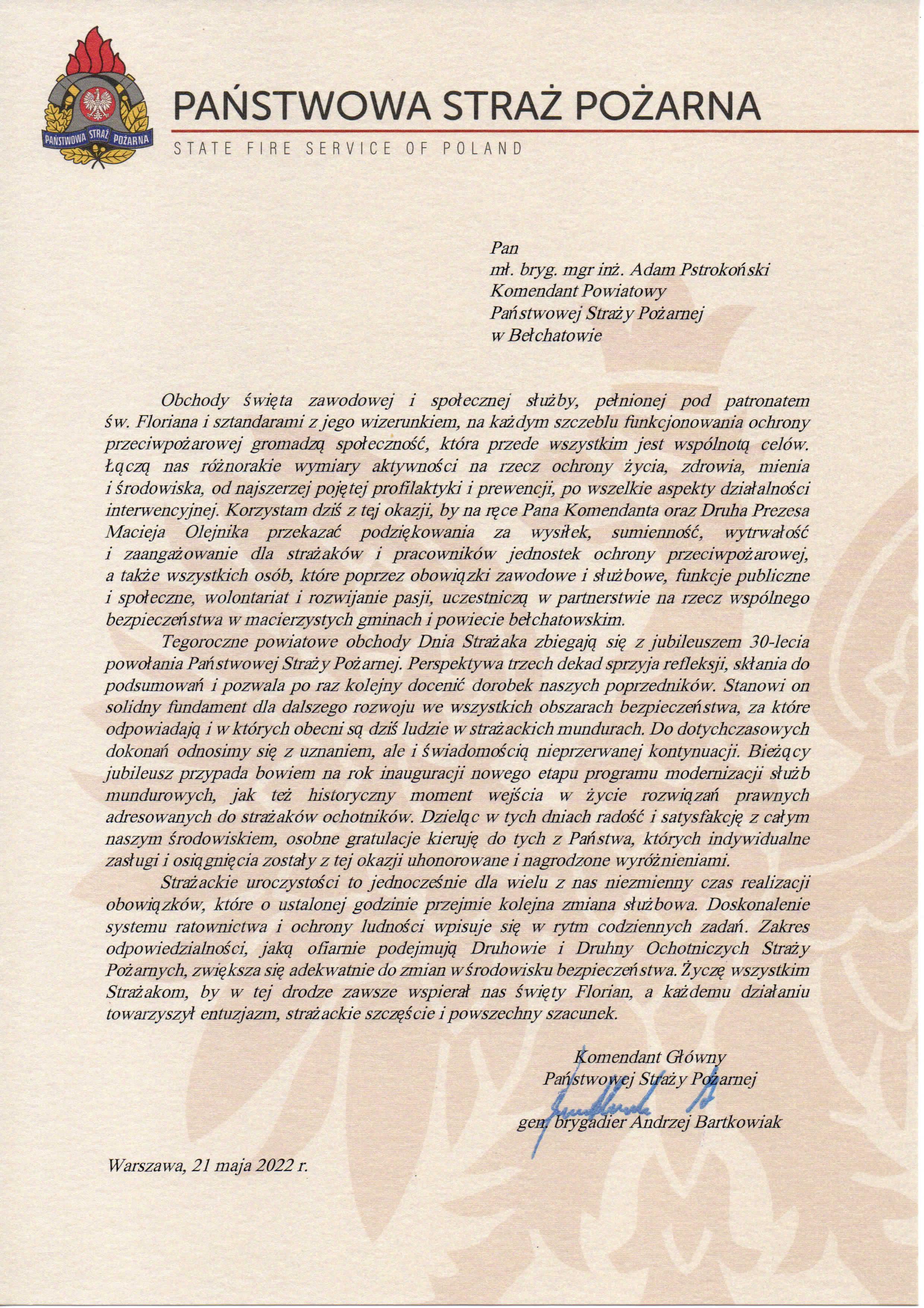W związku z obchodami Dnia Strażaka oraz jubileuszem 30-lecia powołania Państwowej Straży Pożarnej Komendant Powiatowy PSP w Bełchatowie otrzymał list od Komendanta Głównego PSP gen. brygadiera Andrzeja Bartkowiaka.