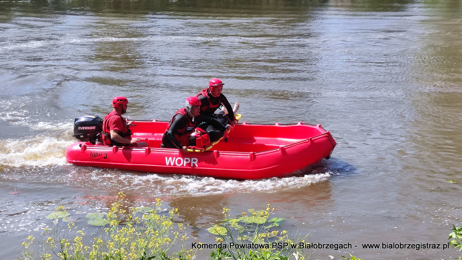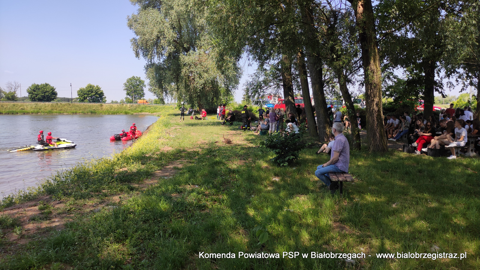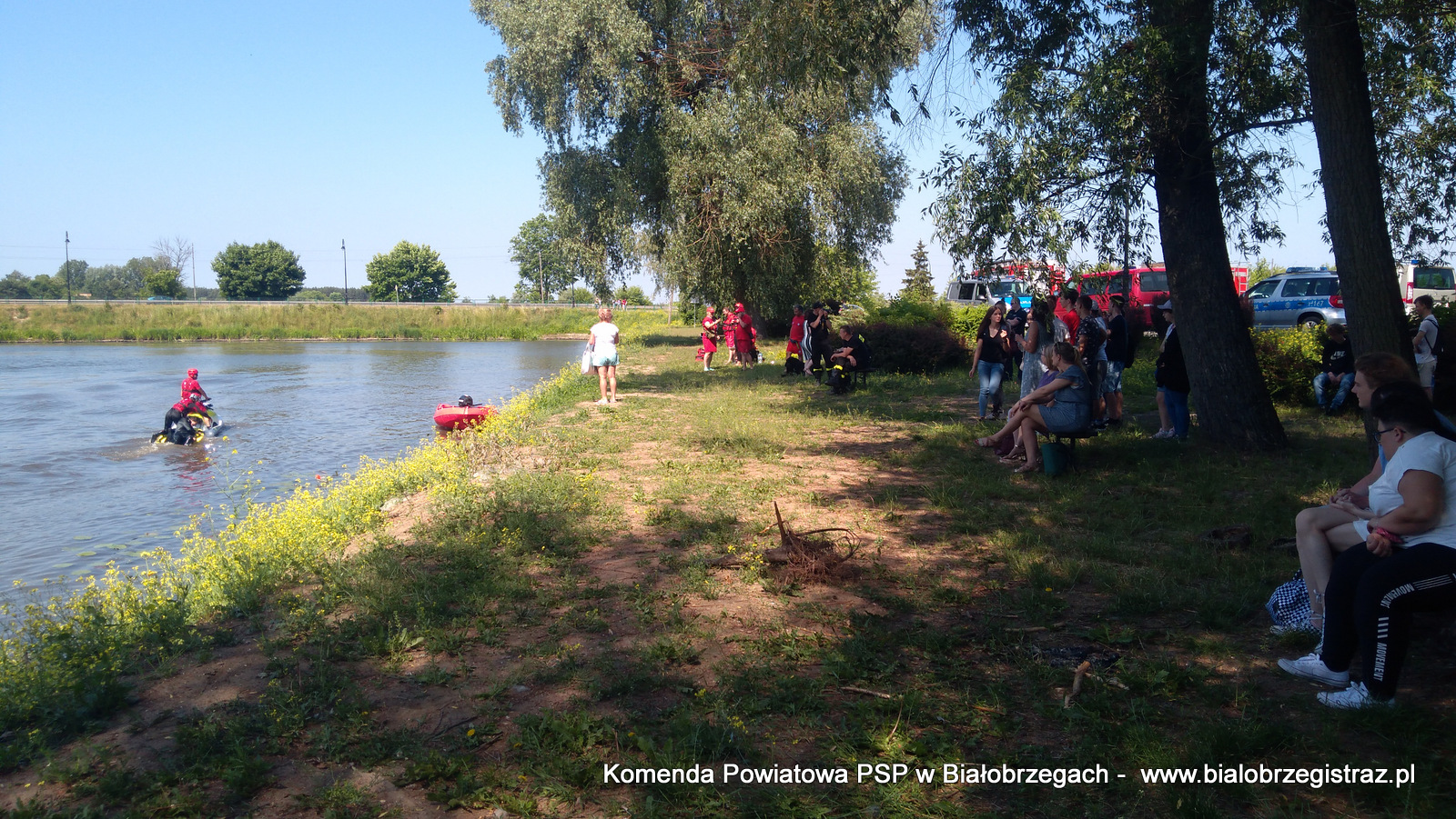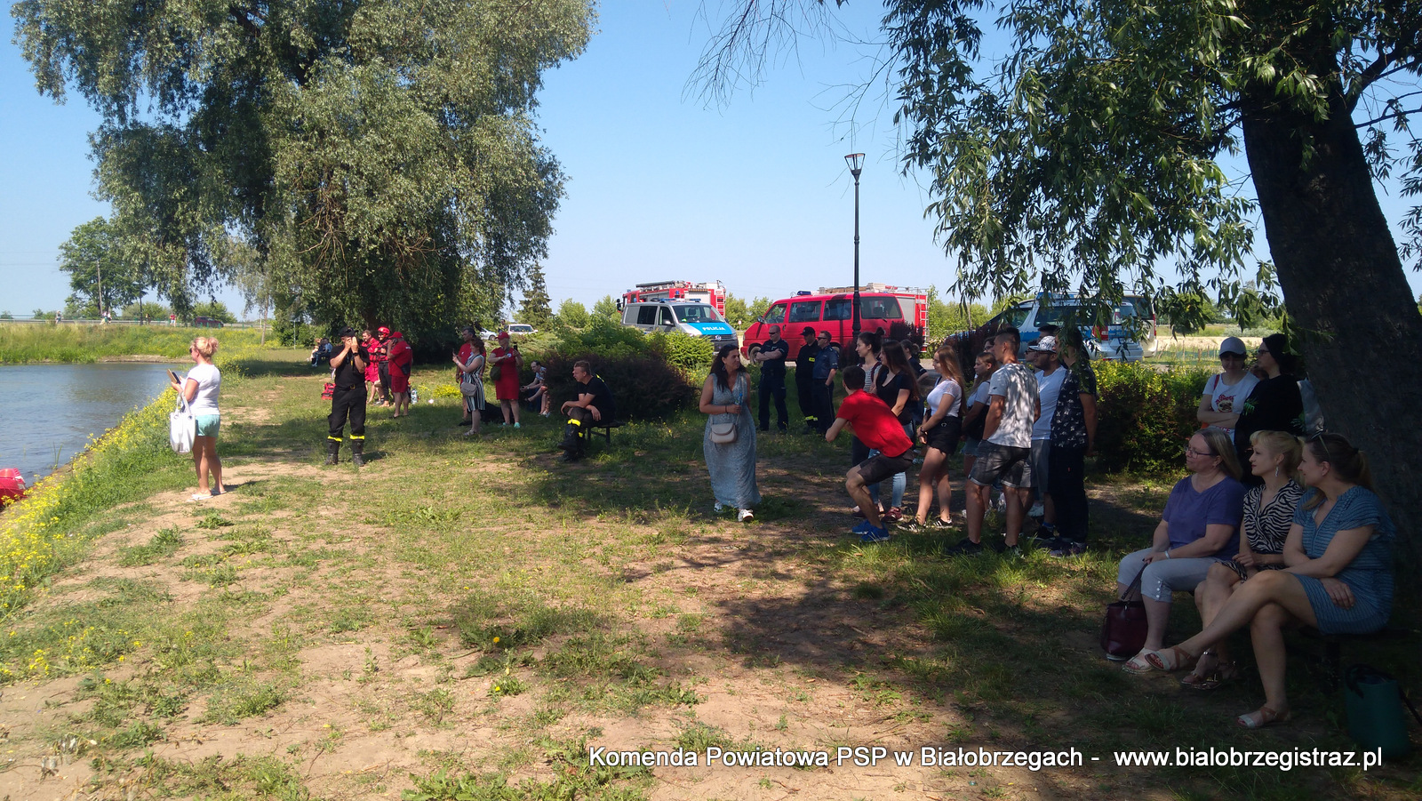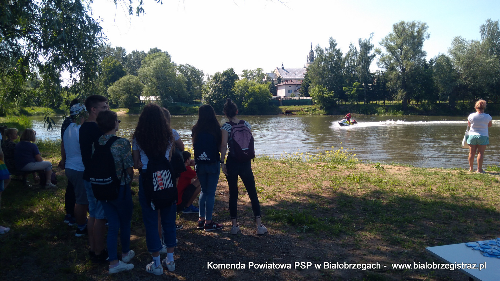o zagrożeniach, jakie pojawić się mogą podczas wypoczynku nad wodą. Uczniowie mogli obserwować pokazy ratownictwa wodnego w wykonaniu ratowników WOPR Białobrzegi oraz strażaków JRG Białobrzegi. W ramach ćwiczeń zrealizowano kilka scenariuszy: m.in. podejmowanie z wody poszkodowanego nieprzytomnego przy pomocy skutera wodnego i deski, podejmowanie z wody przytomnego przy pomocy łodzi motorowej. Ponadto