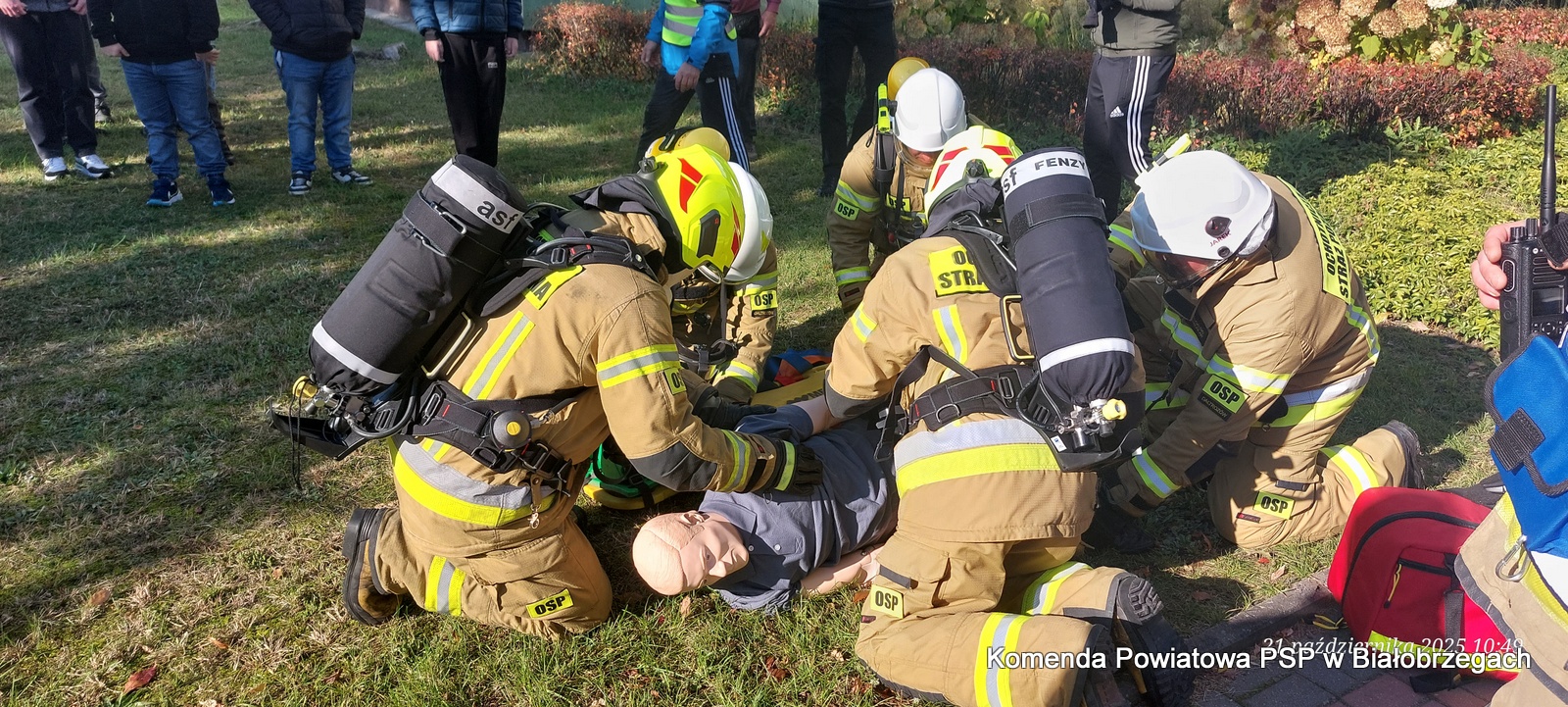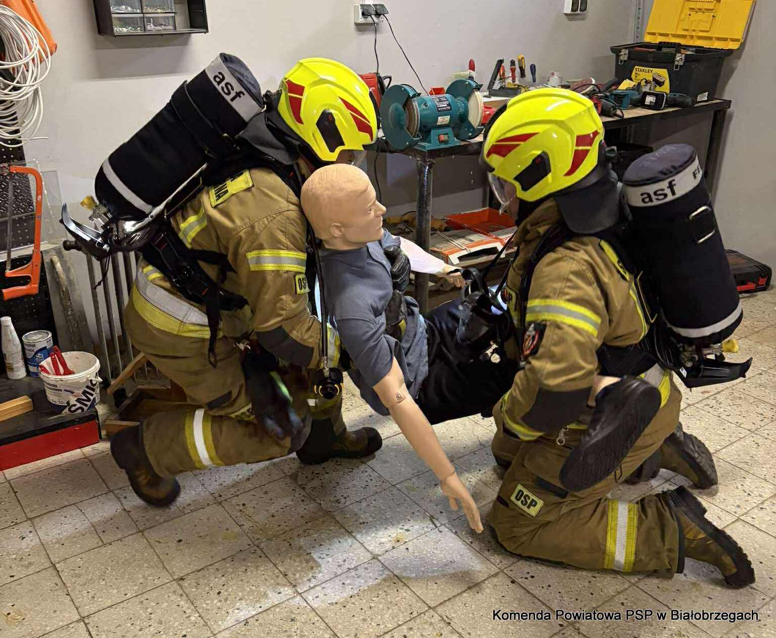 Scenariusz ćwiczeń zakładał, że doszło do pożaru w warsztacie szkolnym, na skutek intensywnego zadymienia, jedna osoba została odcięta i nie mogła samodzielnie opuścić zagrożonego terenu.