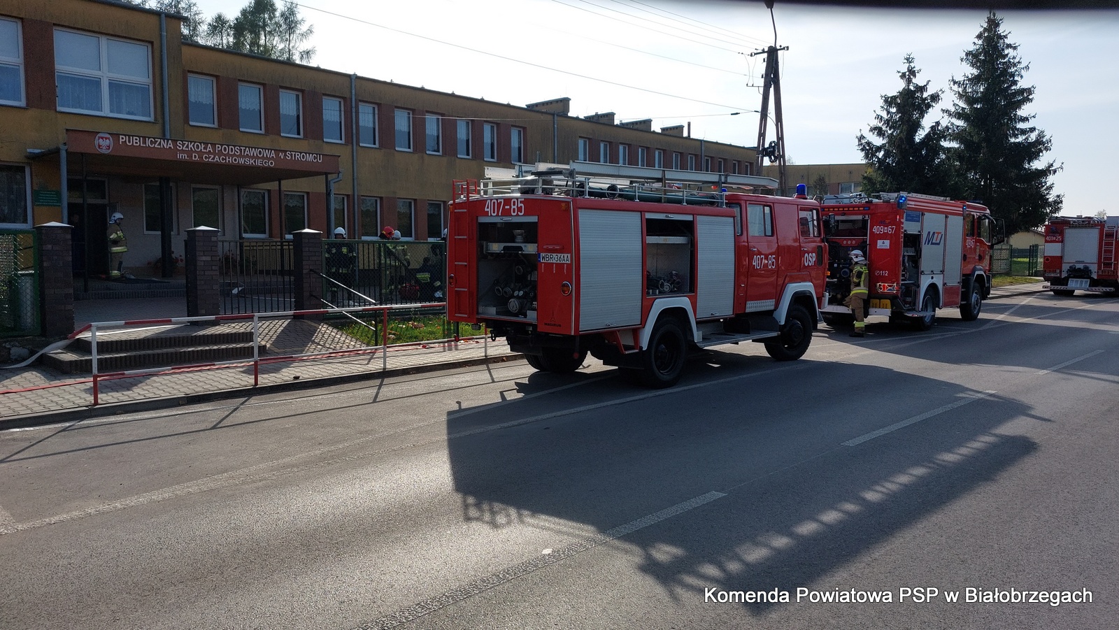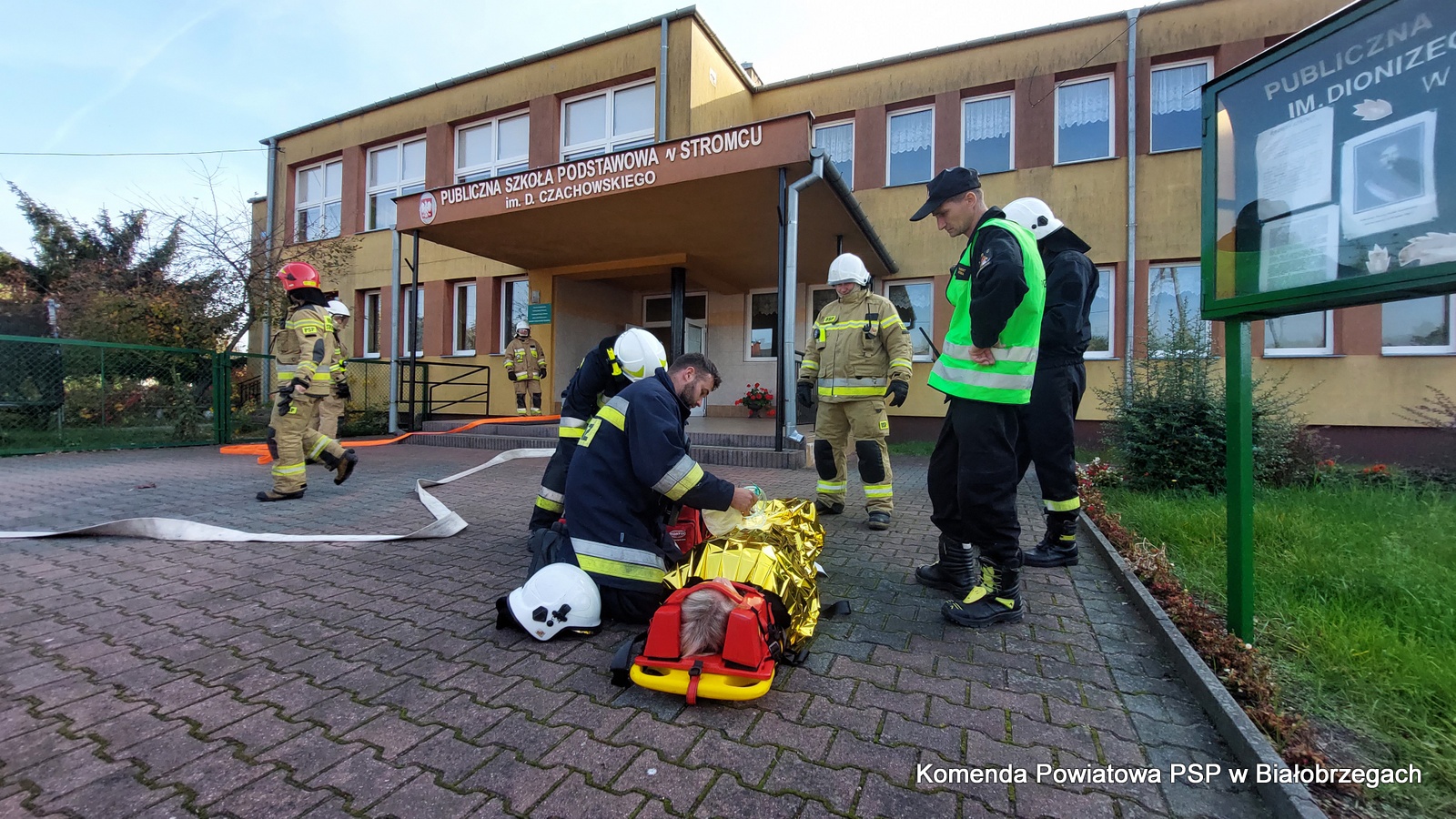 W dniu 17 października 2022r. w Publicznej Szkole Podstawowej im. Dionizego Czachowskiego w Stromcu odbyły się ćwiczenia na obiekcie wraz z praktycznym sprawdzeniem organizacji i warunków ewakuacji uczniów i personelu. Woźna szkoły po zauważeniu pożaru w pomieszczeniu gospodarczym uruchomiła dzwonek celem zaalarmowania oraz poinformowania wszystkich uczniów o konieczności szybkiego opuszczenia budynku. Dyrektor szkoły podjął decyzję o ewakuacji i powiadomił odpowiednie służby. Stanowisko Kierowania Komendanta Powiatowego PSP w Białobrzegach zadysponowało na miejsce 7 zastępów straży pożarnej: Jednostkę Ratowniczo-Gaśniczą w Białobrzegach, OSP Stromiec KSRG, OSP Boże KSRG, OSP Dobieszyn KSRG, OSP Podlesie Małe oraz OSP Boska Wola.