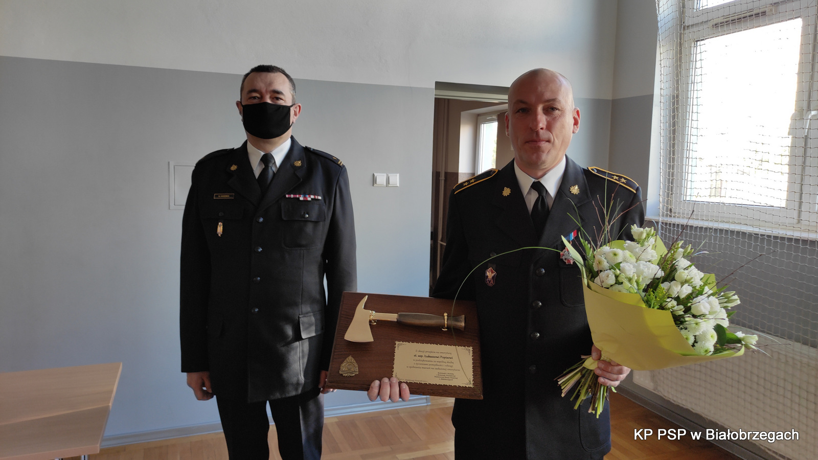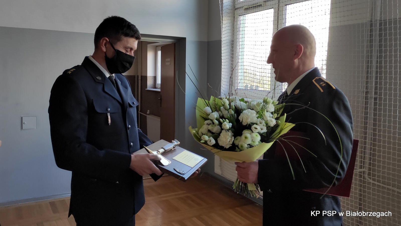 Zbiórkę rozpoczął Komendant Powiatowy PSP w Białobrzegach od przybliżenia przebiegu kariery funkcjonariusza. Komendant Powiatowy PSP mł. bryg. Grzegorz Gozdek podziękował za nienaganną służbę i zaangażowanie w realizację obowiązków służbowych.