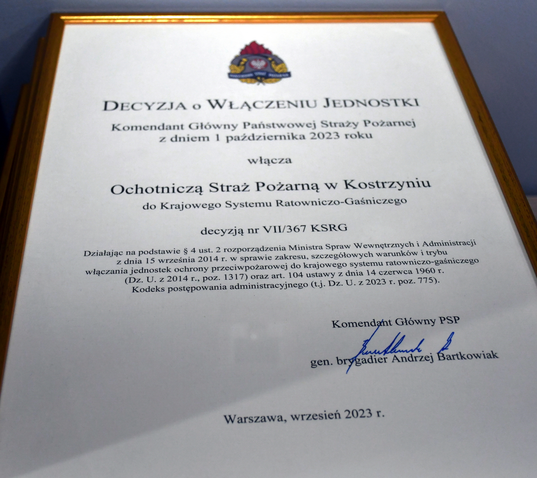 Uroczyste wręczenie aktu włączenia OSP Kostrzyn do Krajowego Systemu Ratowniczo-Gaśniczego