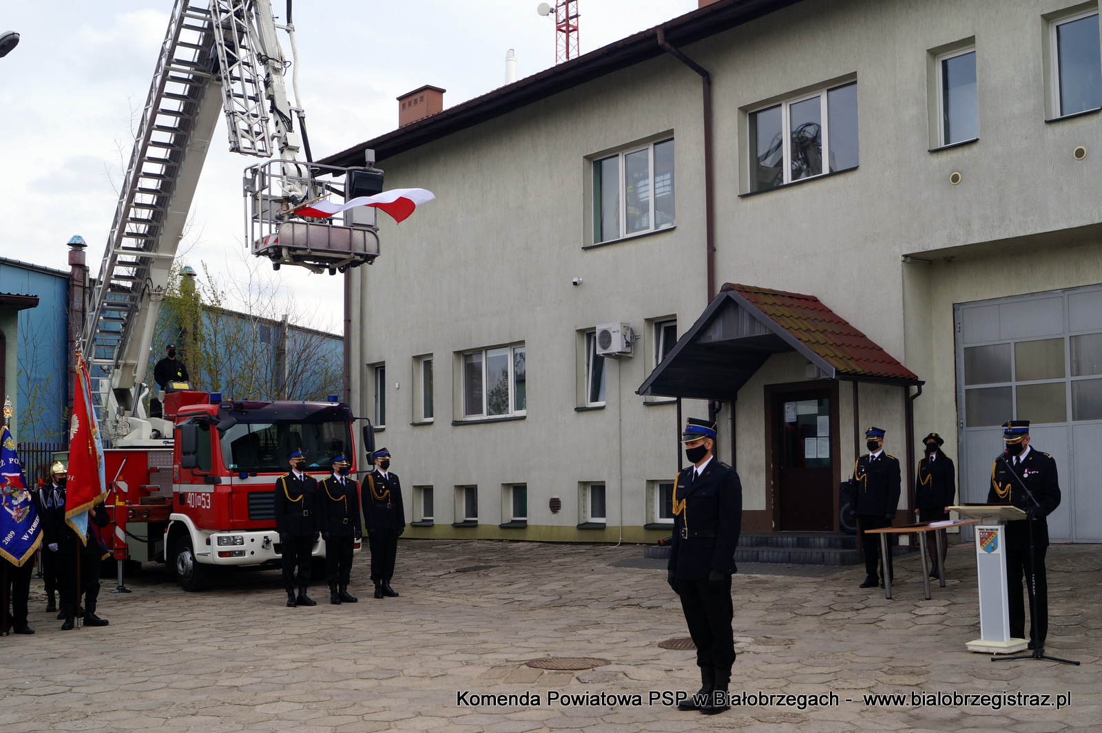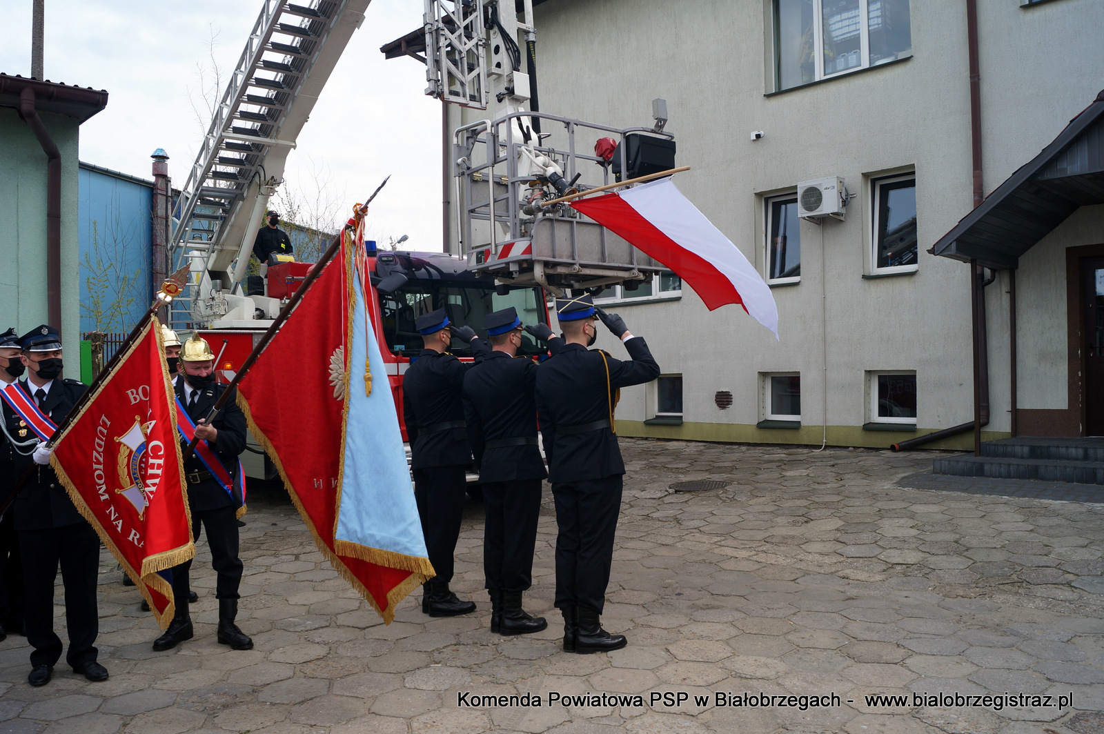 Uroczystość rozpoczęła się złożeniem meldunku komendantowi powiatowemu PSP bryg. Grzegorzowi Gozdkowi. Następnie podniesiono flagę państwową oraz odegrano hymn narodowy.